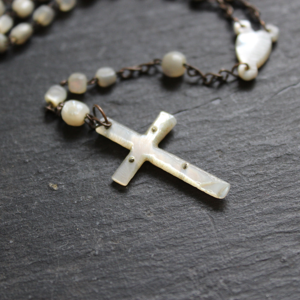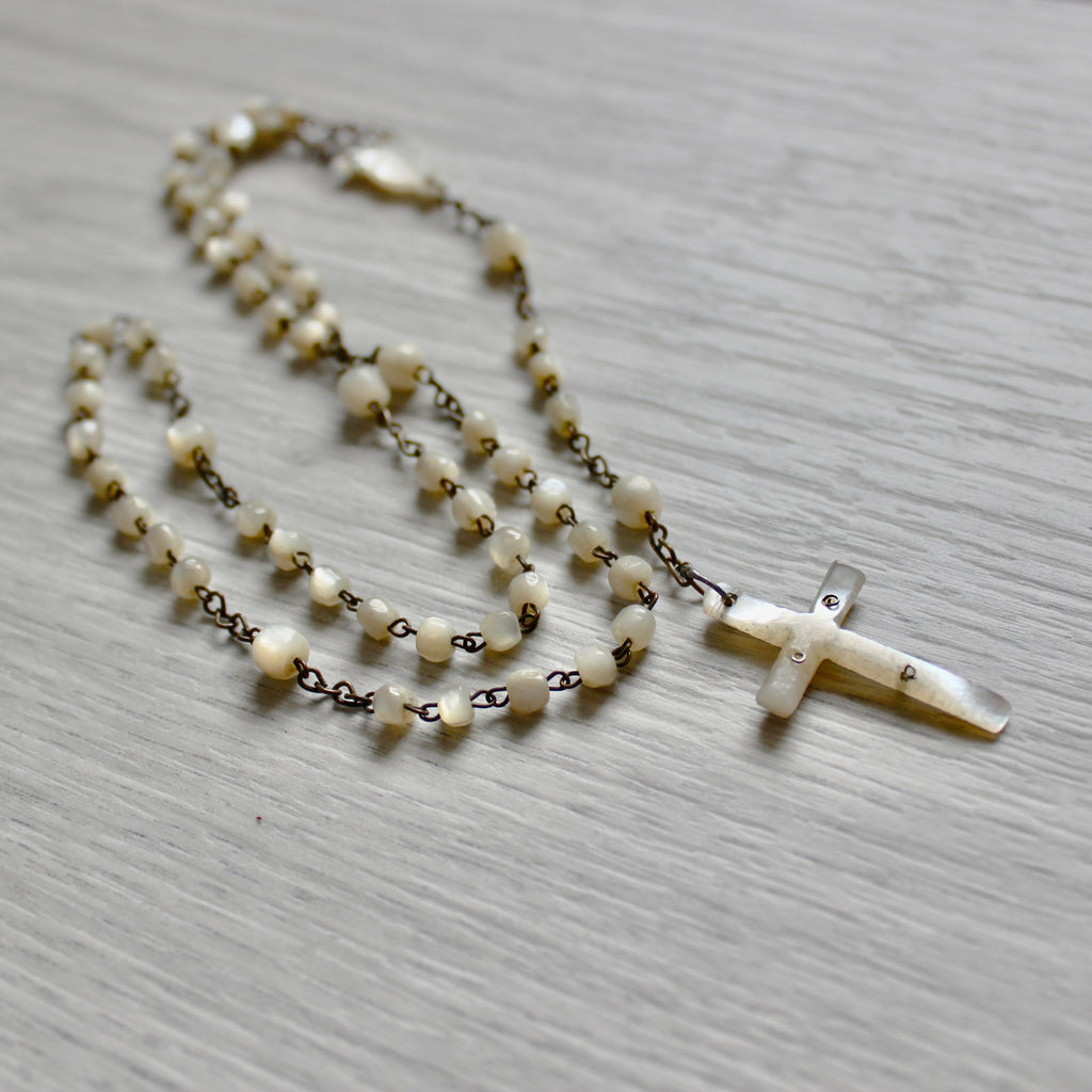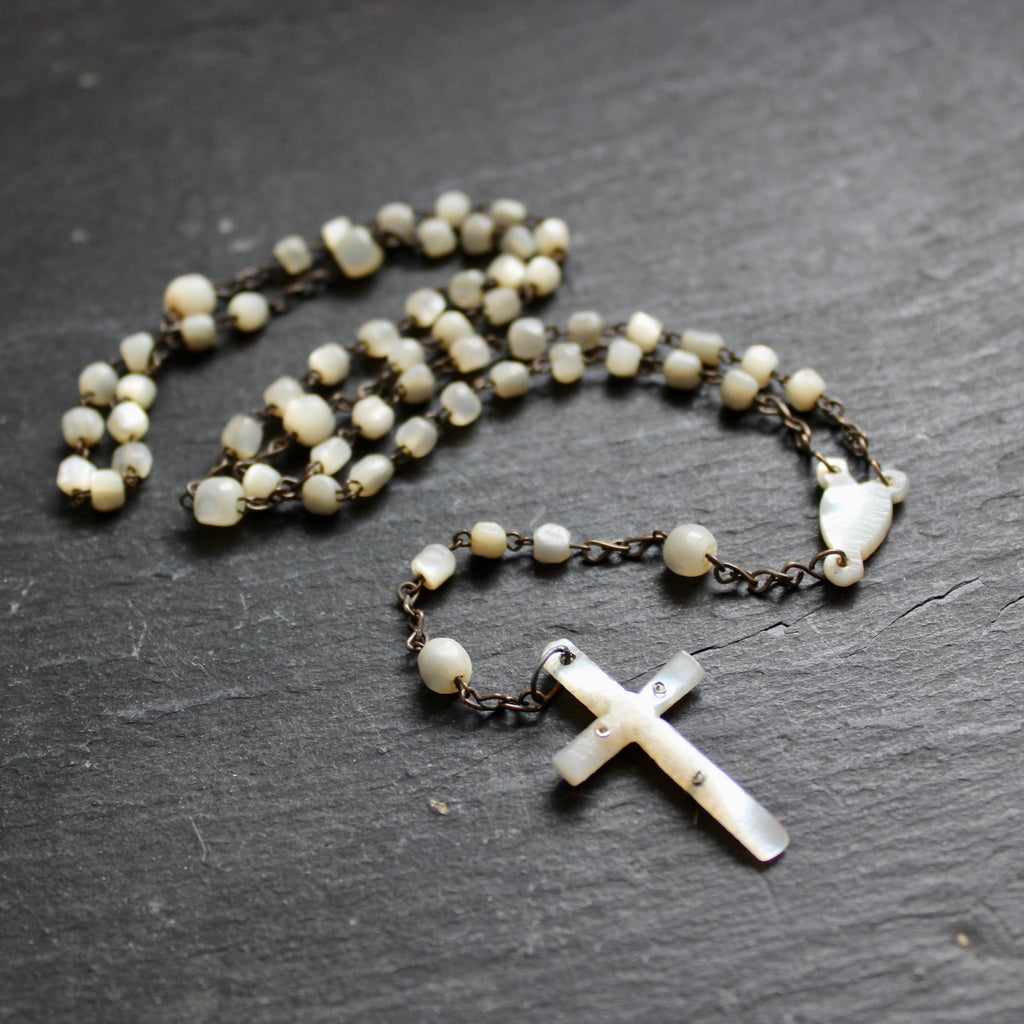 A lovely vintage child's rosary made of tiny mother of pearl beads. The mother of pearl connector and cross make this piece really special.