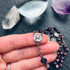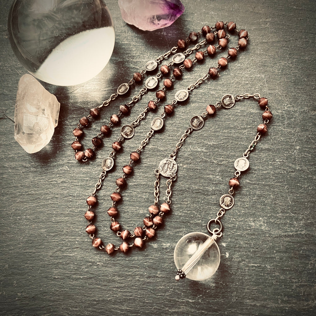 A refurbished vintage rosary fragment is transformed into a divination tool with a beautiful crystal sphere made of genuine rock crystal hanging from it.