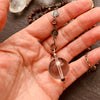 This necklace was inspired by the crystal ball talismans found buried with Viking völvas or seeresses. Some say crystals can feel and behave like living beings. If this is the case, then this one is quite whimsical. It liked to circle around while I photographed it, holding sill only after a bit of coaxing. It is a beautiful stone and feels very vibrant in the hand.