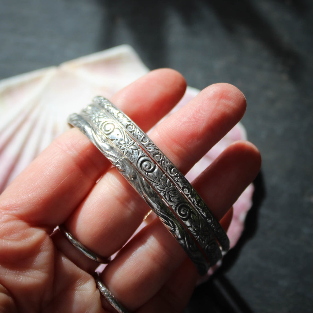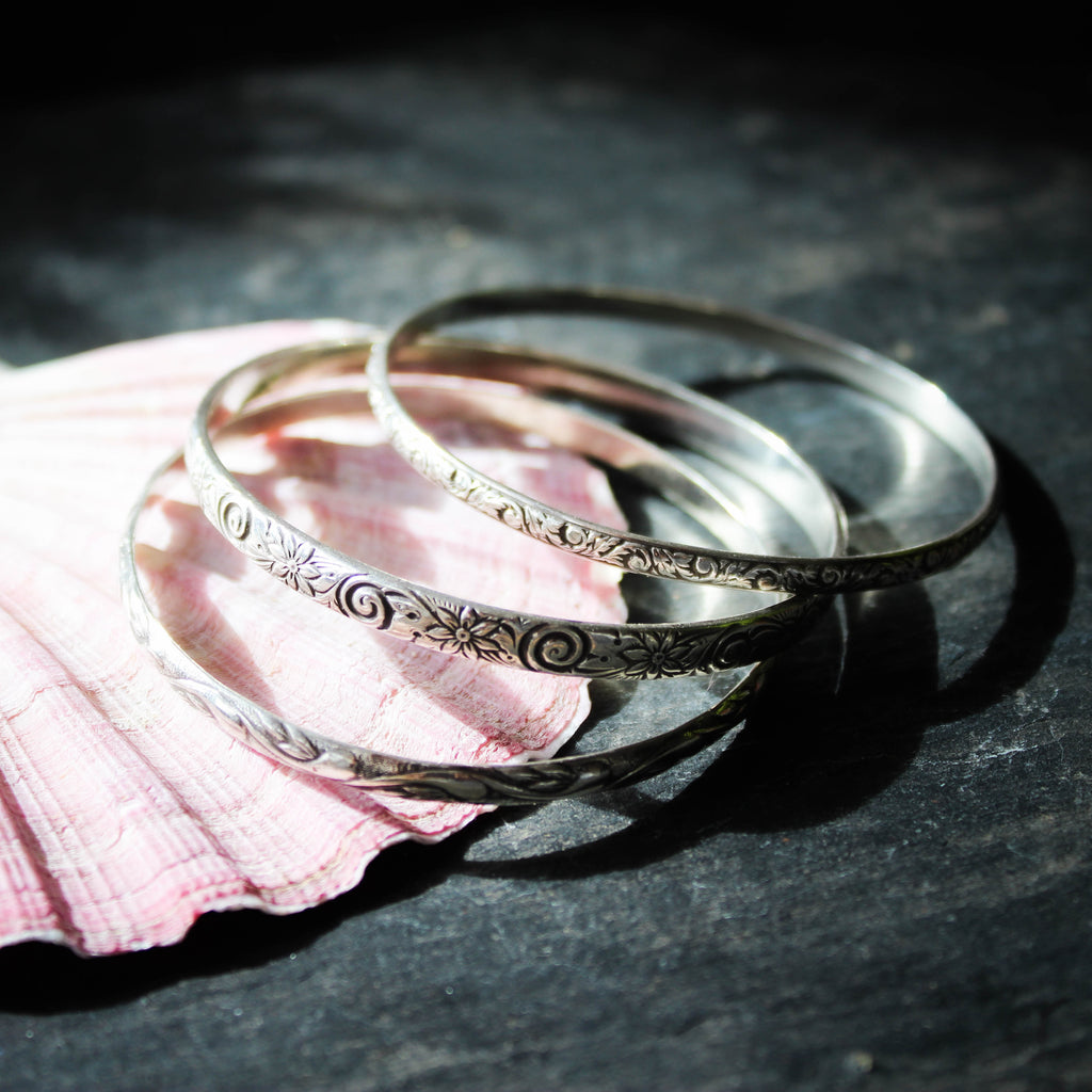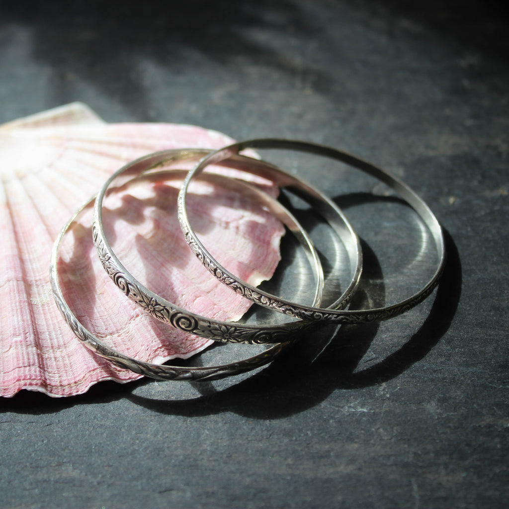 A trio of beautifully patterned sterling silver bangles in a small-medium size