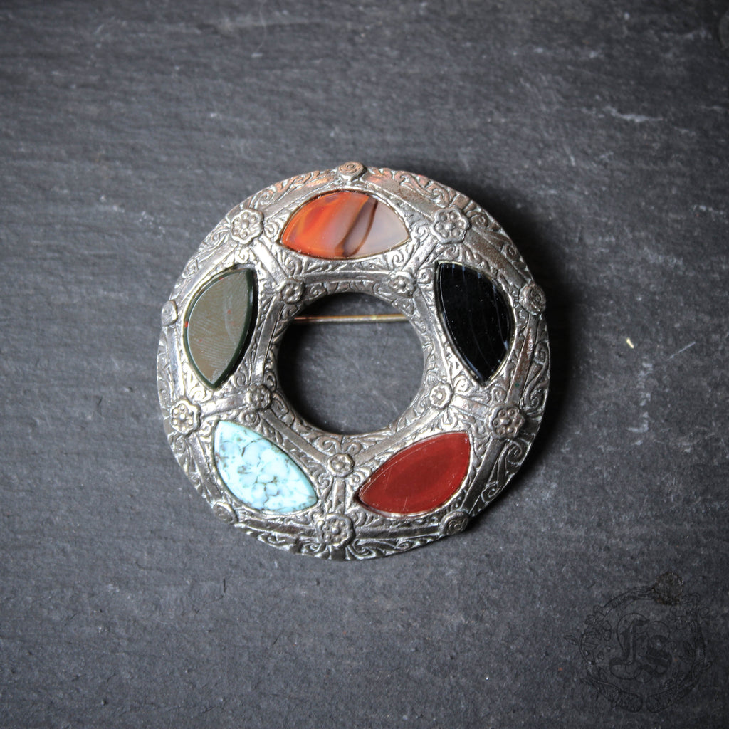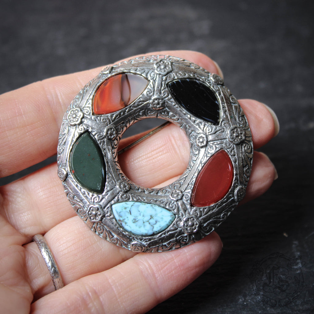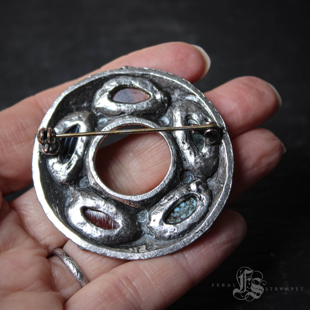 A bold Arts and Crafts inspired pin with glass cabochons resembling Scottish agate, onyx, turquoise and carnelian in the Miracle style.