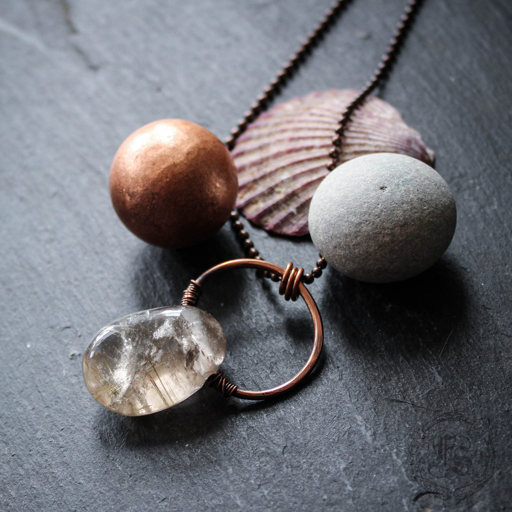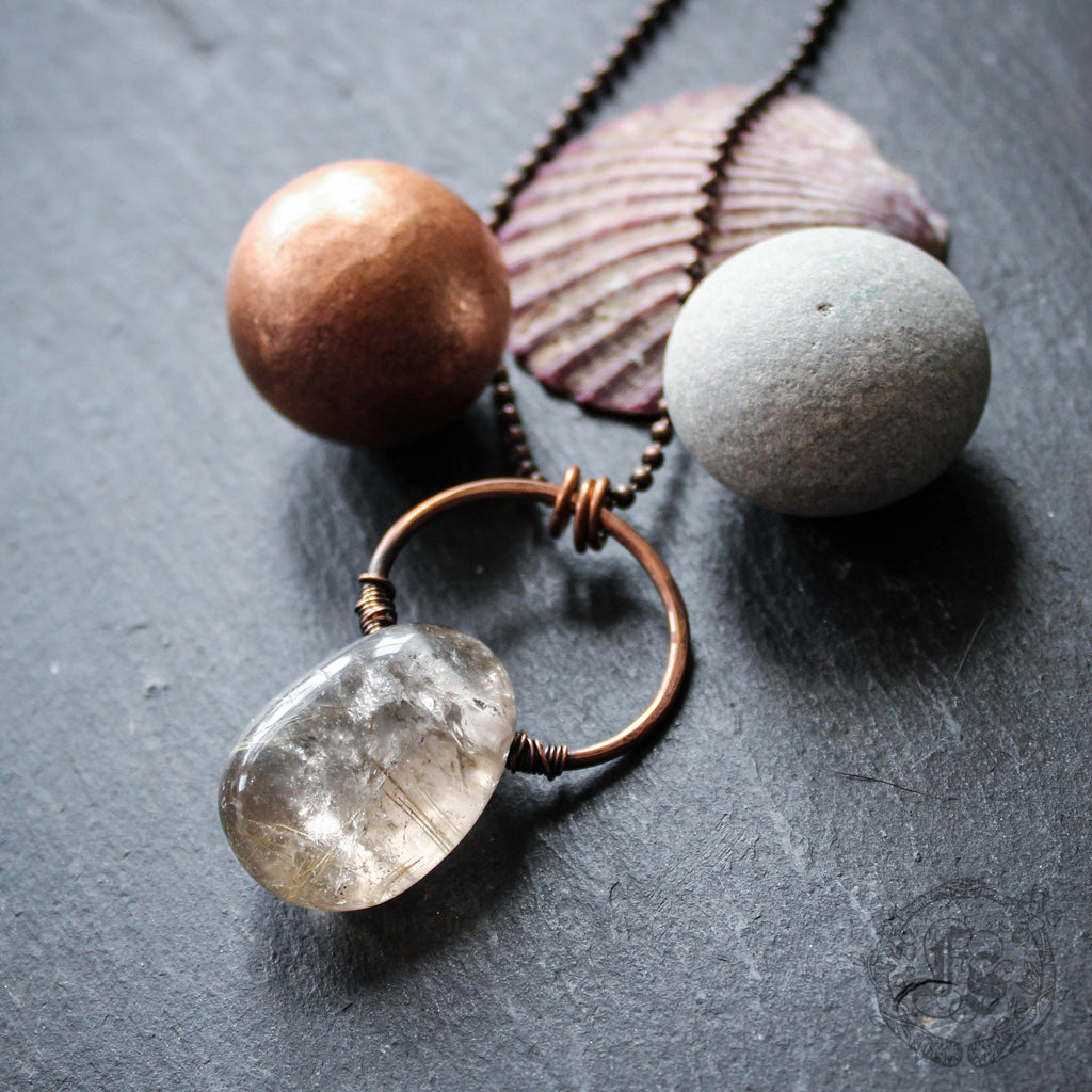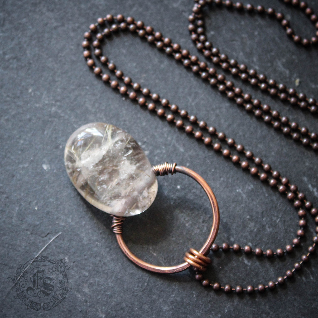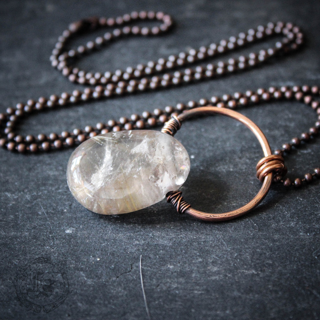 A smooth, polished rutilated quartz nugget floats in my copper crystal nimbus setting, strung from a 30" or 76cm length of copper plated steel ball chain.