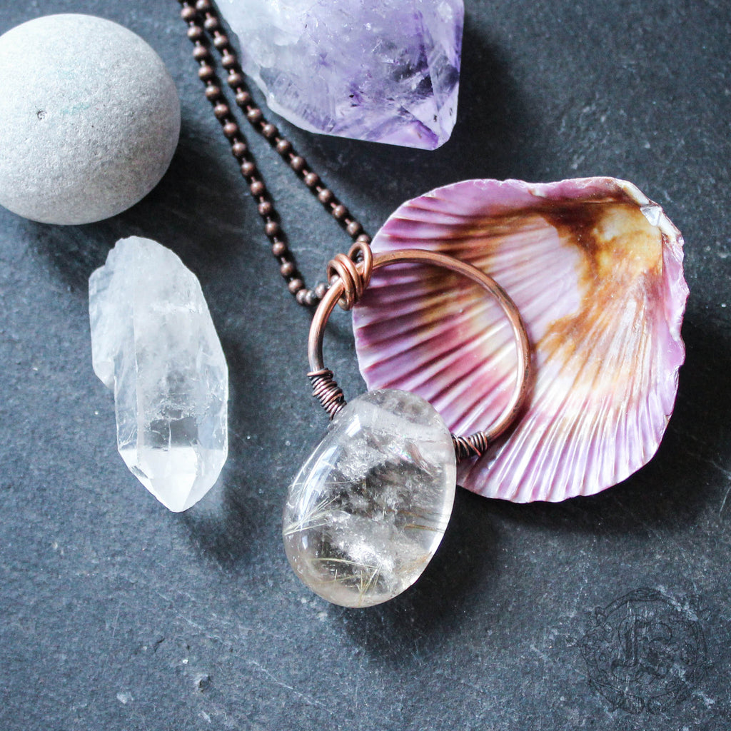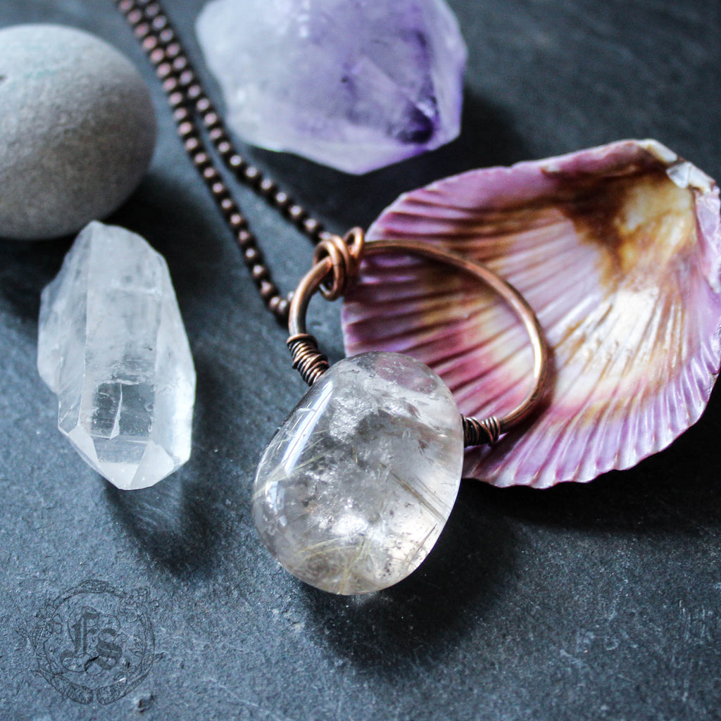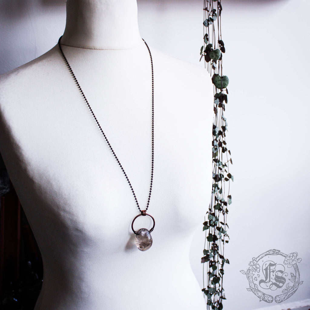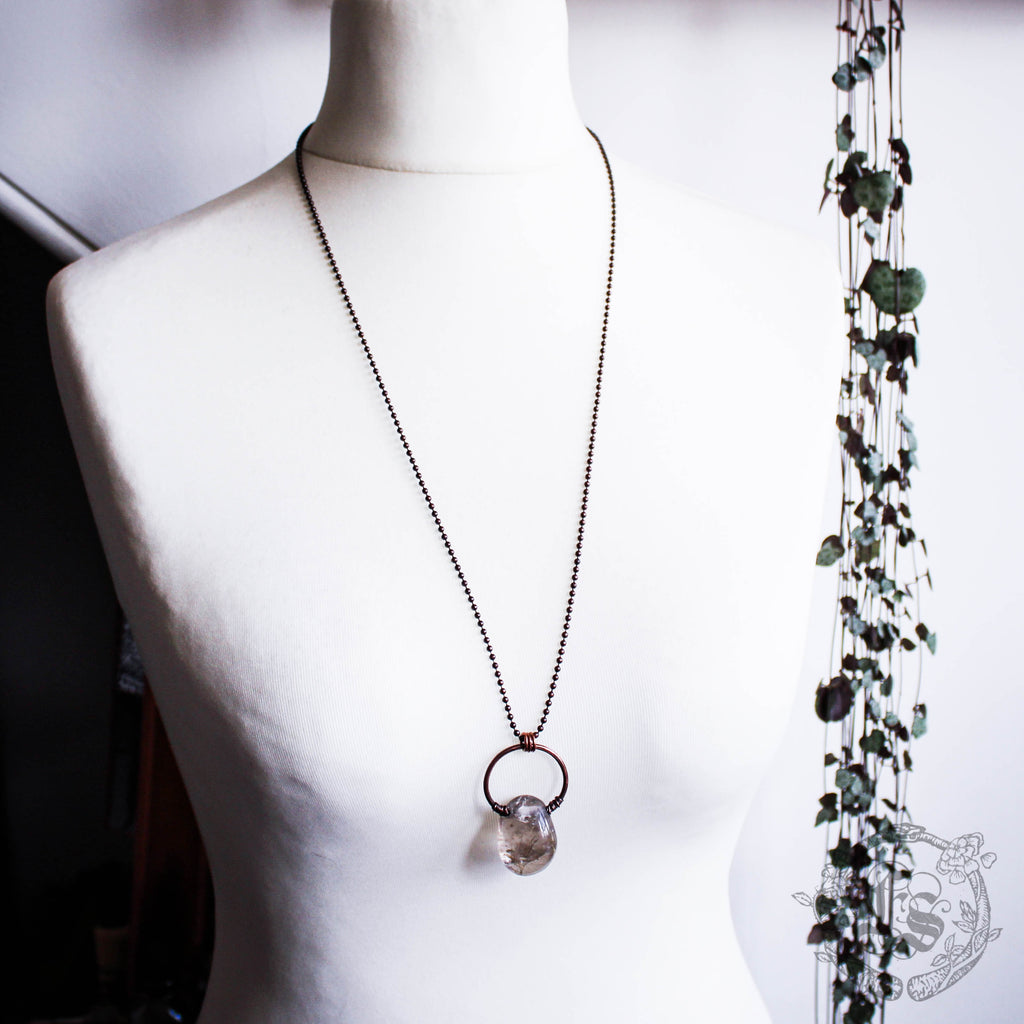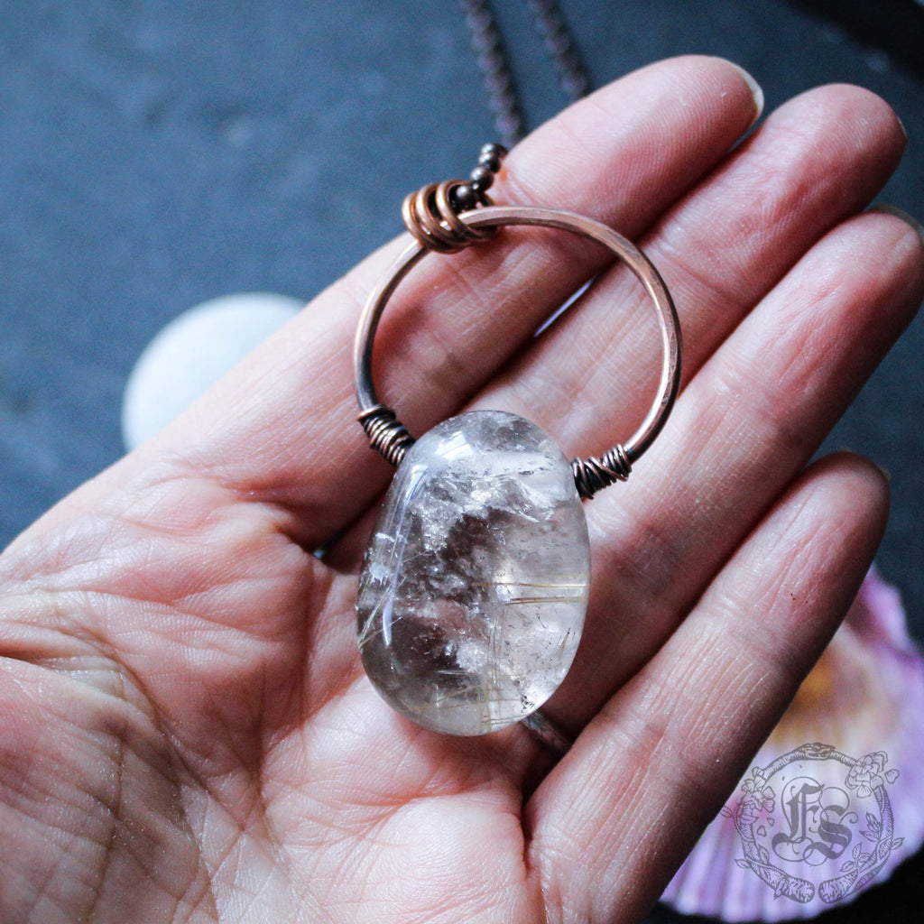 A smooth, polished rutilated quartz nugget floats in my copper crystal nimbus setting, strung from a 30" or 76cm length of copper plated steel ball chain.
