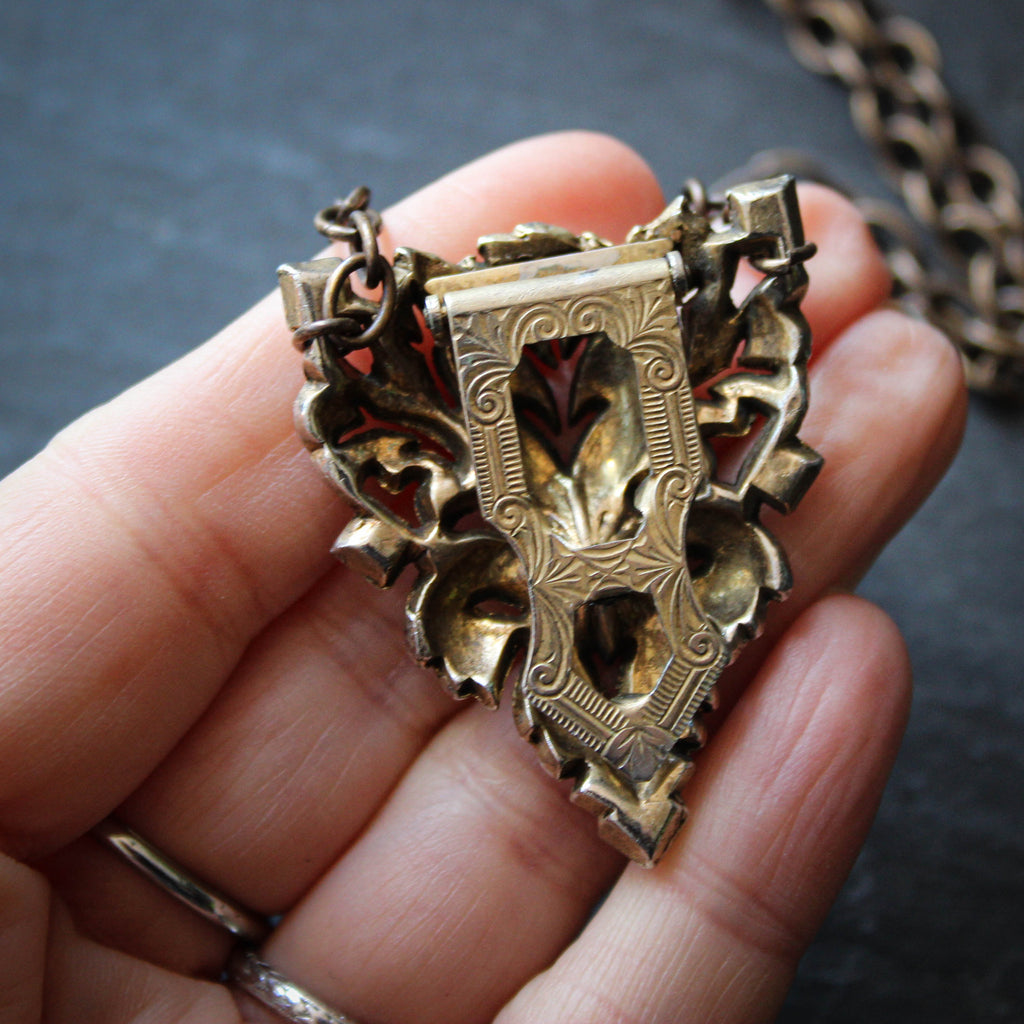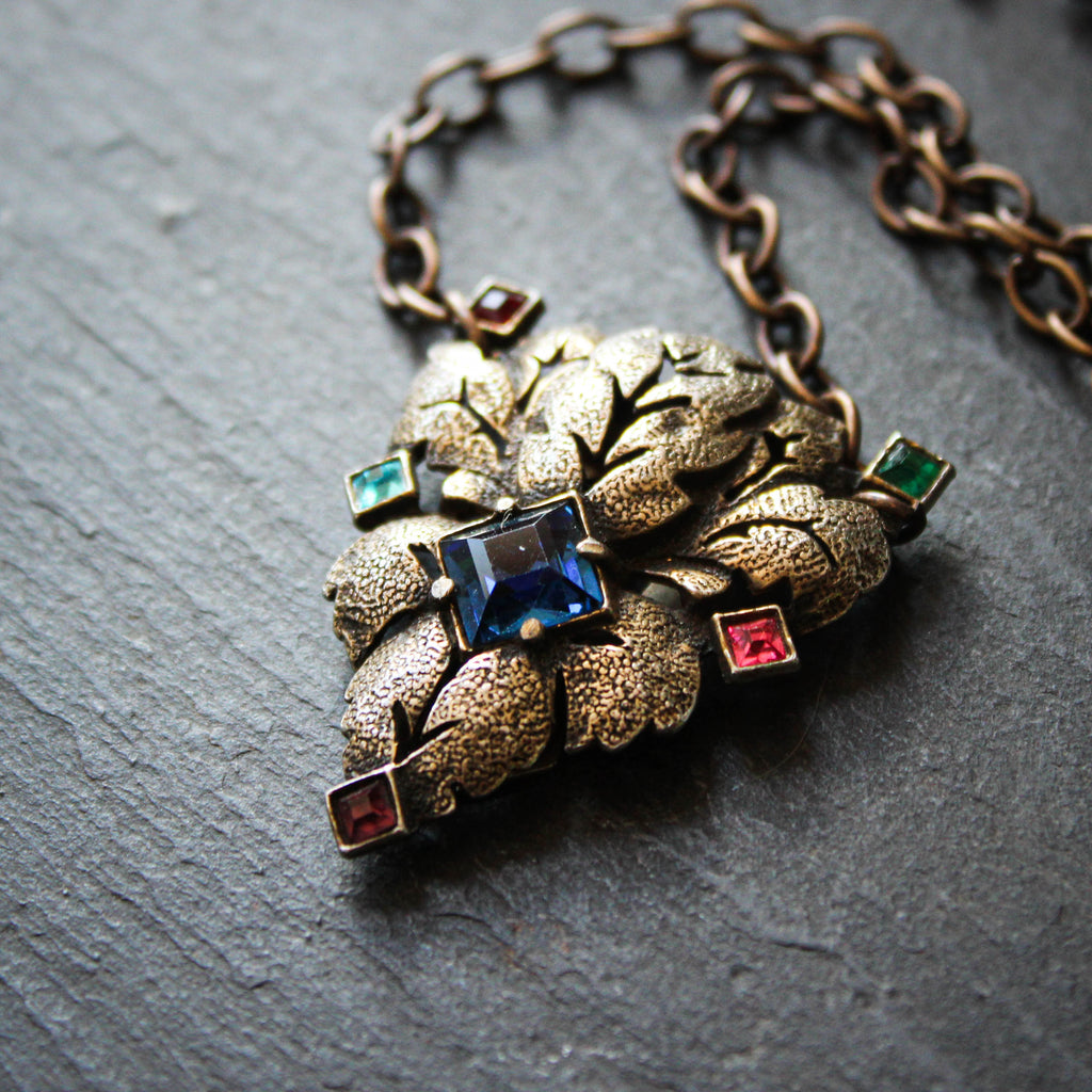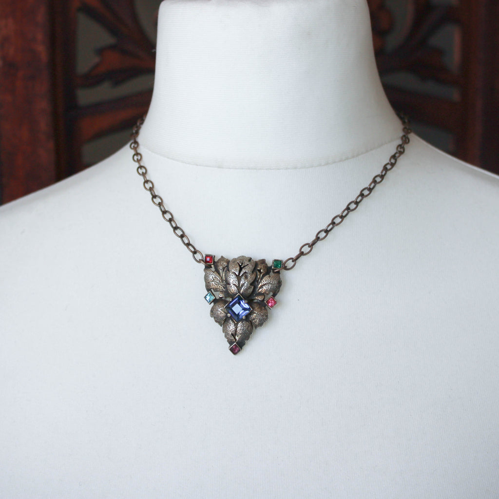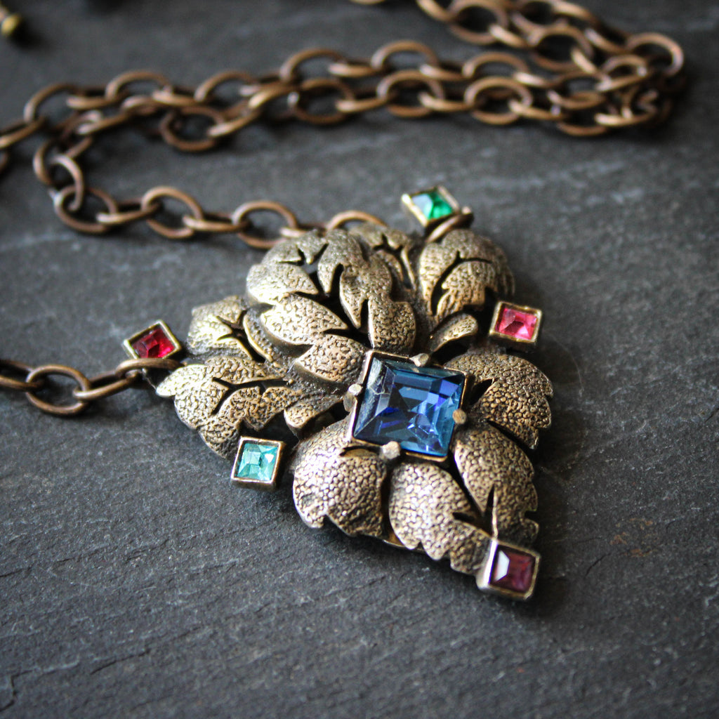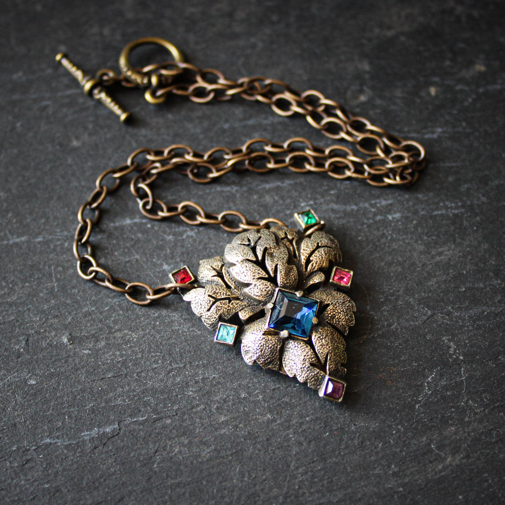A bold, 1930s dress clip hangs from brass chain with a brass plated, nickel-free and lead-free pewter toggle.