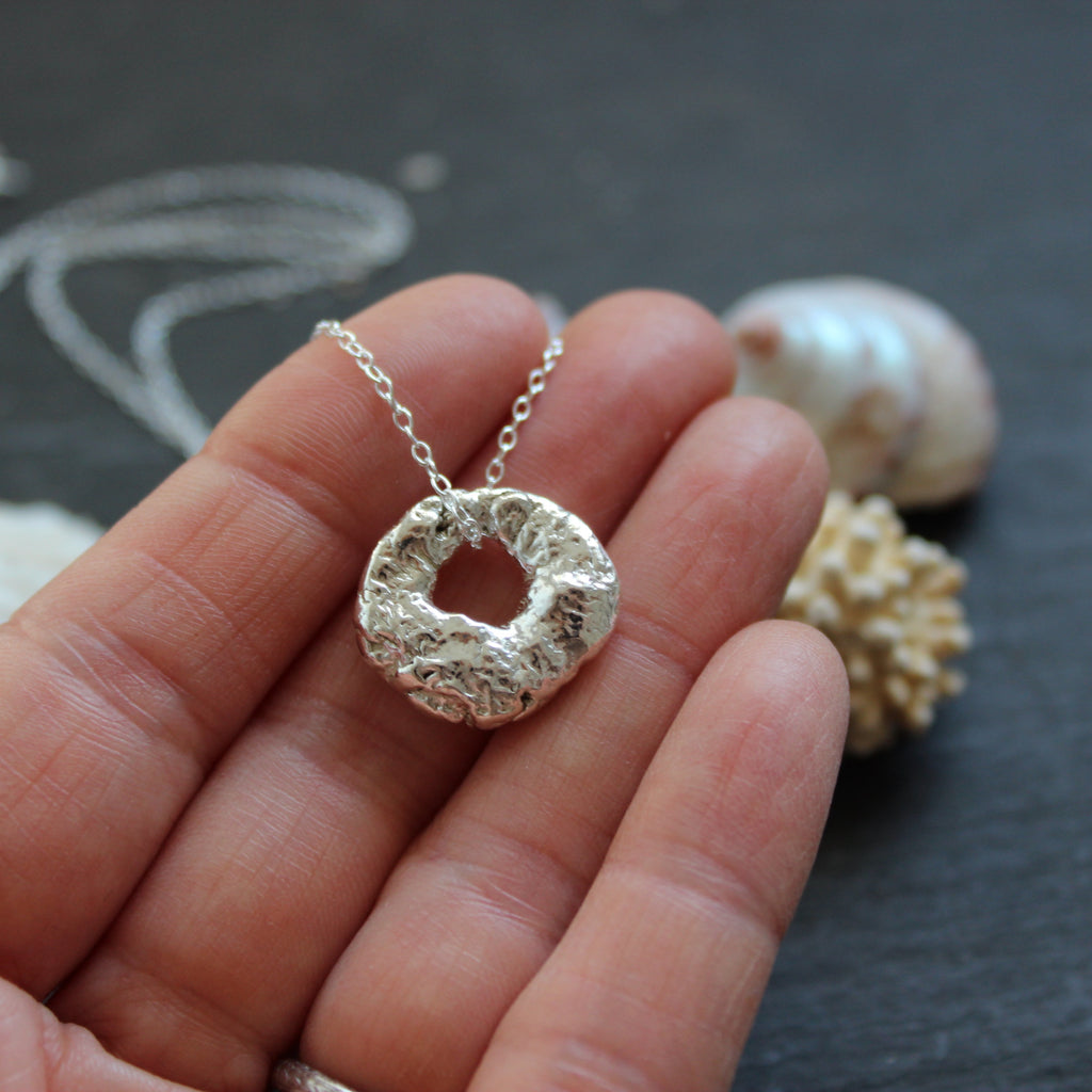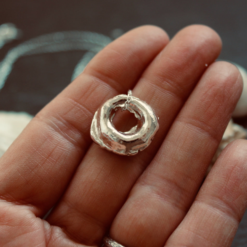 - This design is inspired by magical holey stones usually formed by running water--our version of silver is formed by fire, quenched in water and air