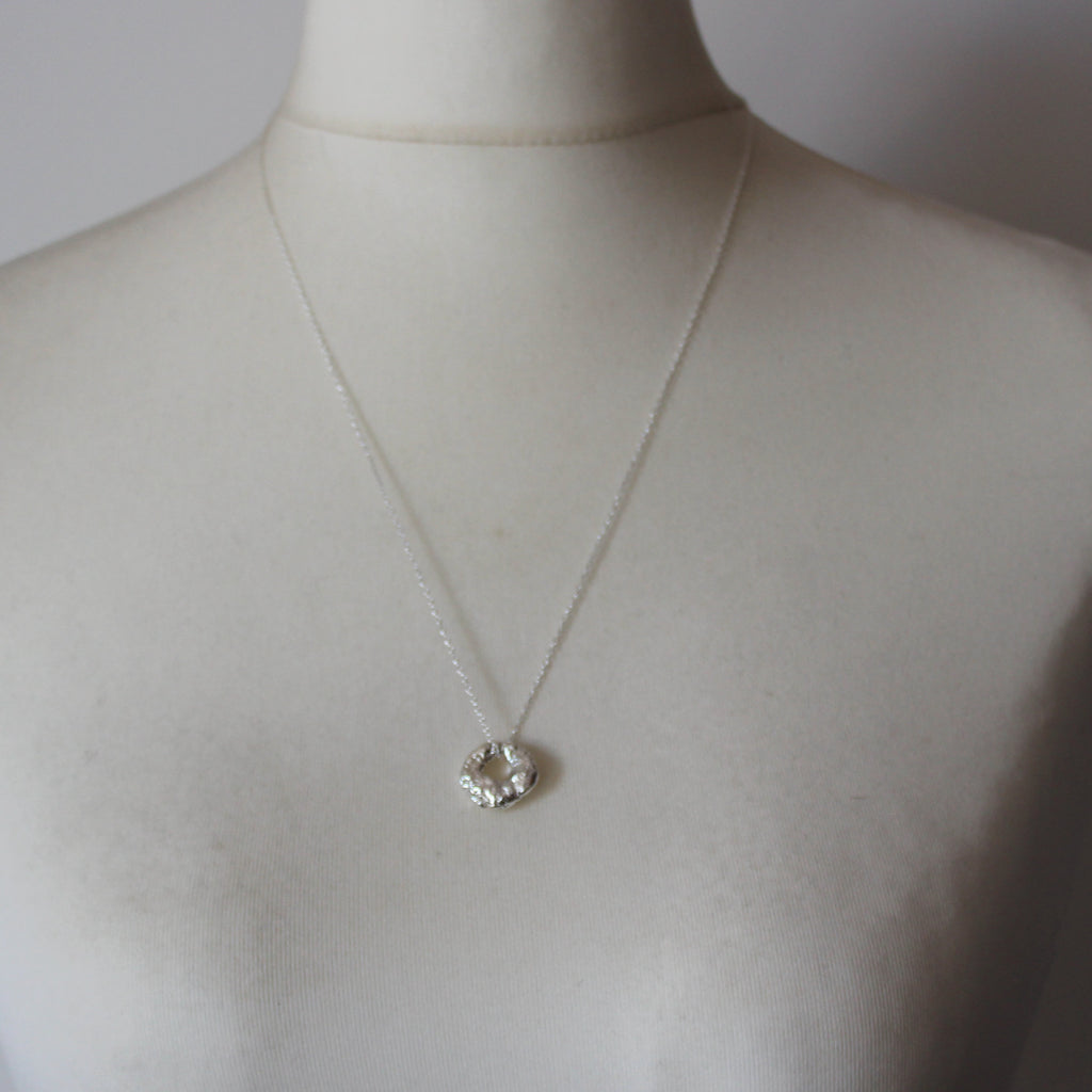 A weighty, glistening stone nugget of recycled sterling silver hanging from a sterling chain length.