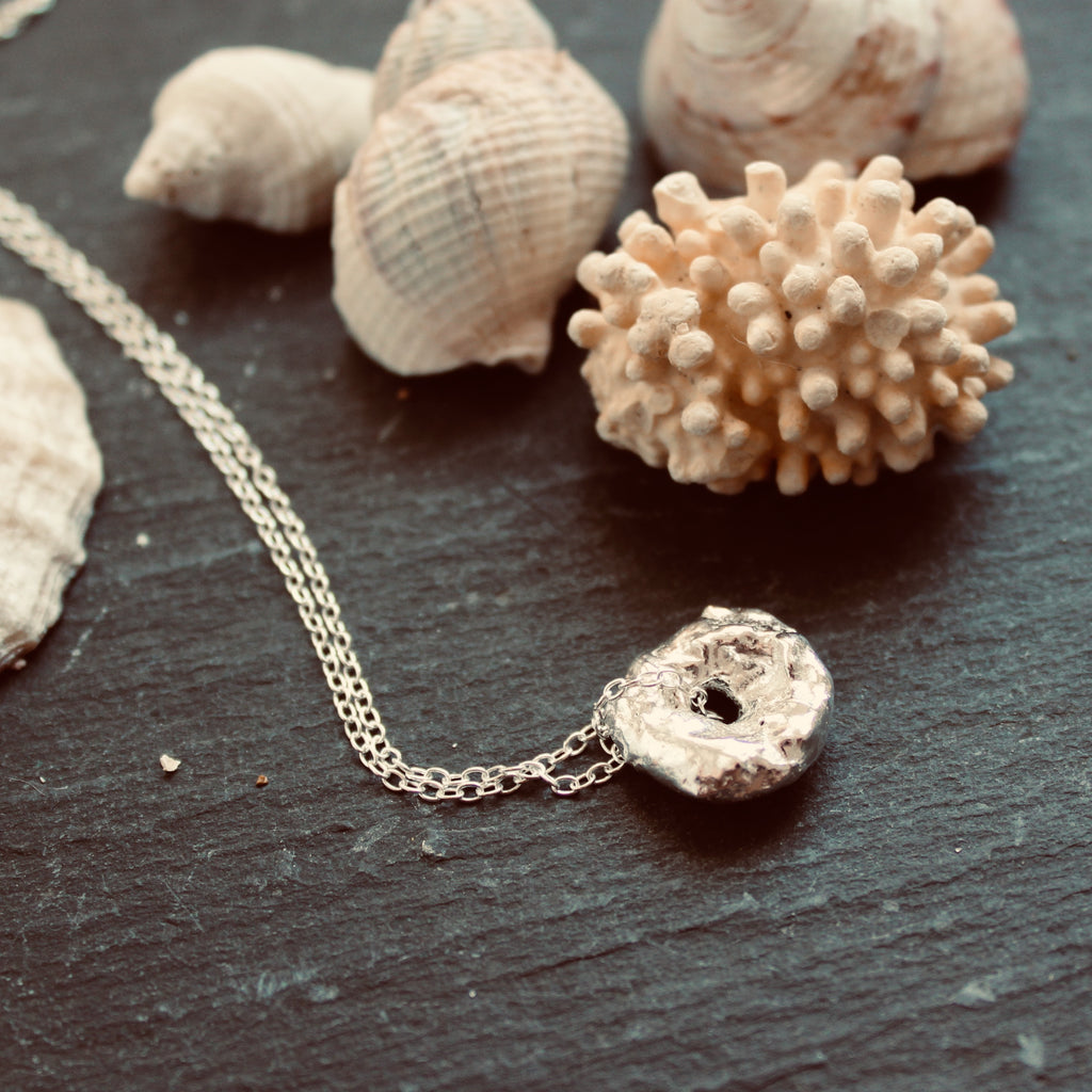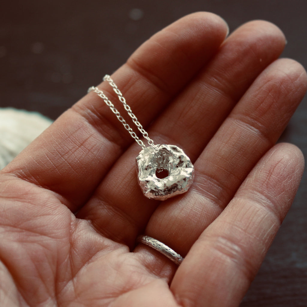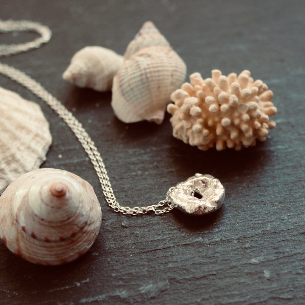 A little glistening stone nugget of recycled sterling silver hanging from a sterling chain length.