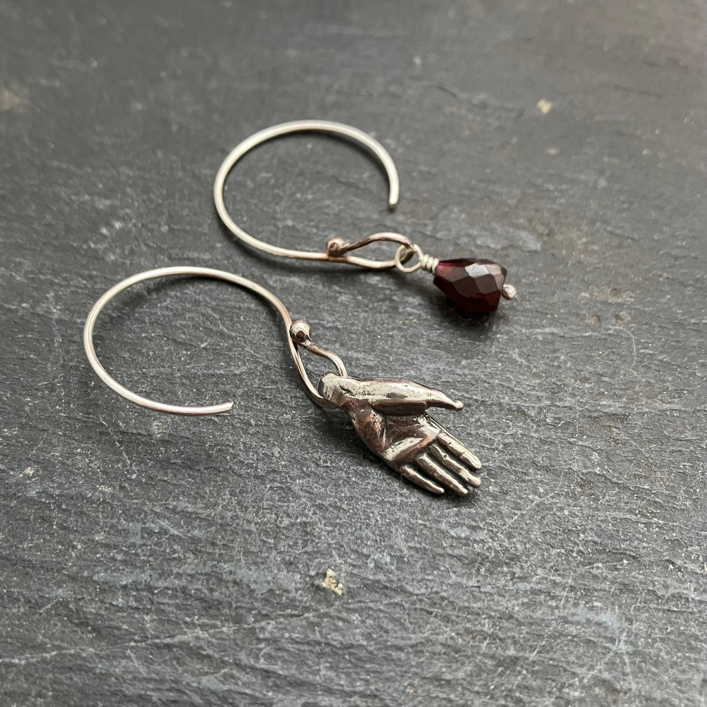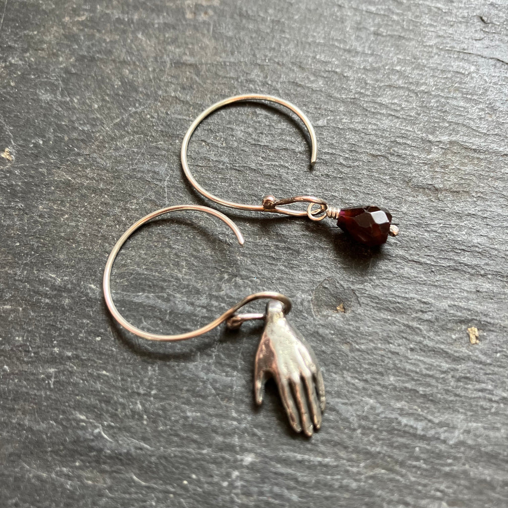 Frida Khalo Inspired Hand Earrings with Garnet in Pewter and Sterling