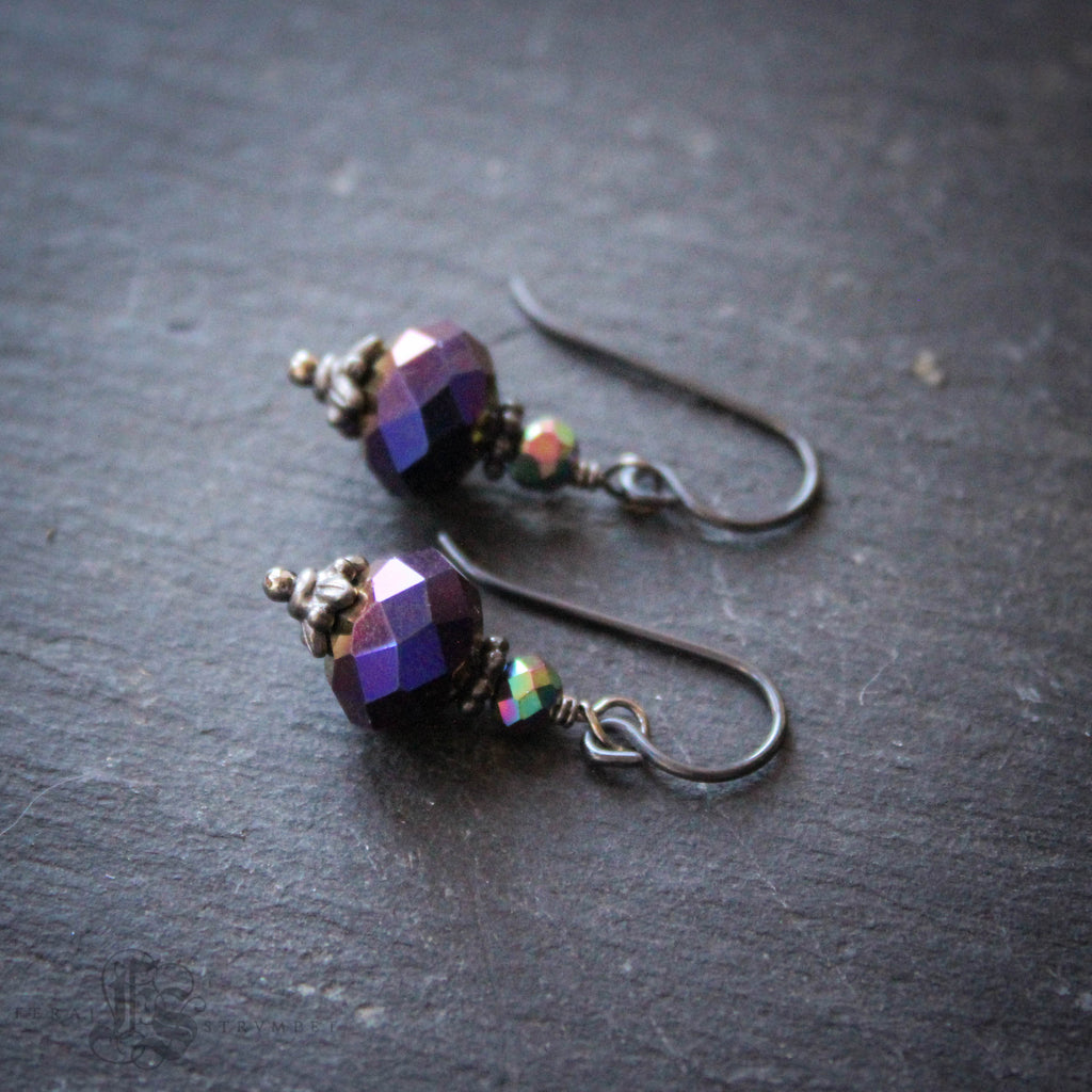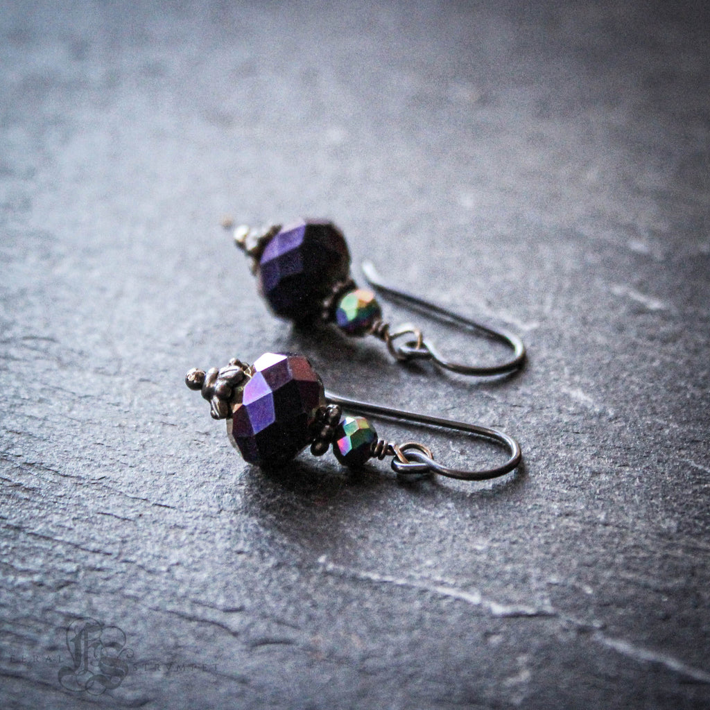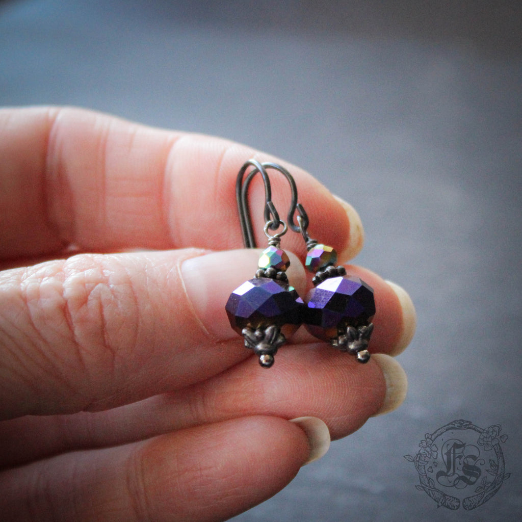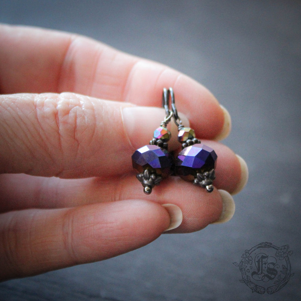 Iridescent plum coloured crystals framed by blackened brass flowers.