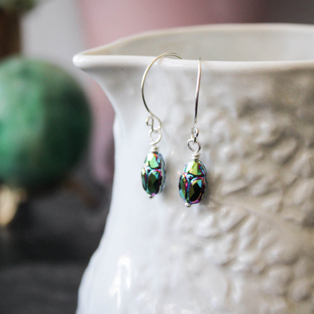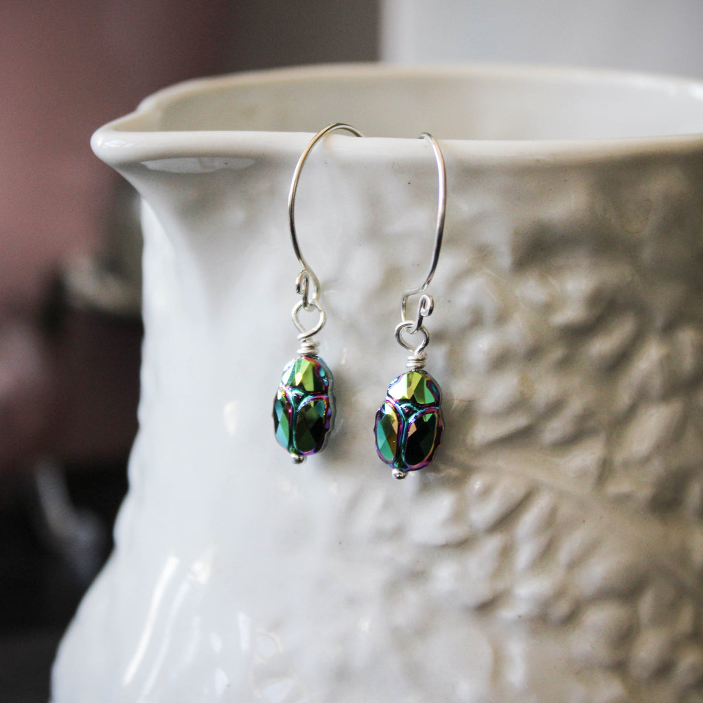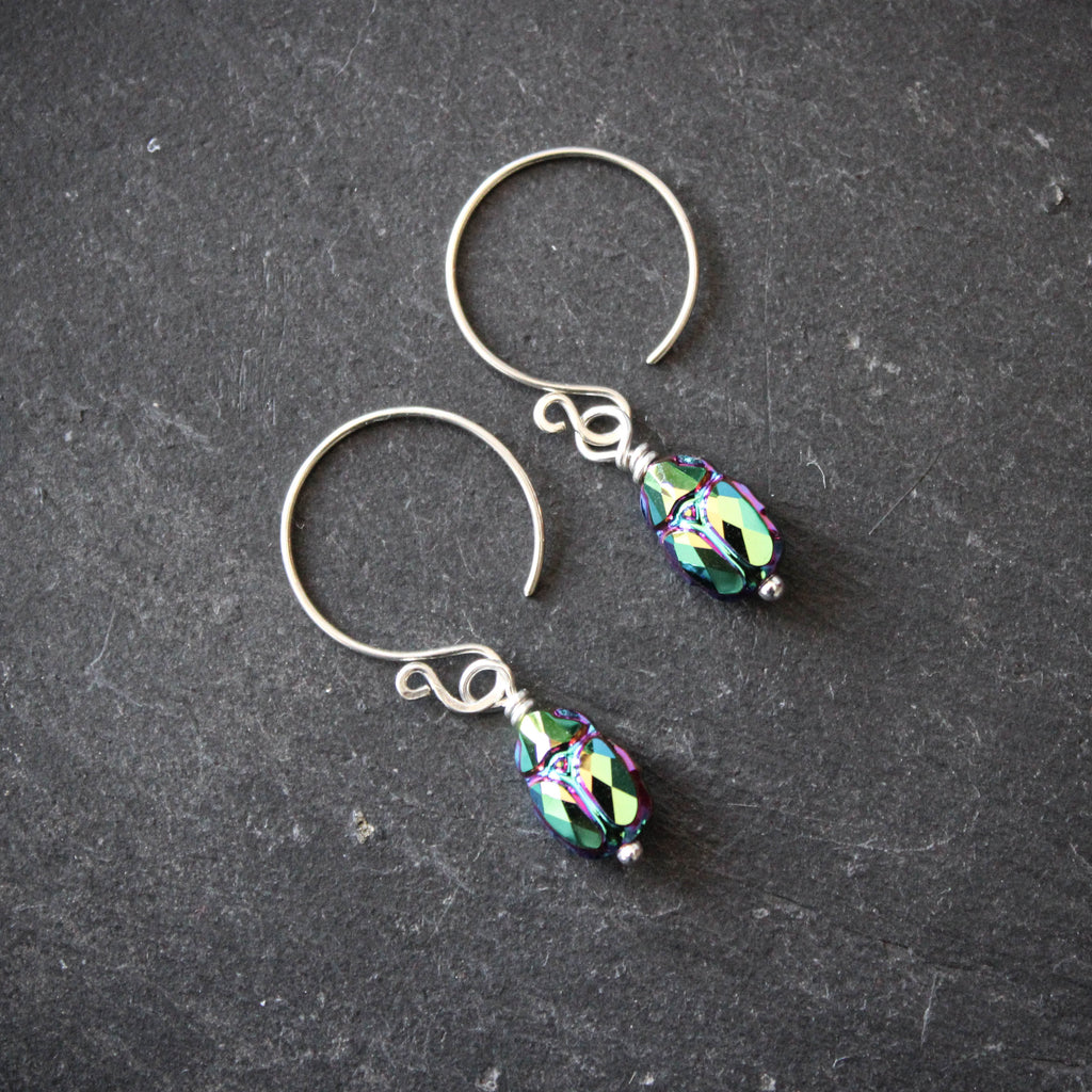 Beautiful Swarovski crystal scarabs hanging from tiny, sterling silver hoops and hand forged in sterling silver.