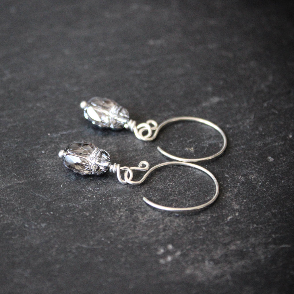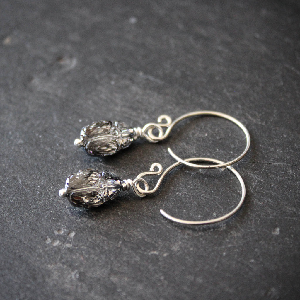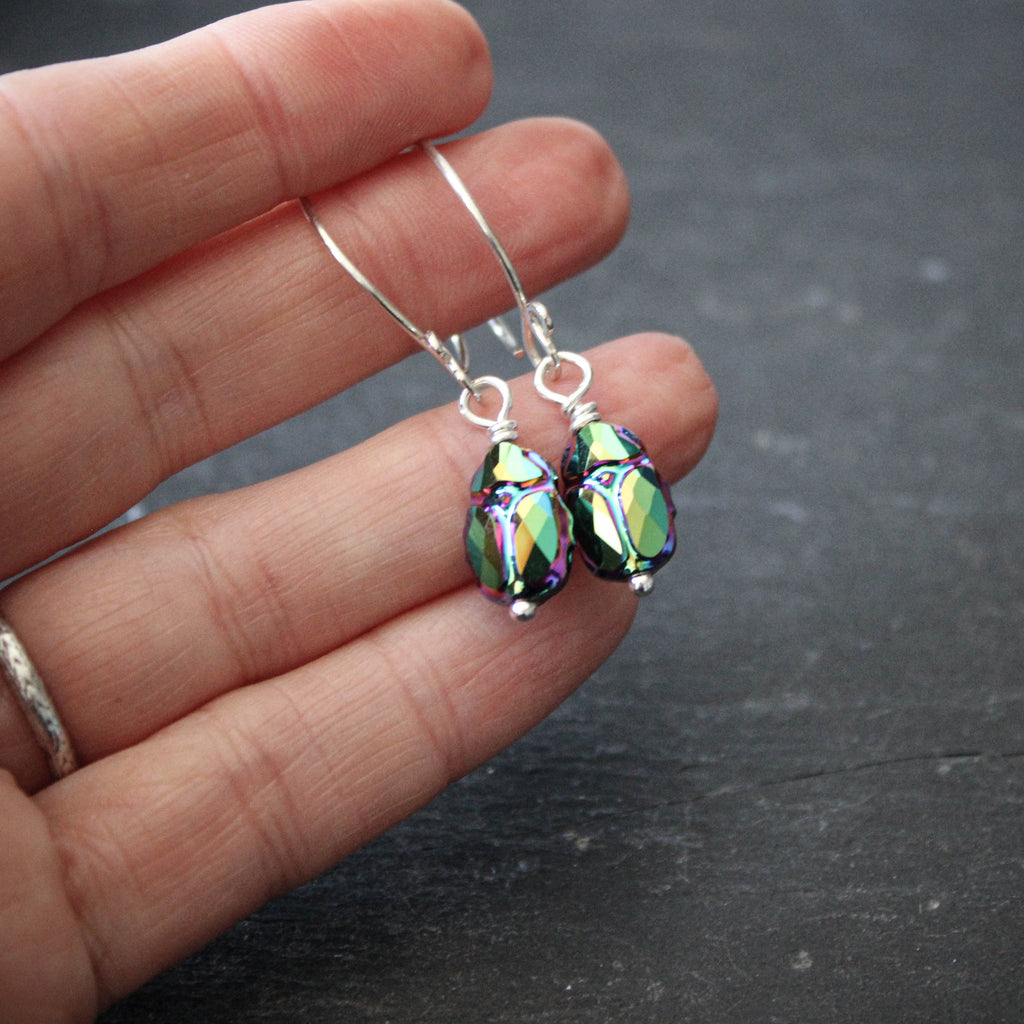 Beautiful Swarovski crystal scarabs hanging from tiny, sterling silver hoops and hand forged in sterling silver.