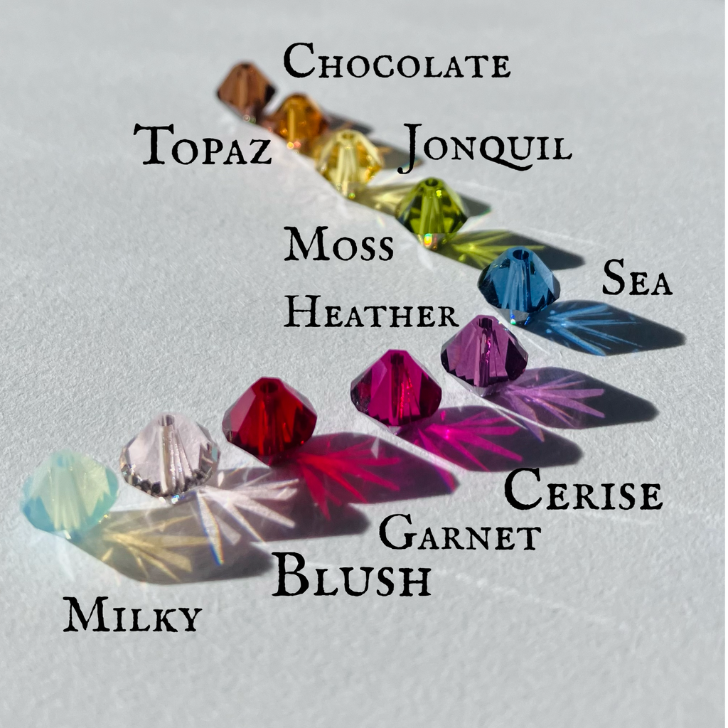 - Chain measures 30" or 76cm from one elastic loop to the other, each end is finished with hand wired Czech glass and Swarovski crystals