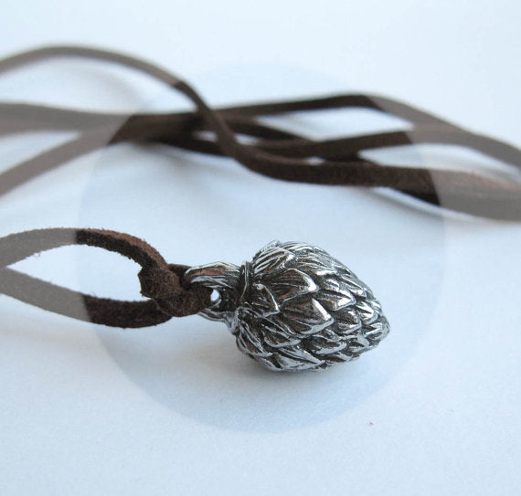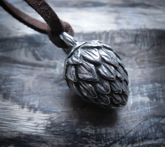 This necklace celebrates the ancient beverage with a weighty and beautifully detailed pewter hop flower pendant.