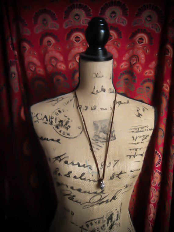 - It hangs from a length of vegan suede in earthy brown