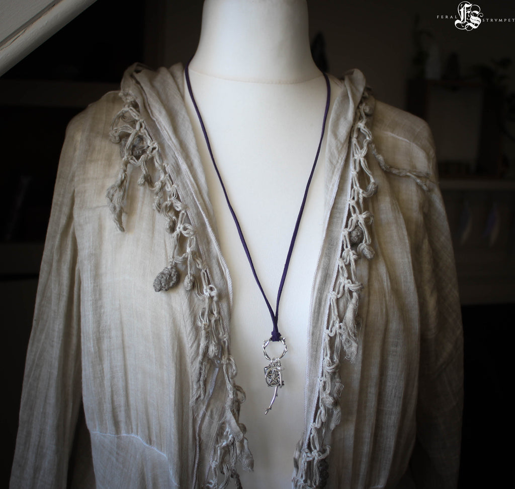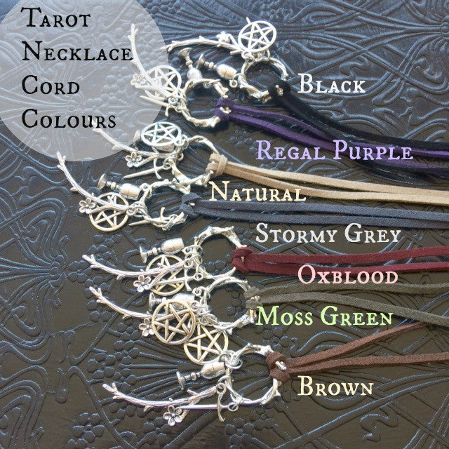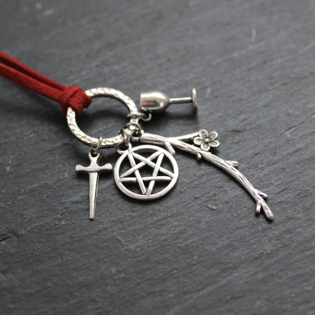 The Tarot Reader's Necklace is a delicate tribute to tools of divination, featuring a tiny wand, goblet, sword and coin suspended from a rustic silver hammered ring.