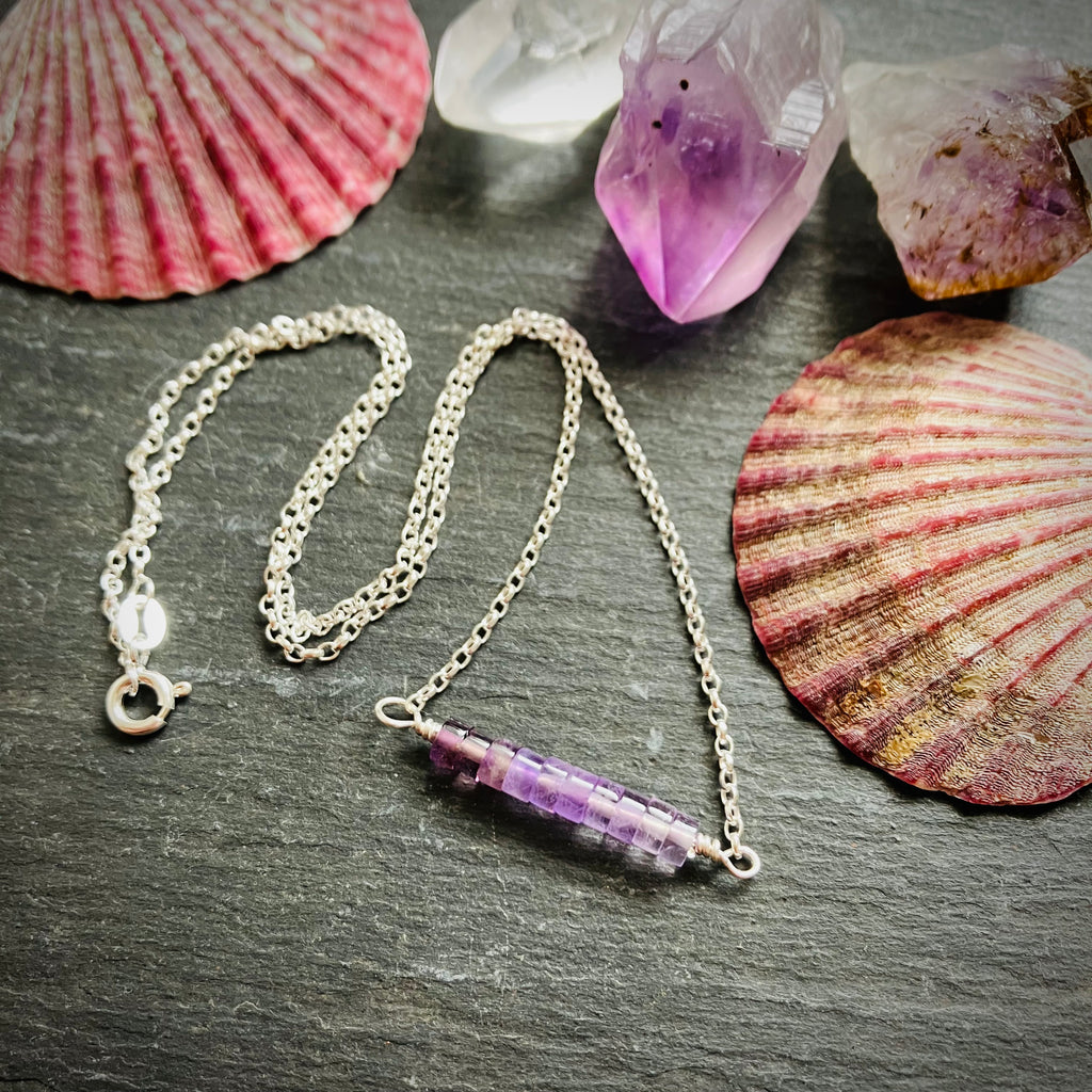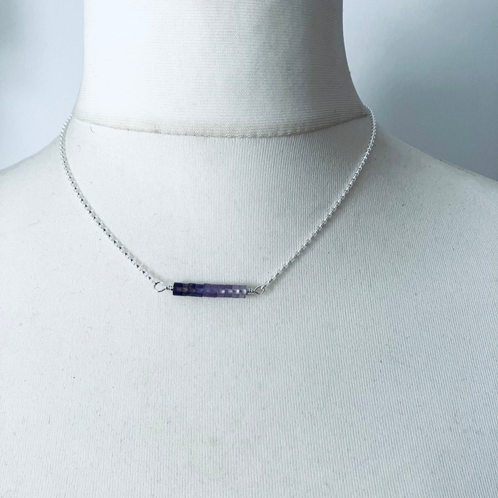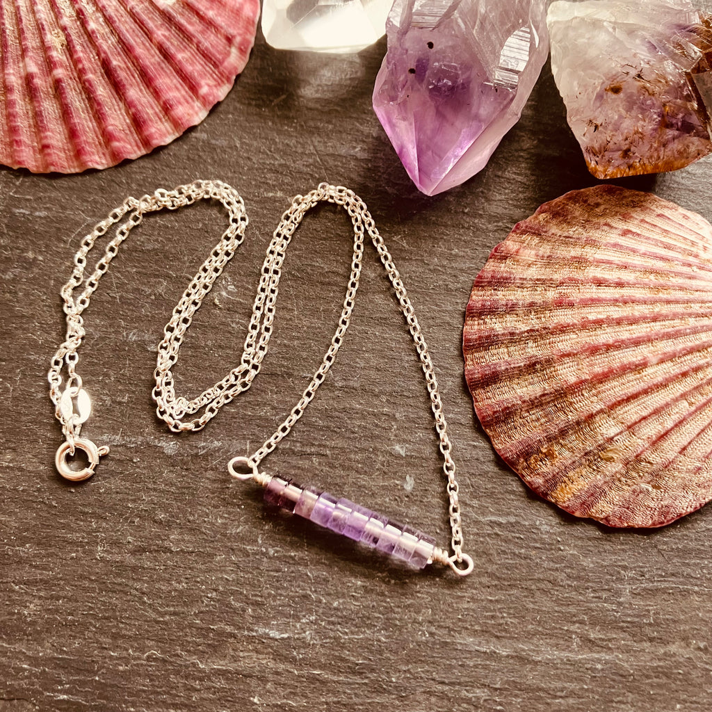 A tiny stack of ombre amethyst stones hang from recycled sterling silver chain.