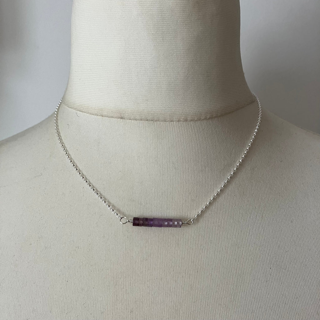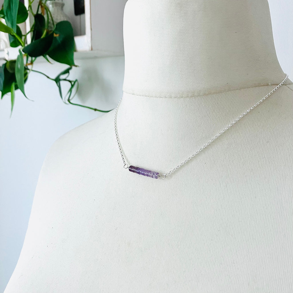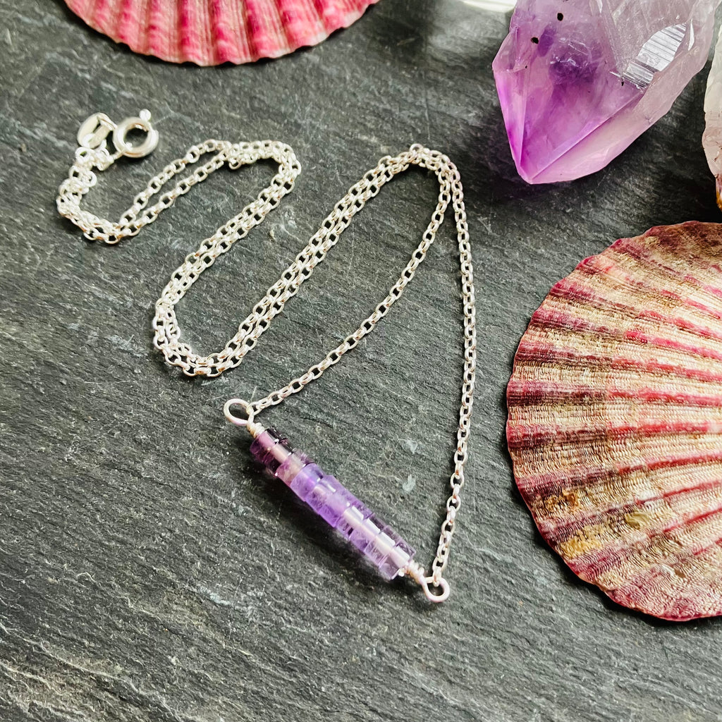 A tiny stack of ombre amethyst stones hang from recycled sterling silver chain.