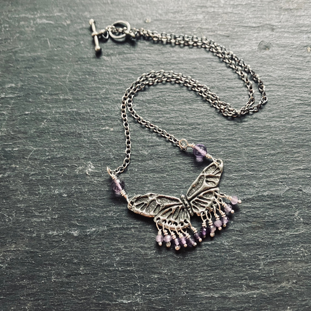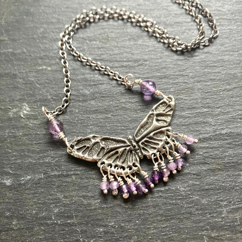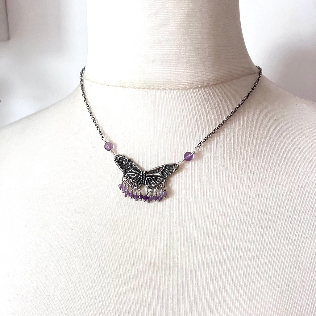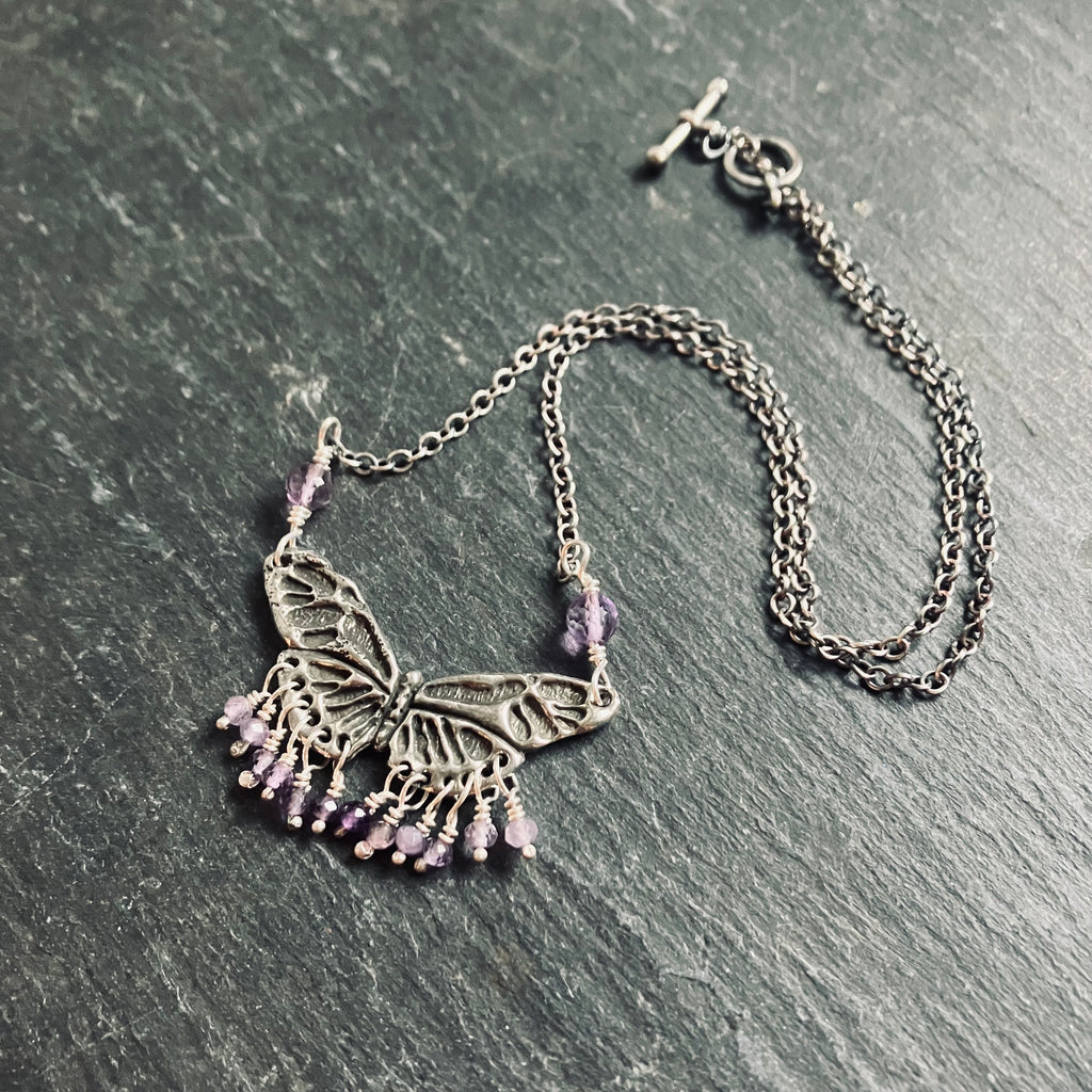 Amethyst Butterfly Necklace in Pewter and Sterling Silver