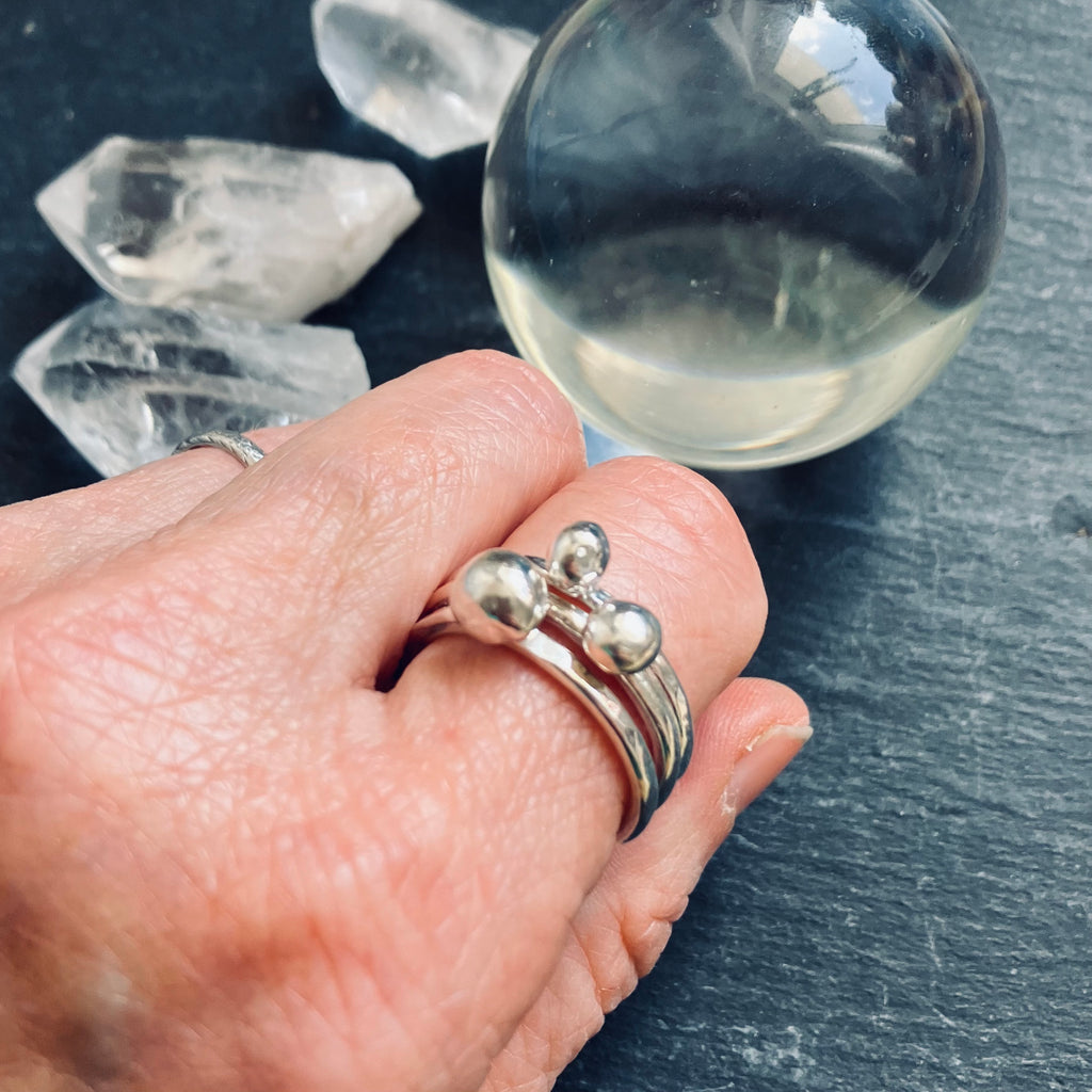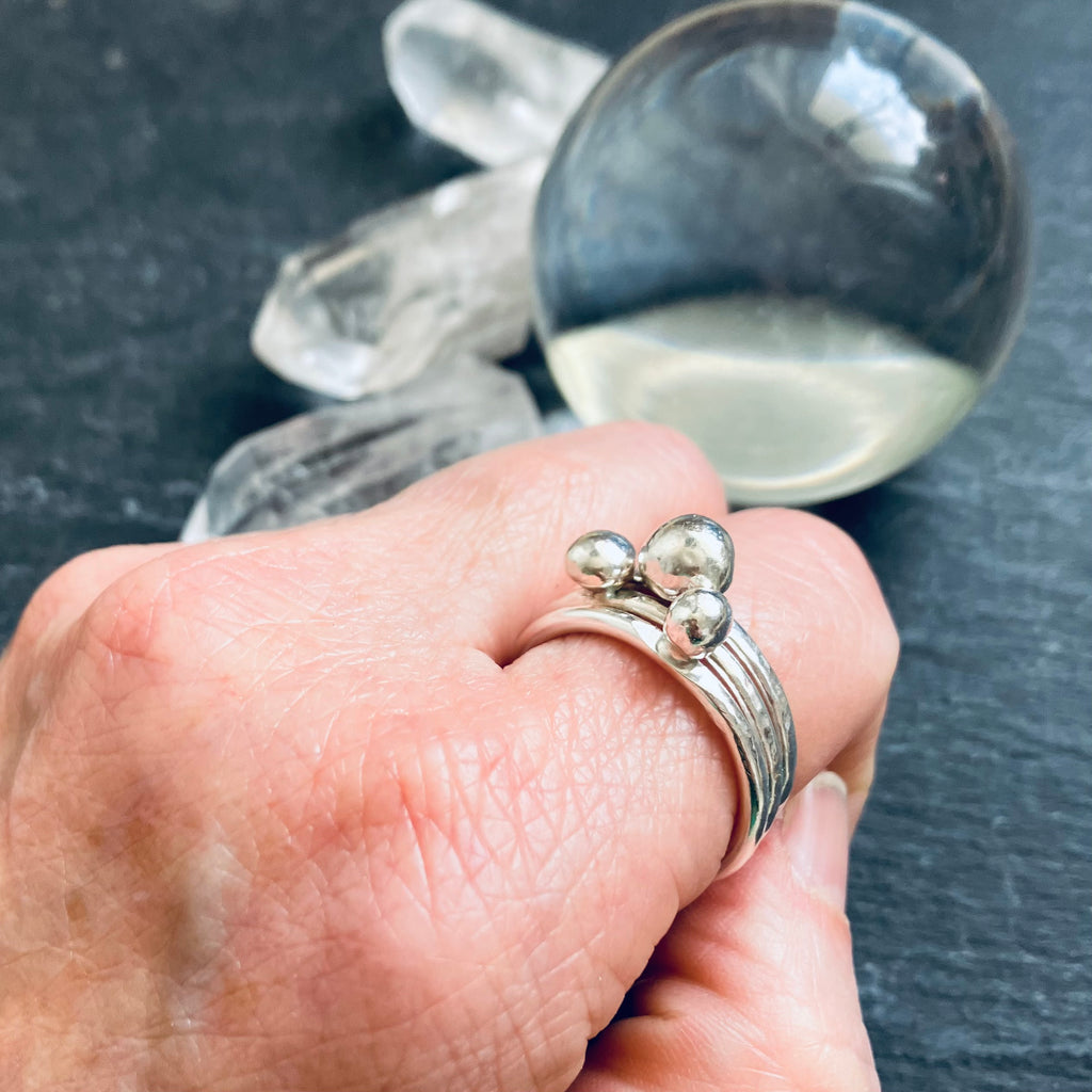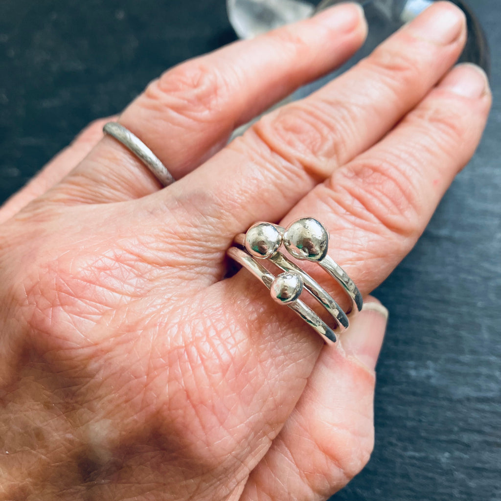 Stacking rings inspired by the movement of sea pebbles tossed in the surf.