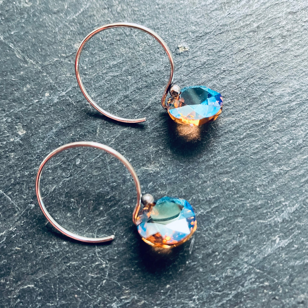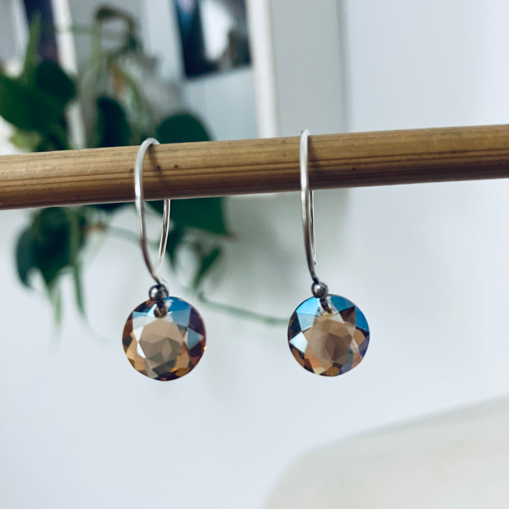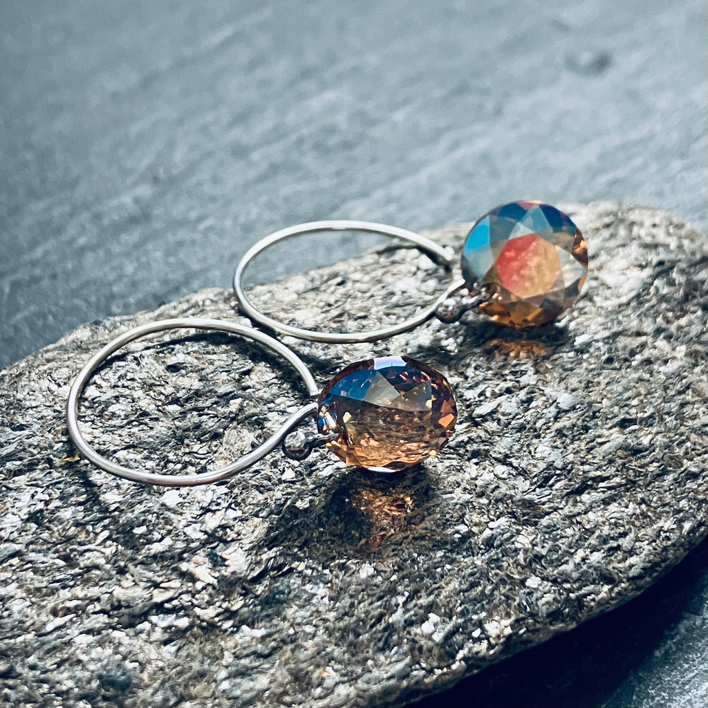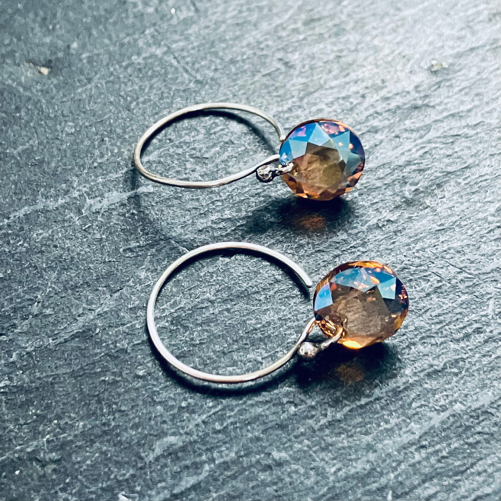 Brilliant Swarovski crystal discs are paired with rustic, hand forged hoop ear wires in a hymn to the sun!