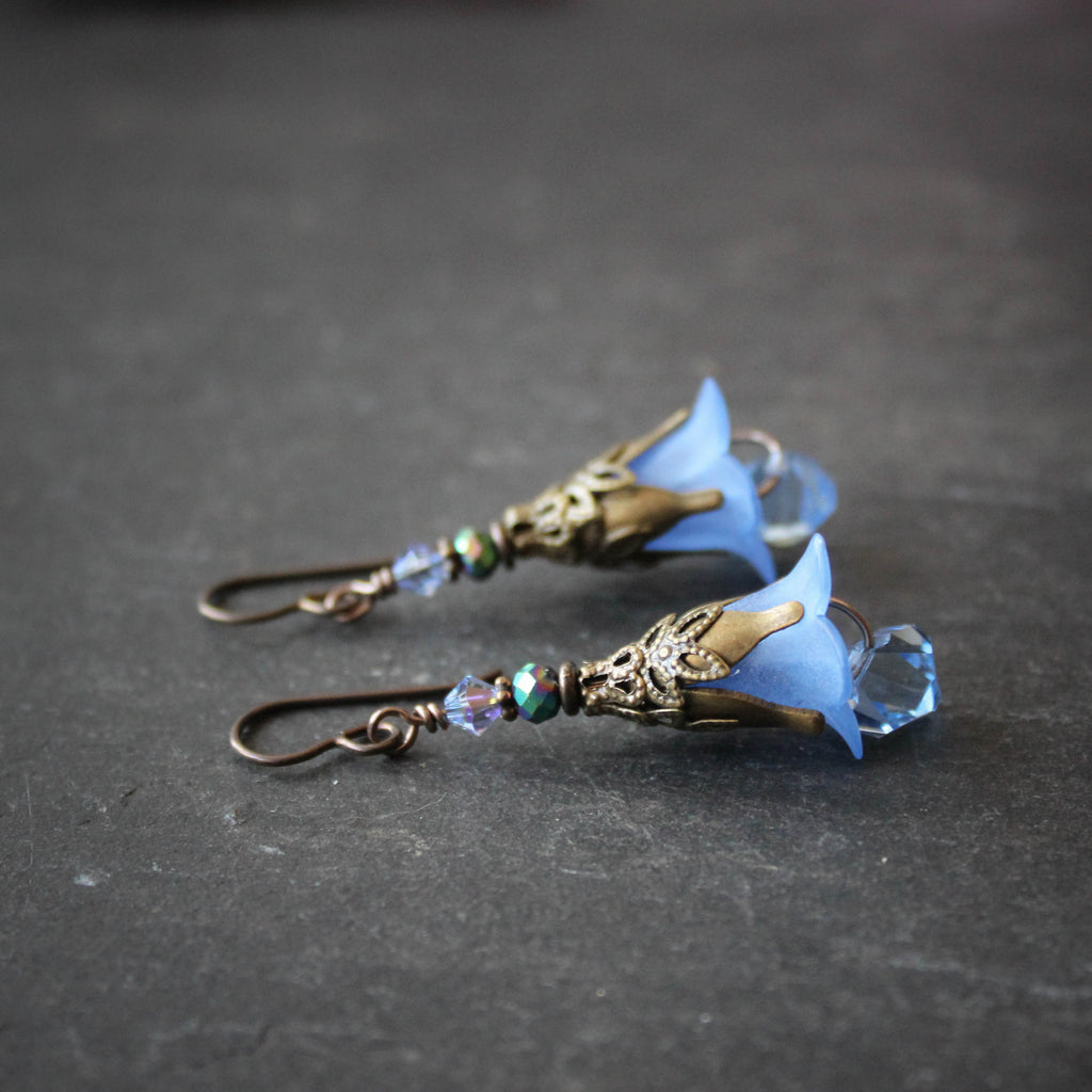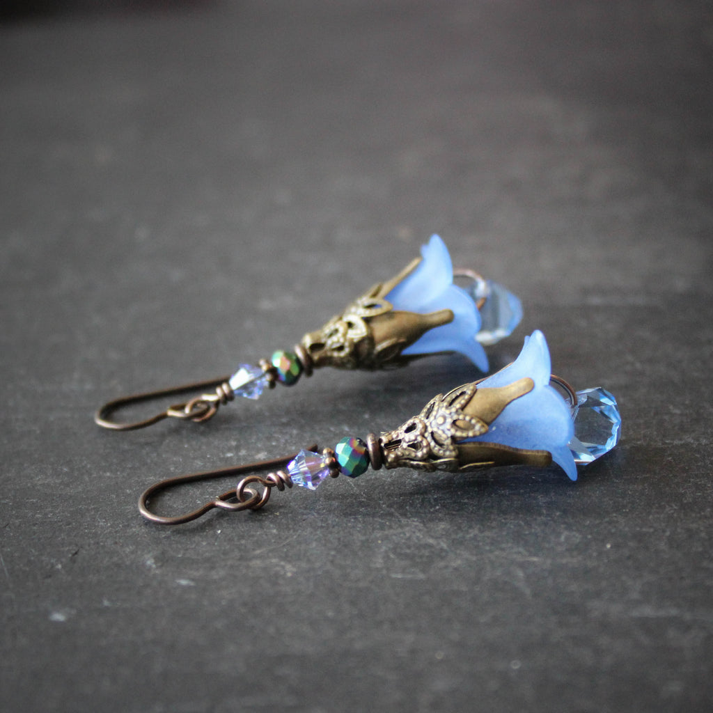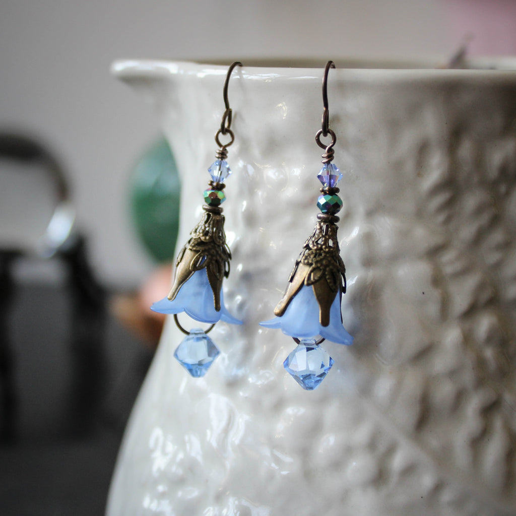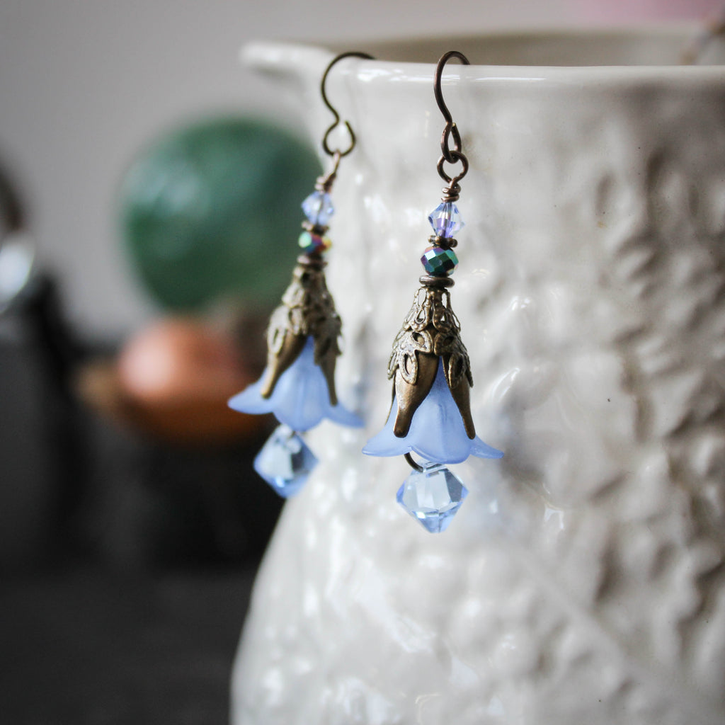 Pale blue fairy flower earrings resemble little harebells from an ancient, fey woodland.