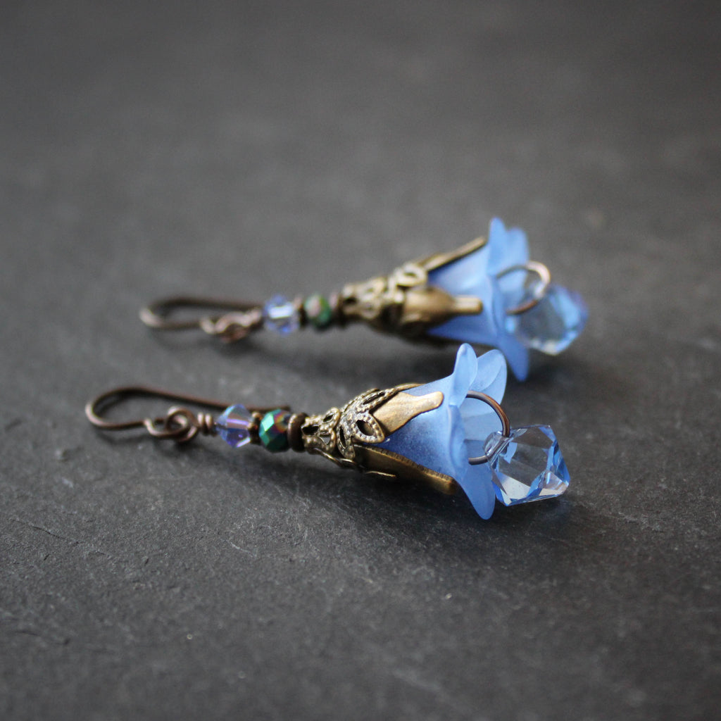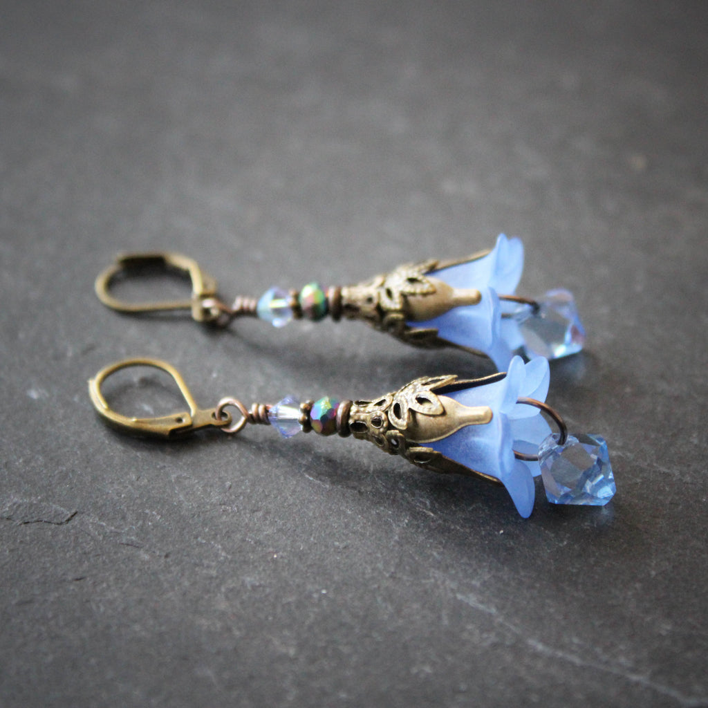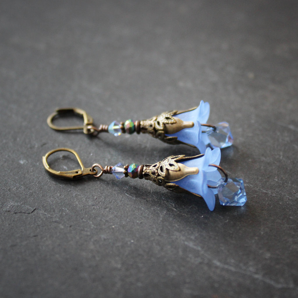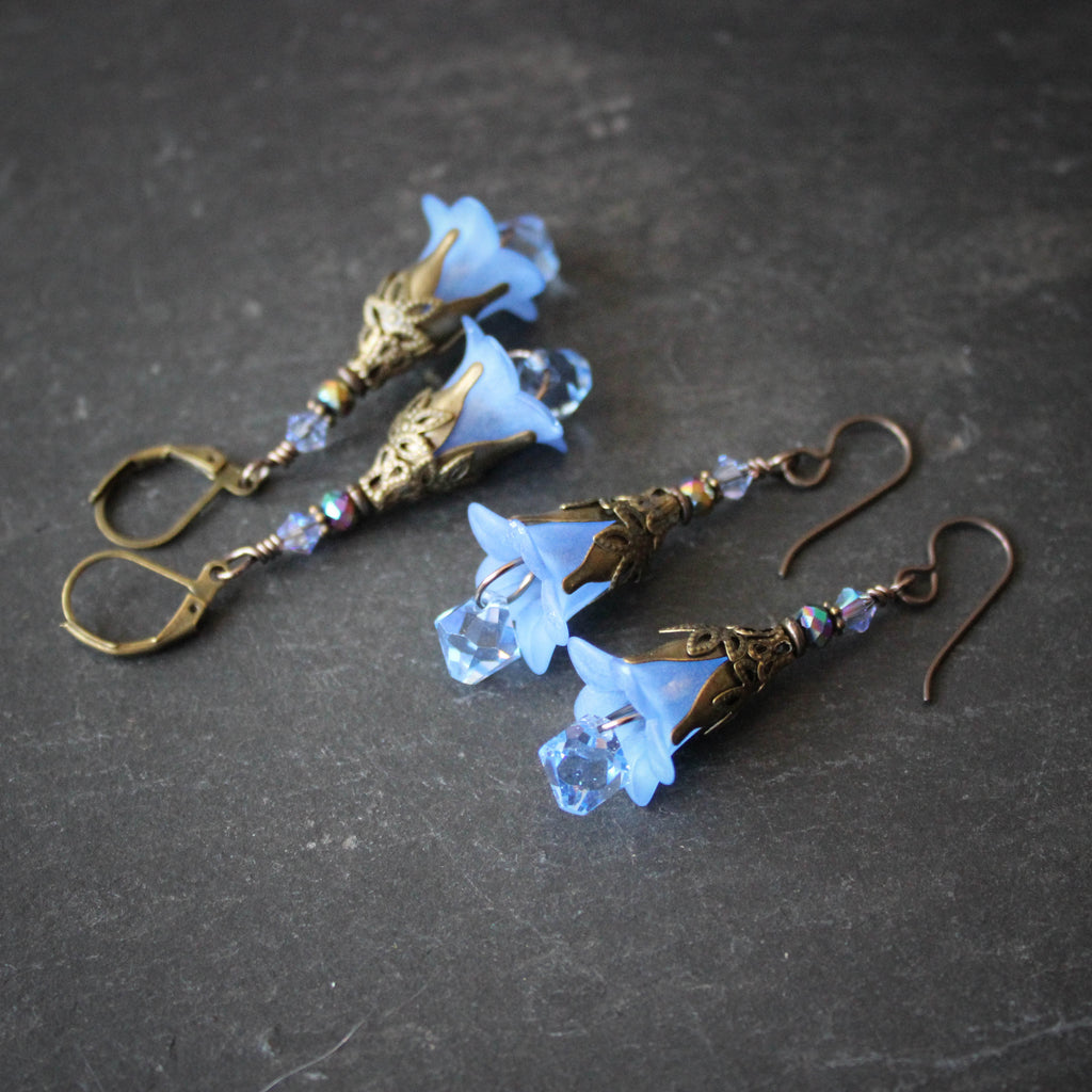 Pale blue fairy flower earrings resemble little harebells from an ancient, fey woodland.