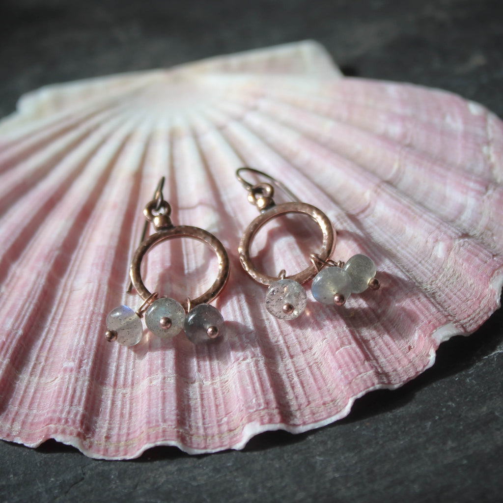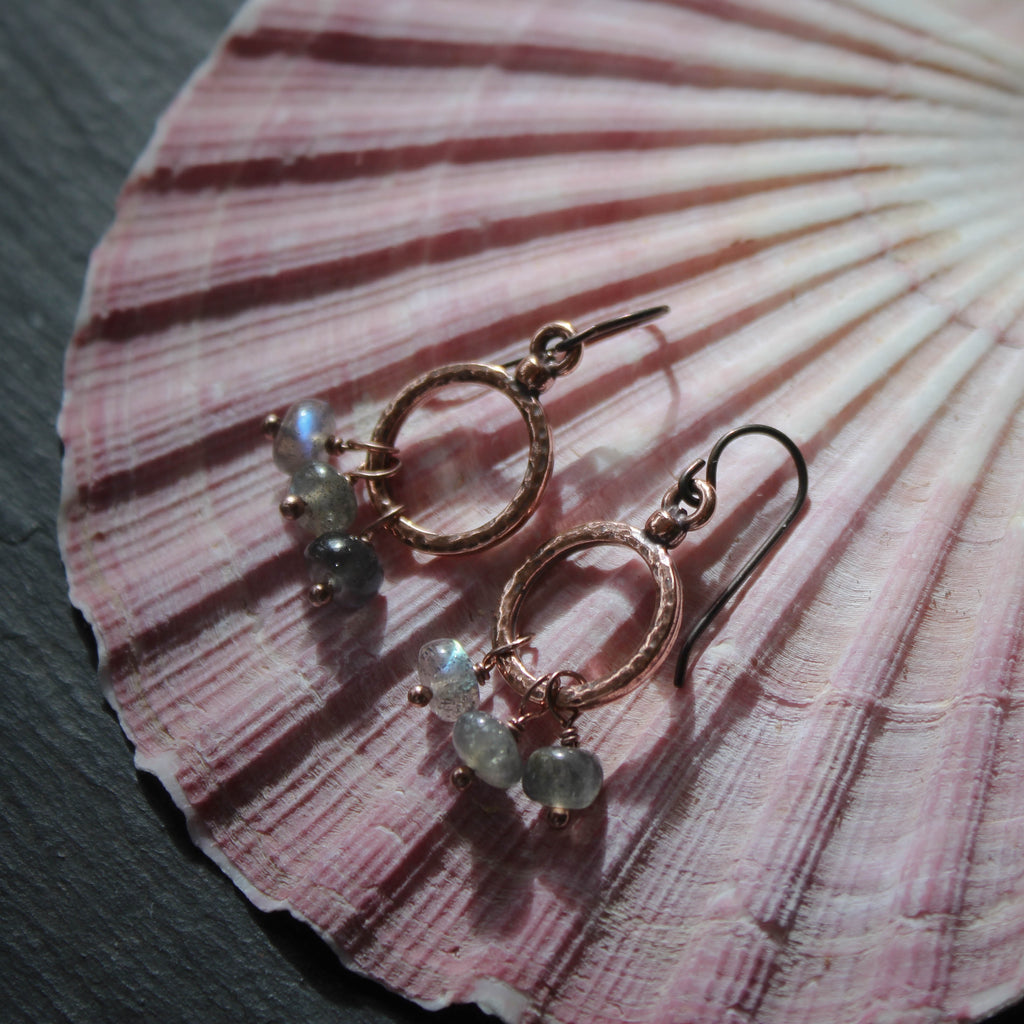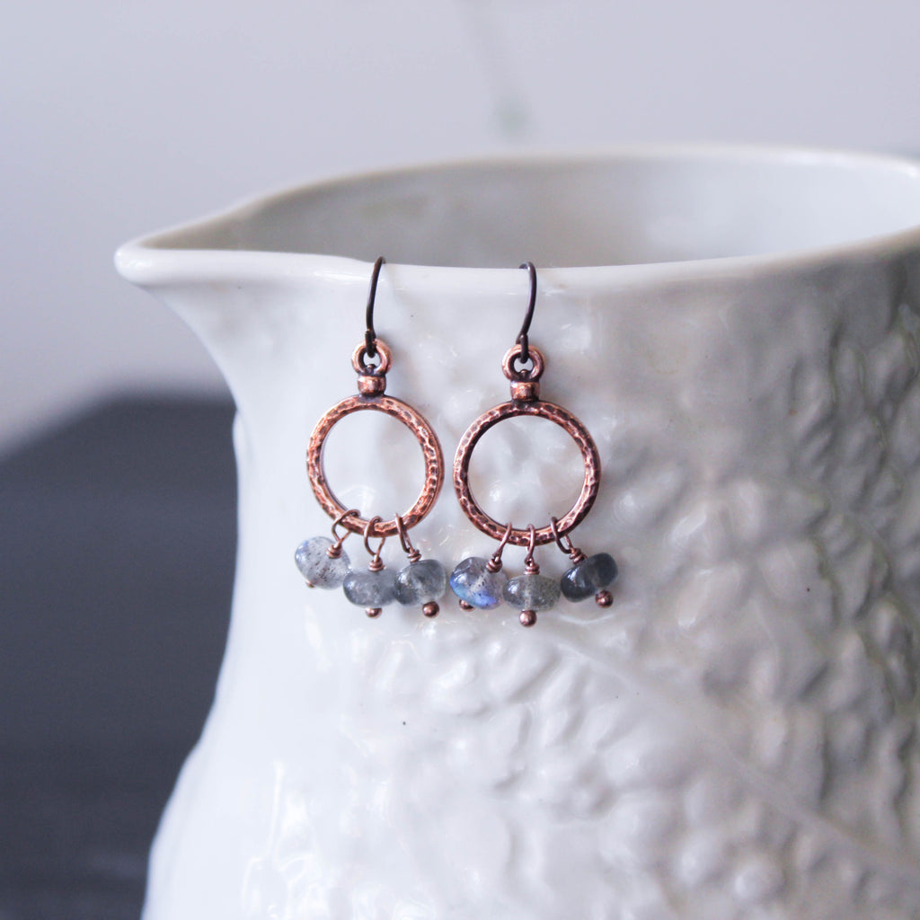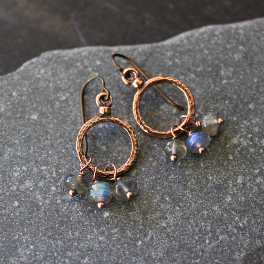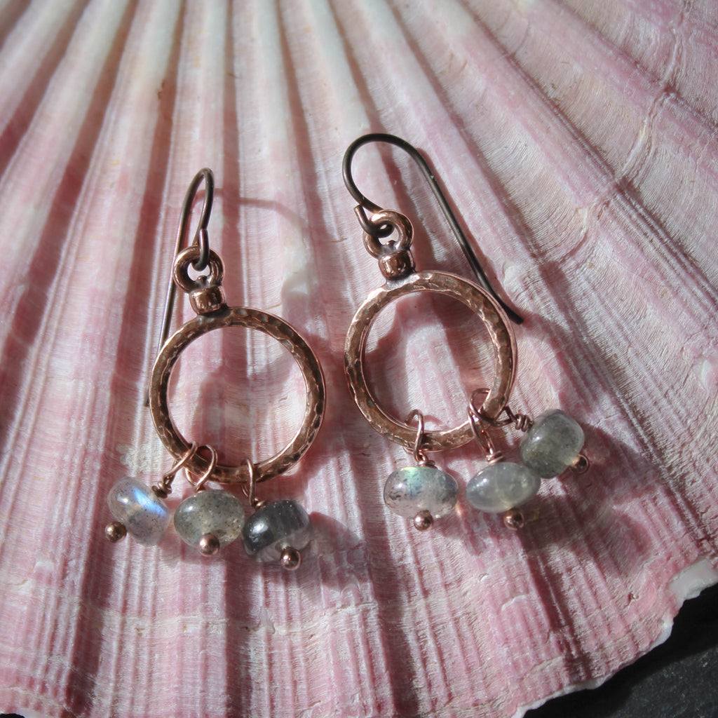 Delicate copper-plated hoops are embellished with tiny, iridescent labradorite tassels.