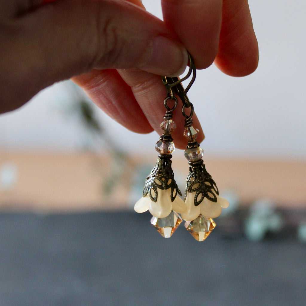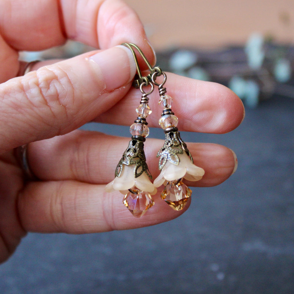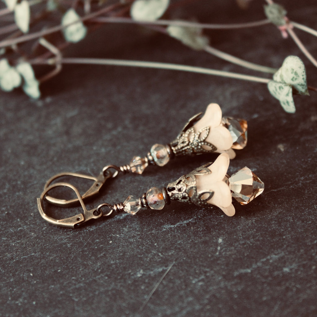 These magical flowers are perfect everyday earrings, inspired by the pale pastel hues of the magical hellebore flower--an ingredient in witches flying ointment.