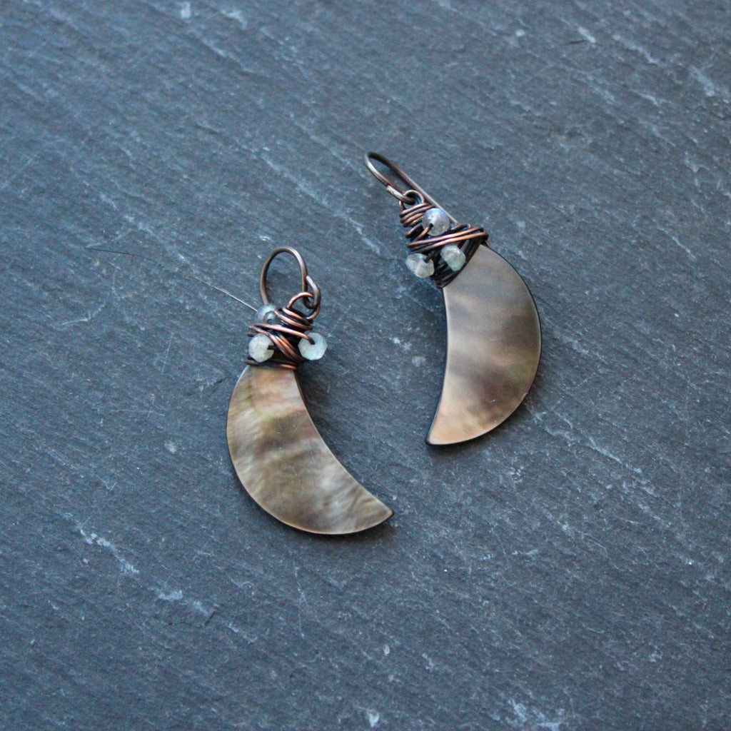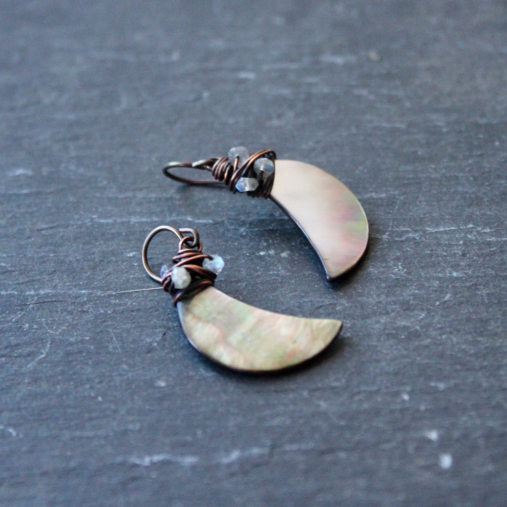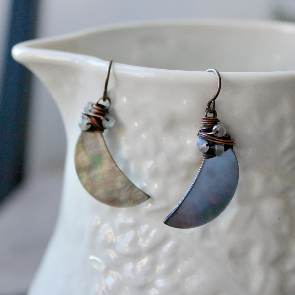 Shadow Moon Earrings with Labradorite and Shell. Hypoallergenic.