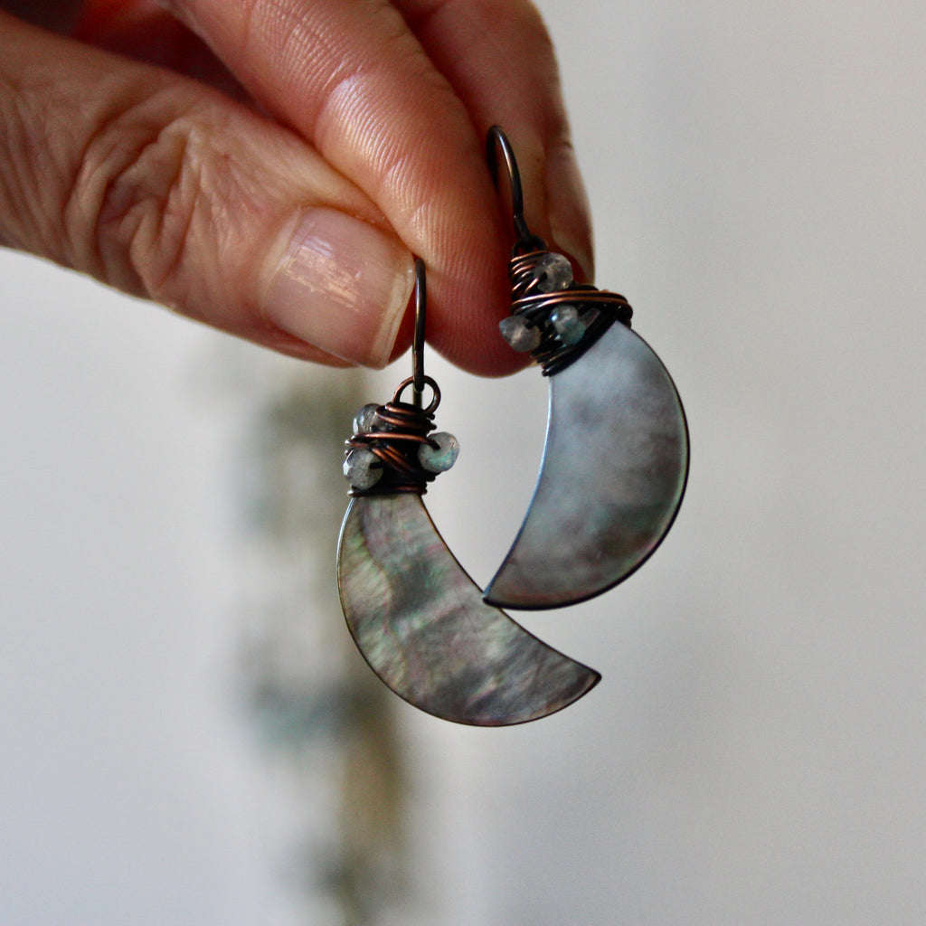 Moody shell moon earrings topped with clusters of faceted labradorite hang from hypoallergenic niobium ear wires.