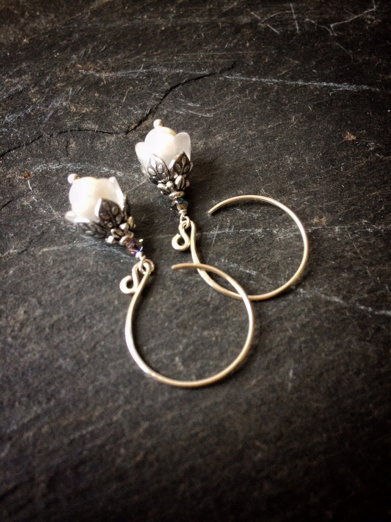 These earrings are made of Swarovski pearls, lucite petals and ornate, sterling-silver plated brass caps. They hang from sterling plated brass lever back ear wires. These wires can be switched to hypoallergenic niobium free of charge. If you would like hand-forged sterling silver ear wires in my "little cobra" shape (see 2nd photo), I can make those up for you for an extra 5 pounds. Just let me know if you would like either option using the drop-down menu at checkout.