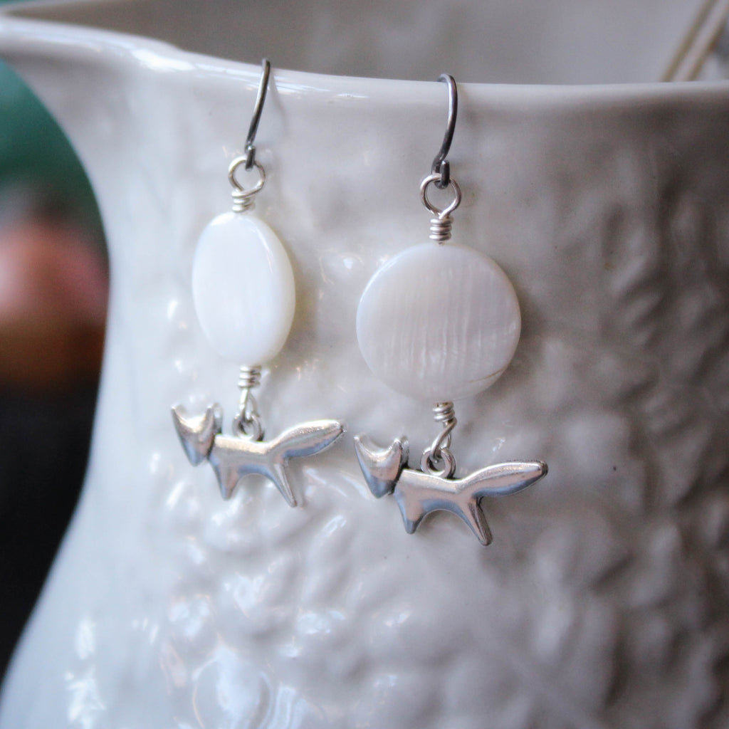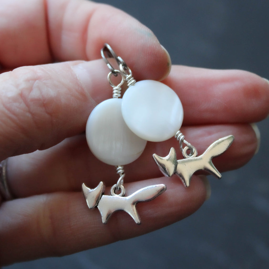 A pair of tiny silver-coloured foxes beneath mother of pearl moons make up these cute everyday earrings.
