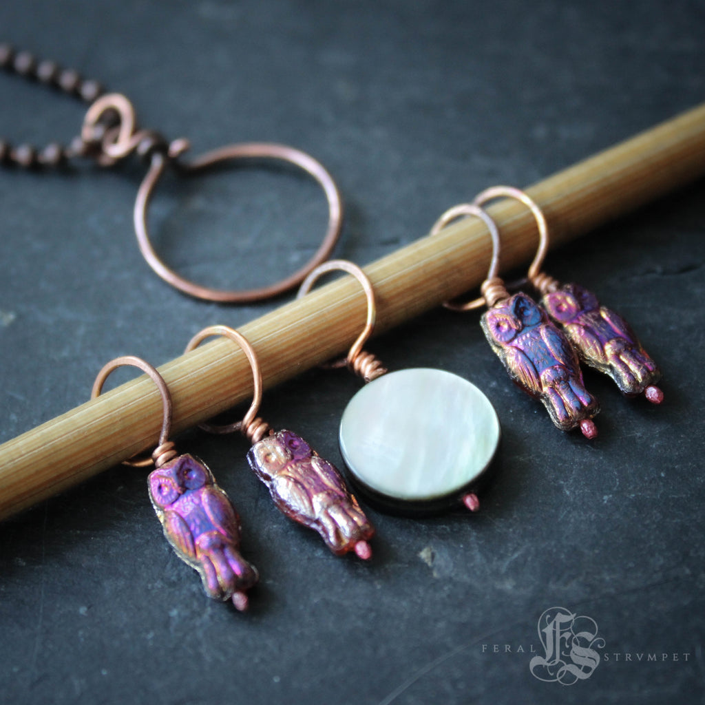 Glistening, iridescent glass owls and a little shell moon help you sort your stitches. This unique stitch marker set features five, snag-free stitch markers.