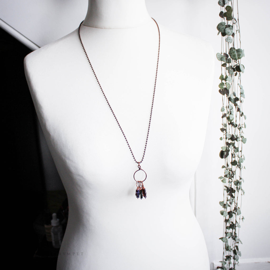 - Necklace measures 30" length and the chain is copper plated steel ball chain