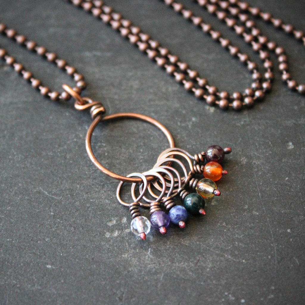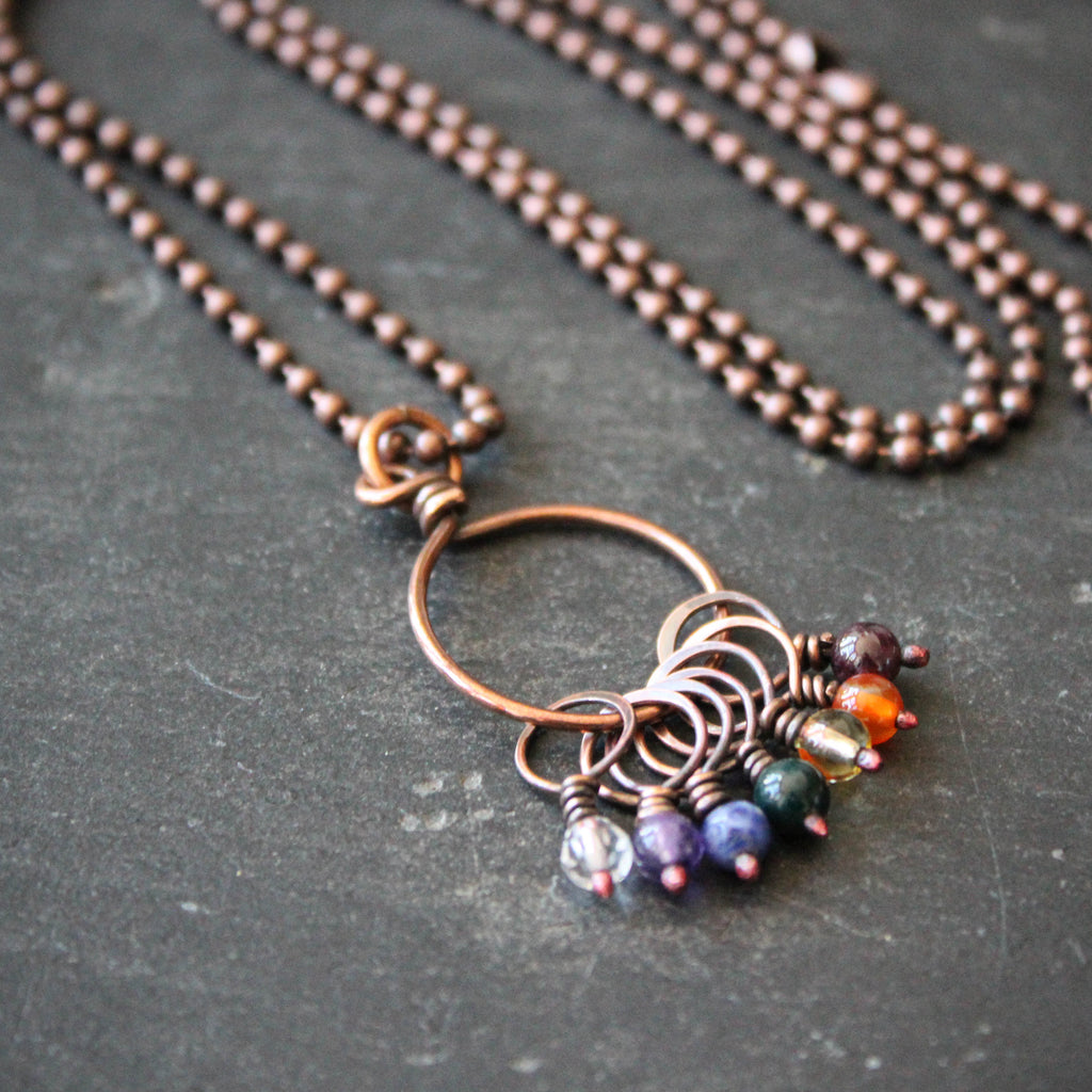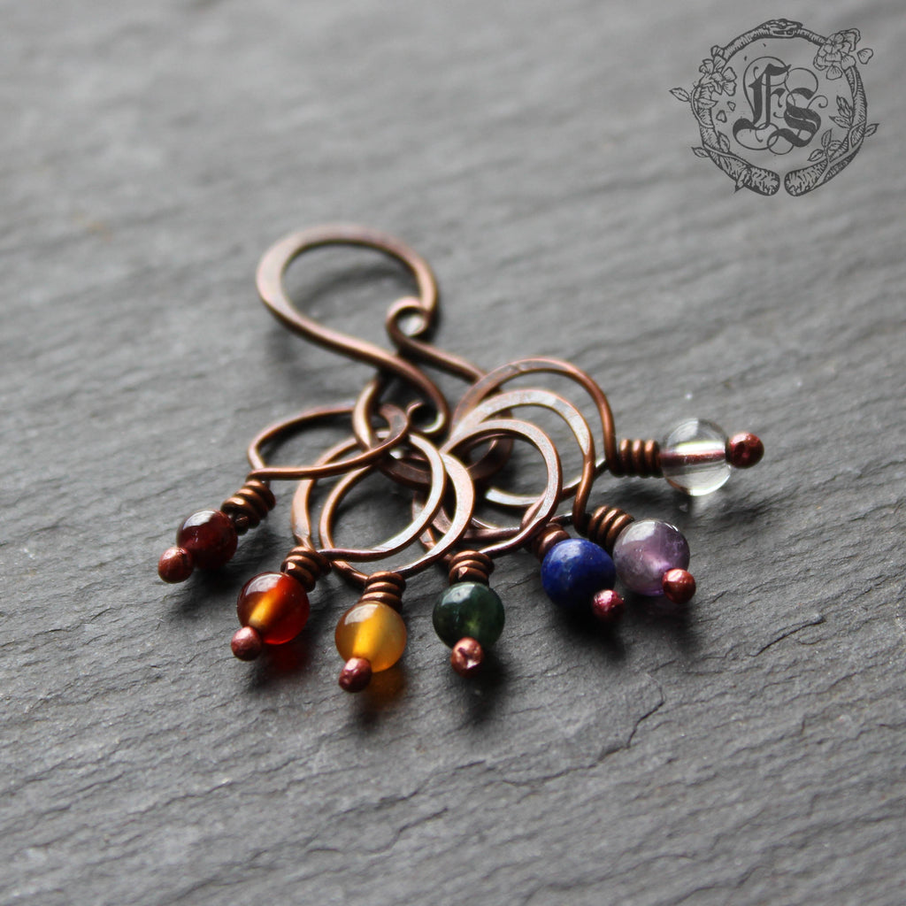 The seven stones are chosen to correspond the the chakras-- Garnet for the base chakra, carnelian for the creative centre or second chakra, pale agate for the solar plexus, moss agate for the heart chakra, lapis lazuli for the throat chakra, amethyst for the third eye and clear quartz for the crown chakra.