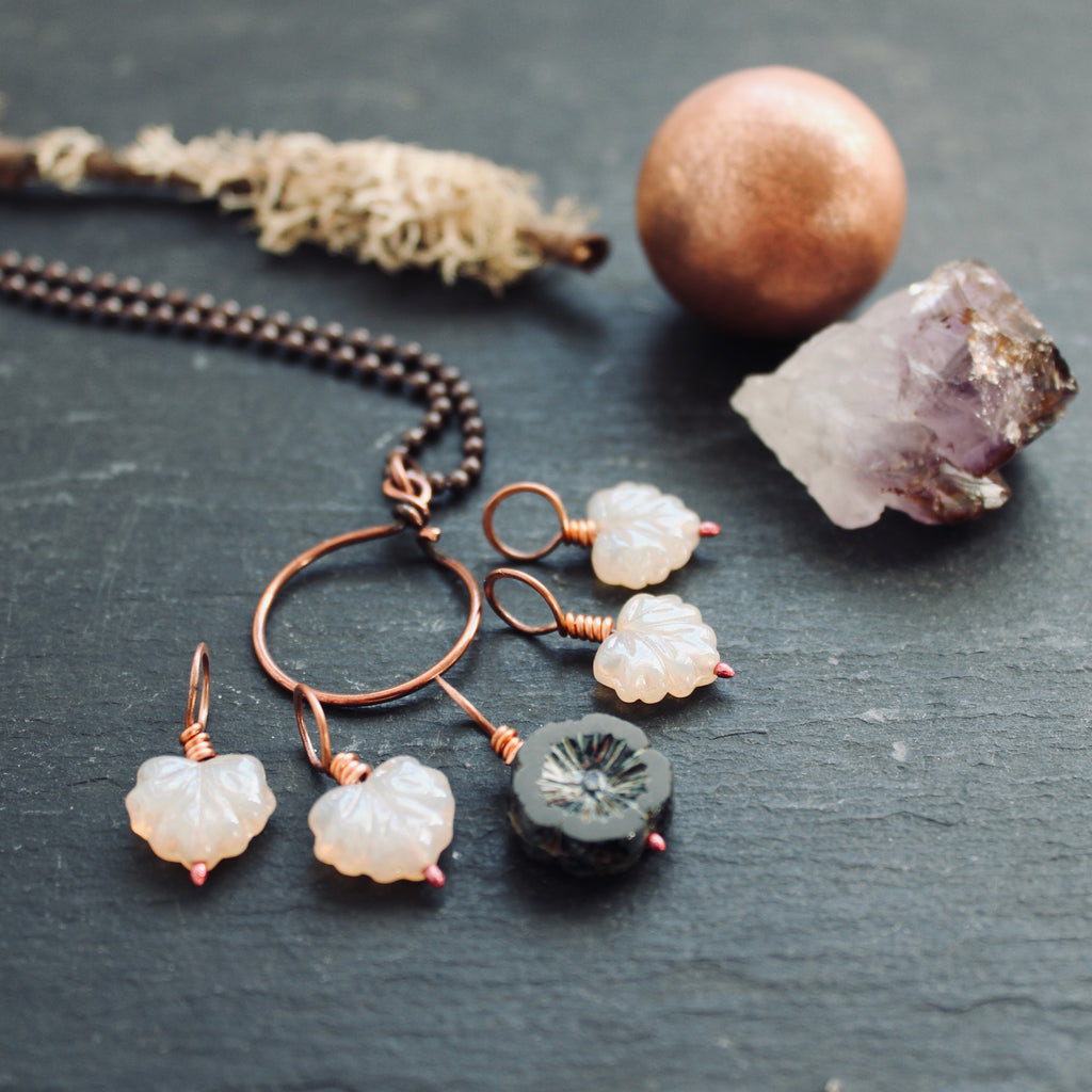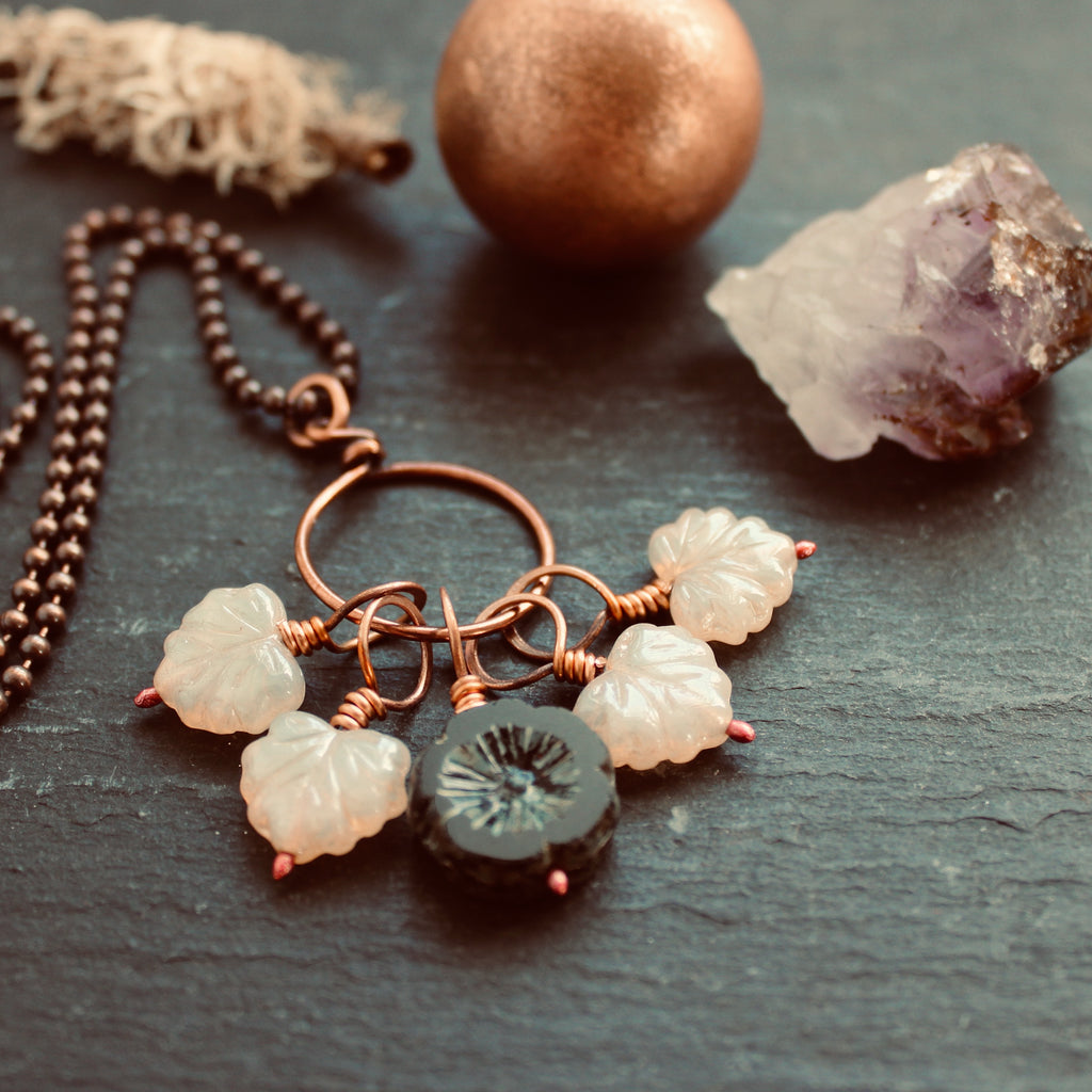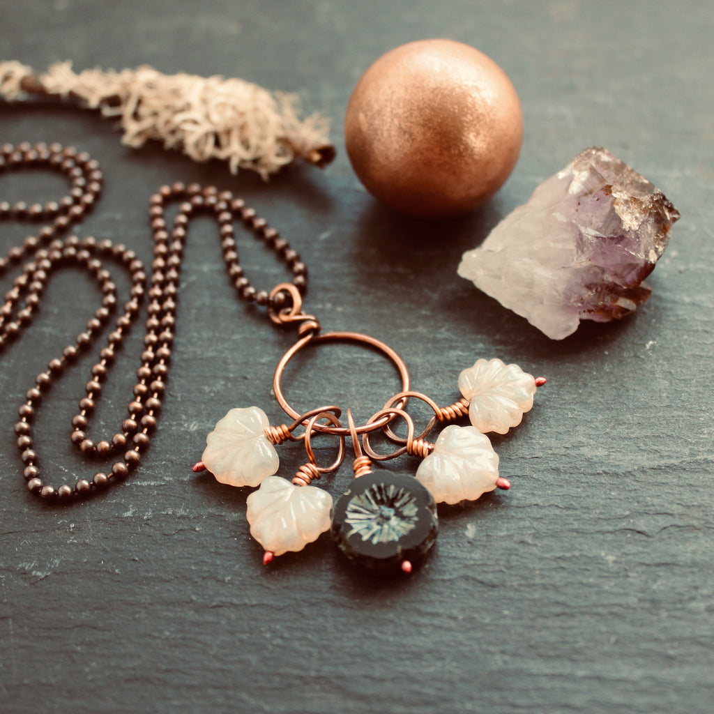- With Picasso finished Czech glass leaves and a table cut Czech glass flower