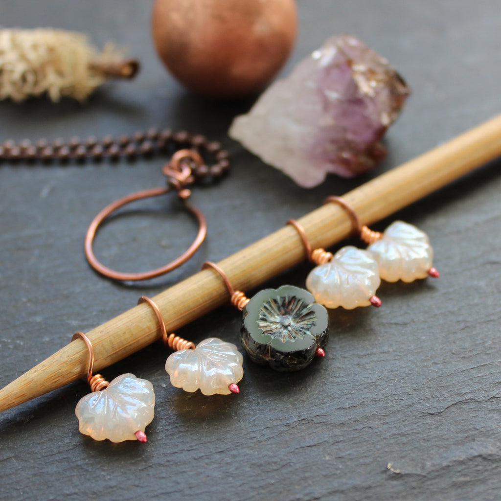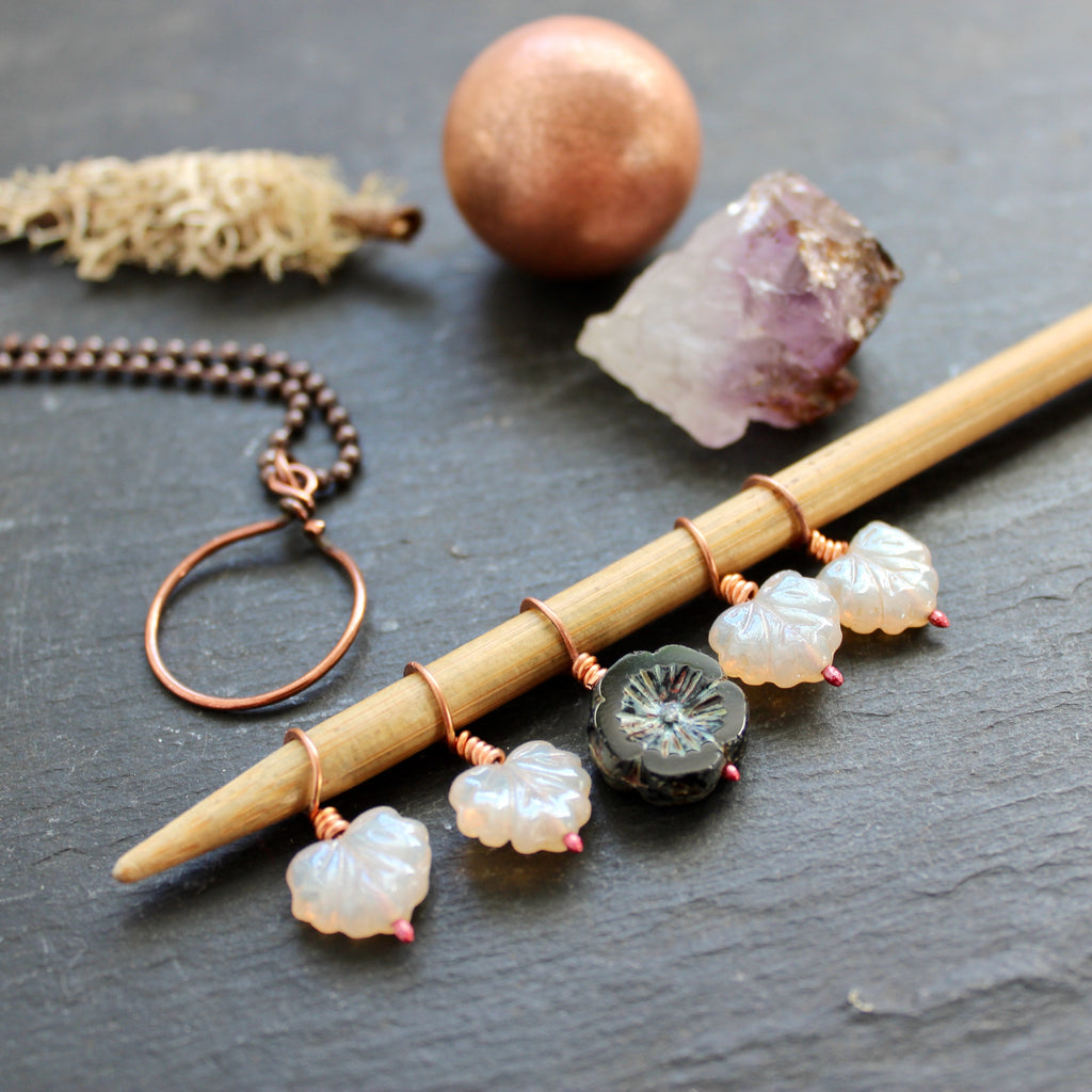 A moody and elegant necklace of five stitch markers help you sort your stitches.