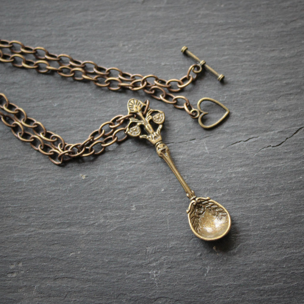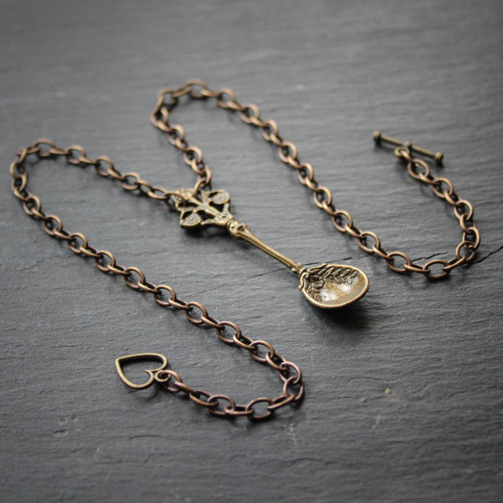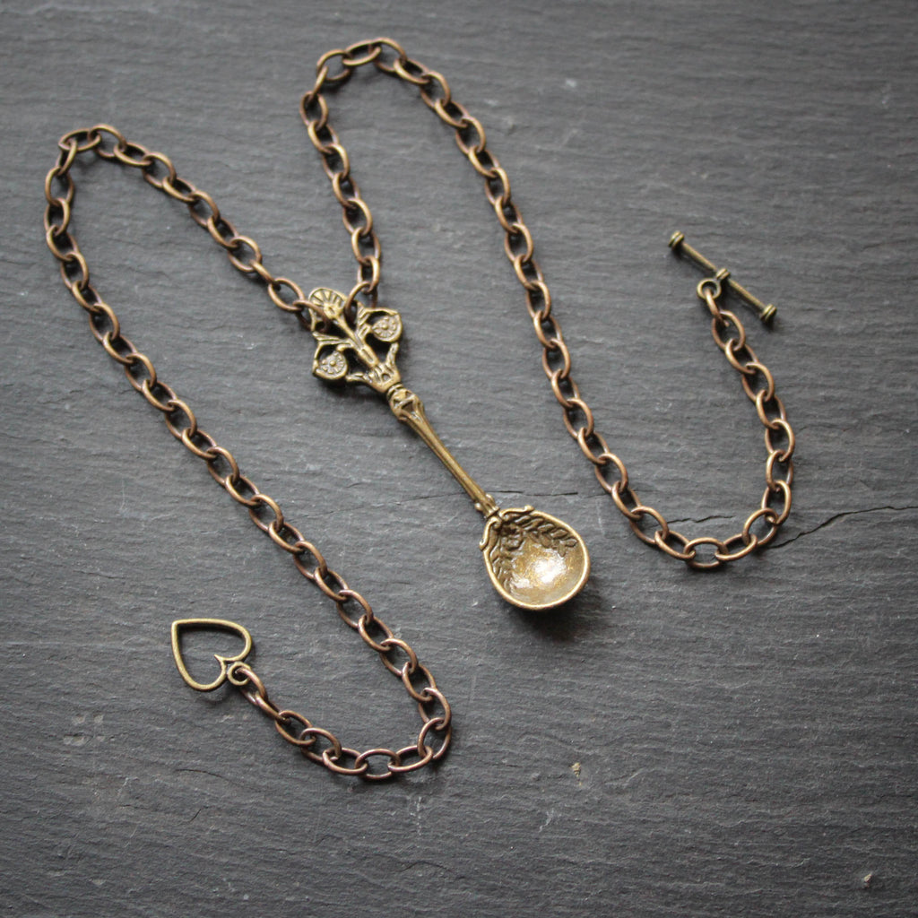 - The necklace features a Victorian embellished spoon hanging from a chain with a pretty heart toggle clasp