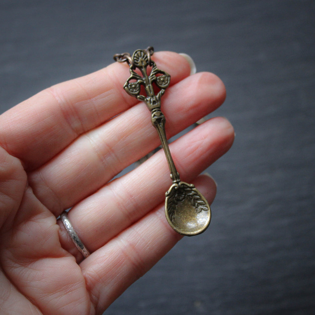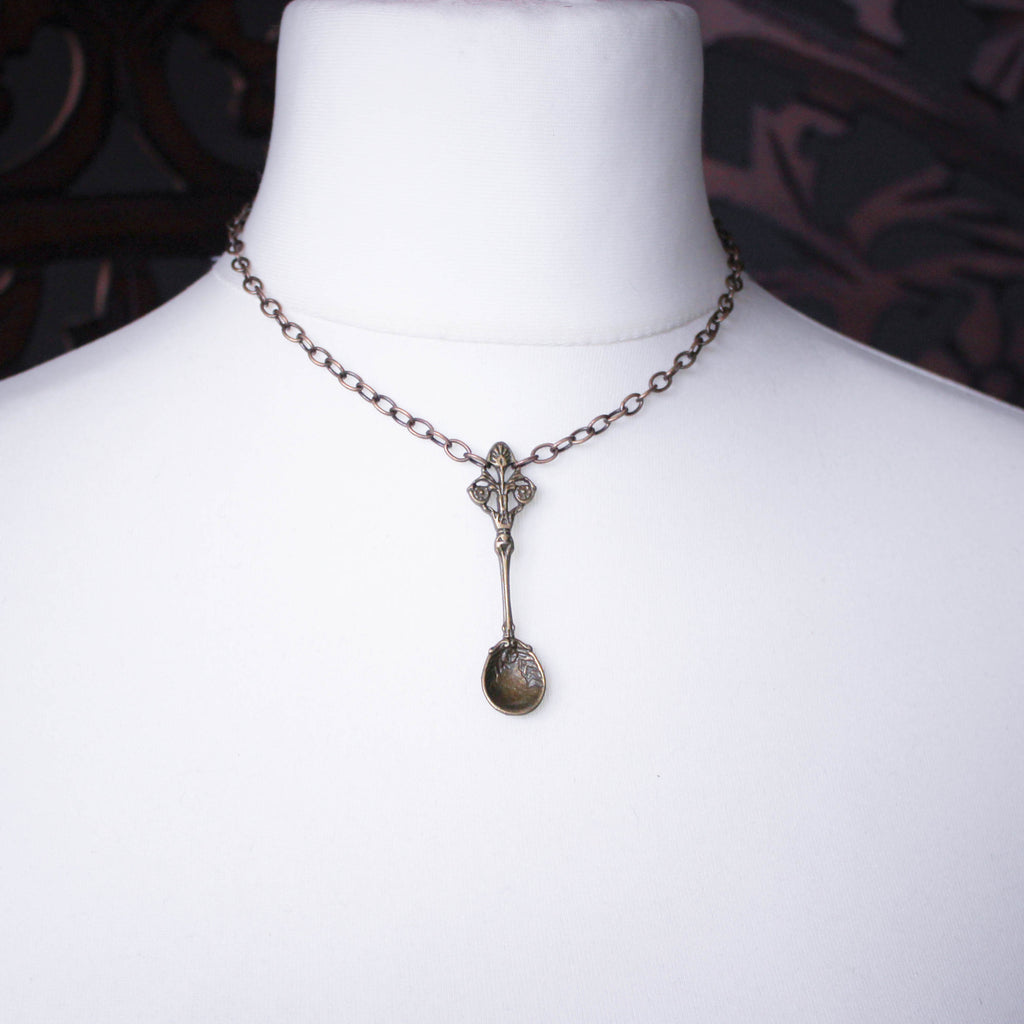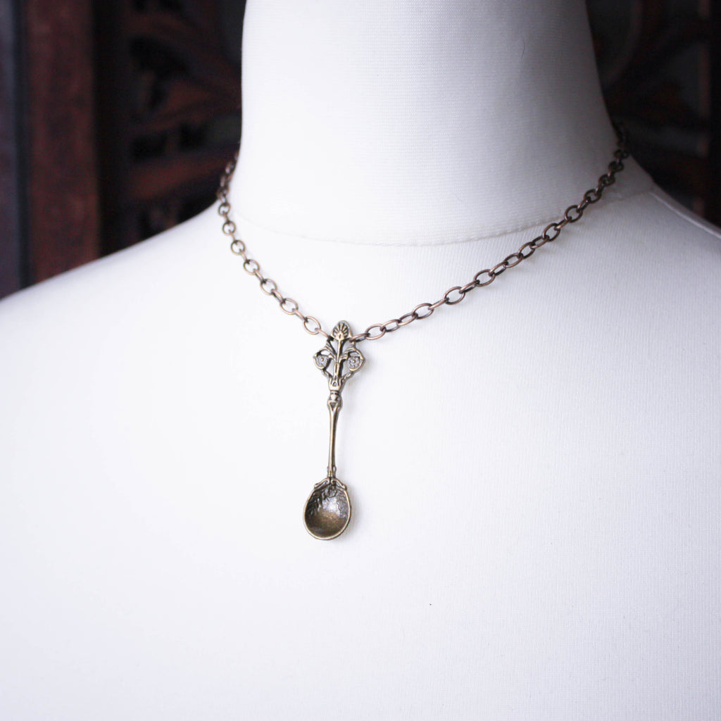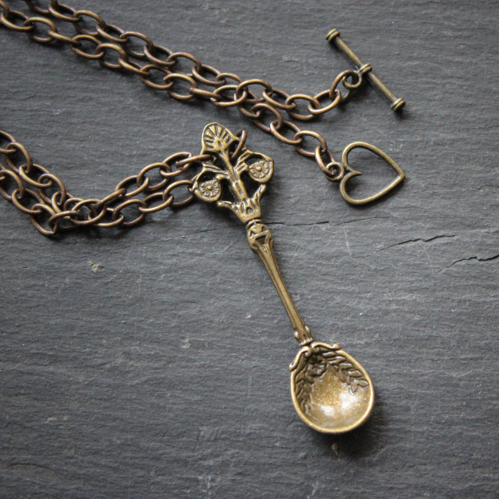 - The necklace features a Victorian embellished spoon hanging from a chain with a pretty heart toggle clasp