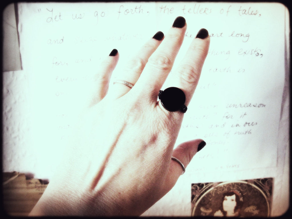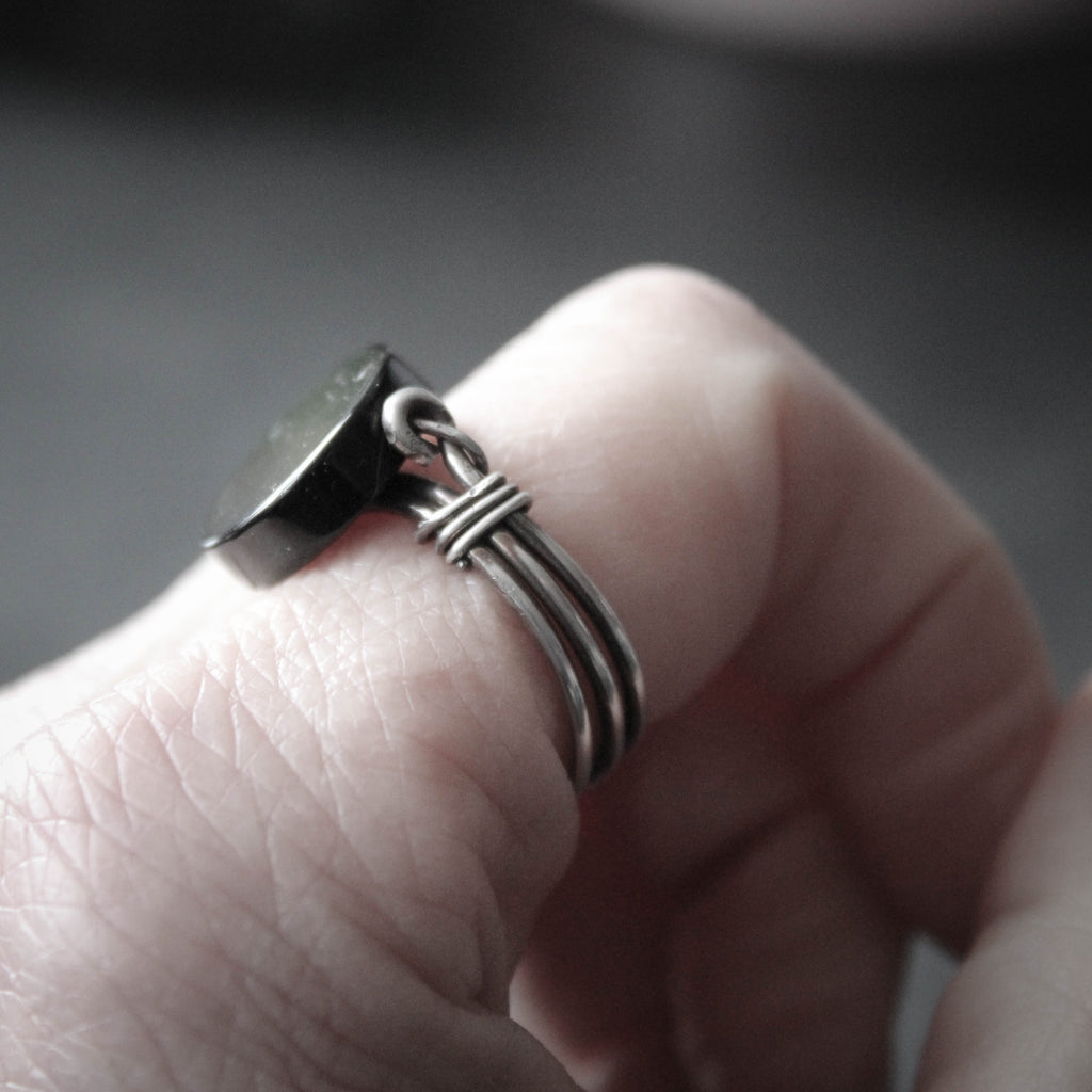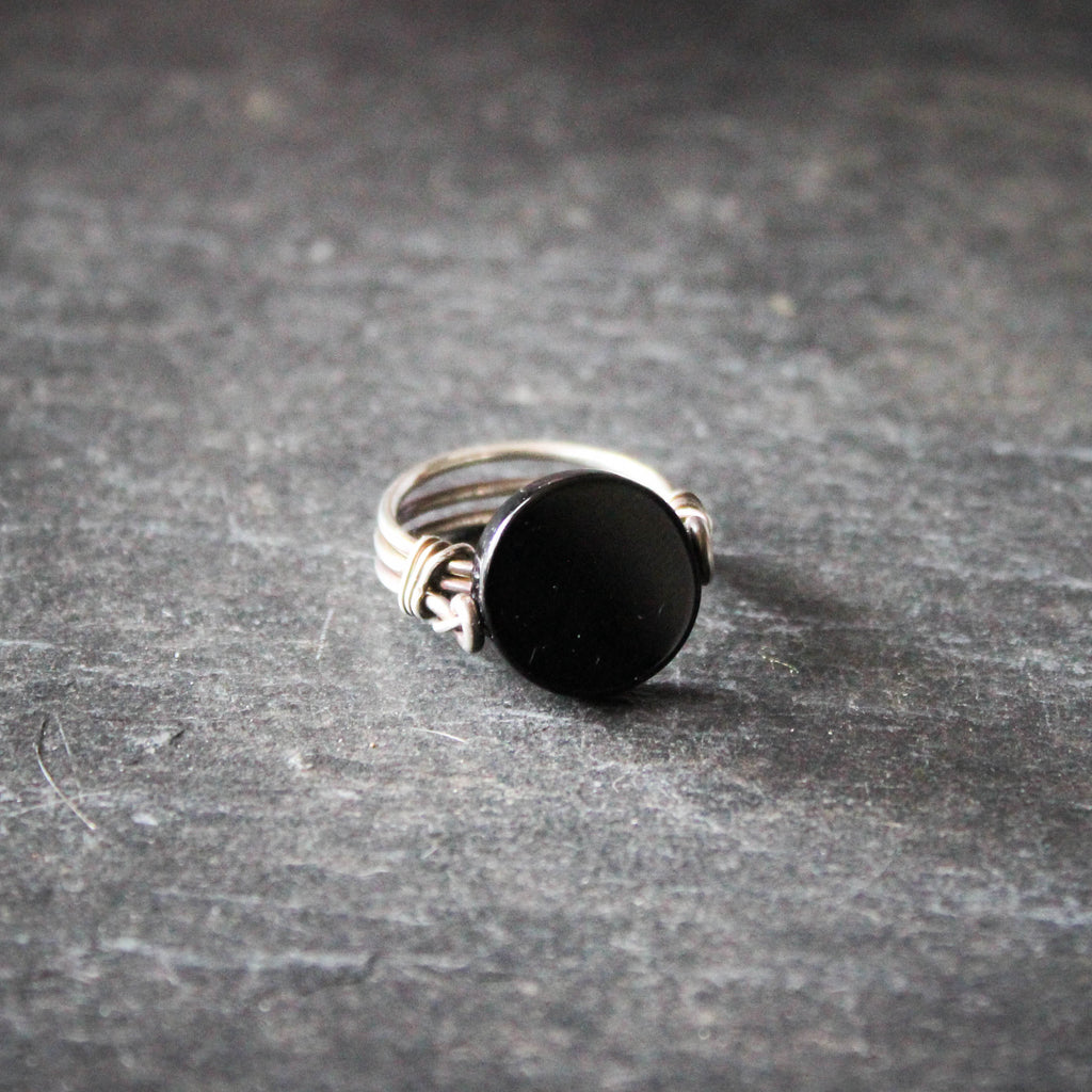 This ring is cold forged using sterling silver wire and a midnight black onyx stone disk. The ring is UK size L 1/2, which is equal to US size 6.