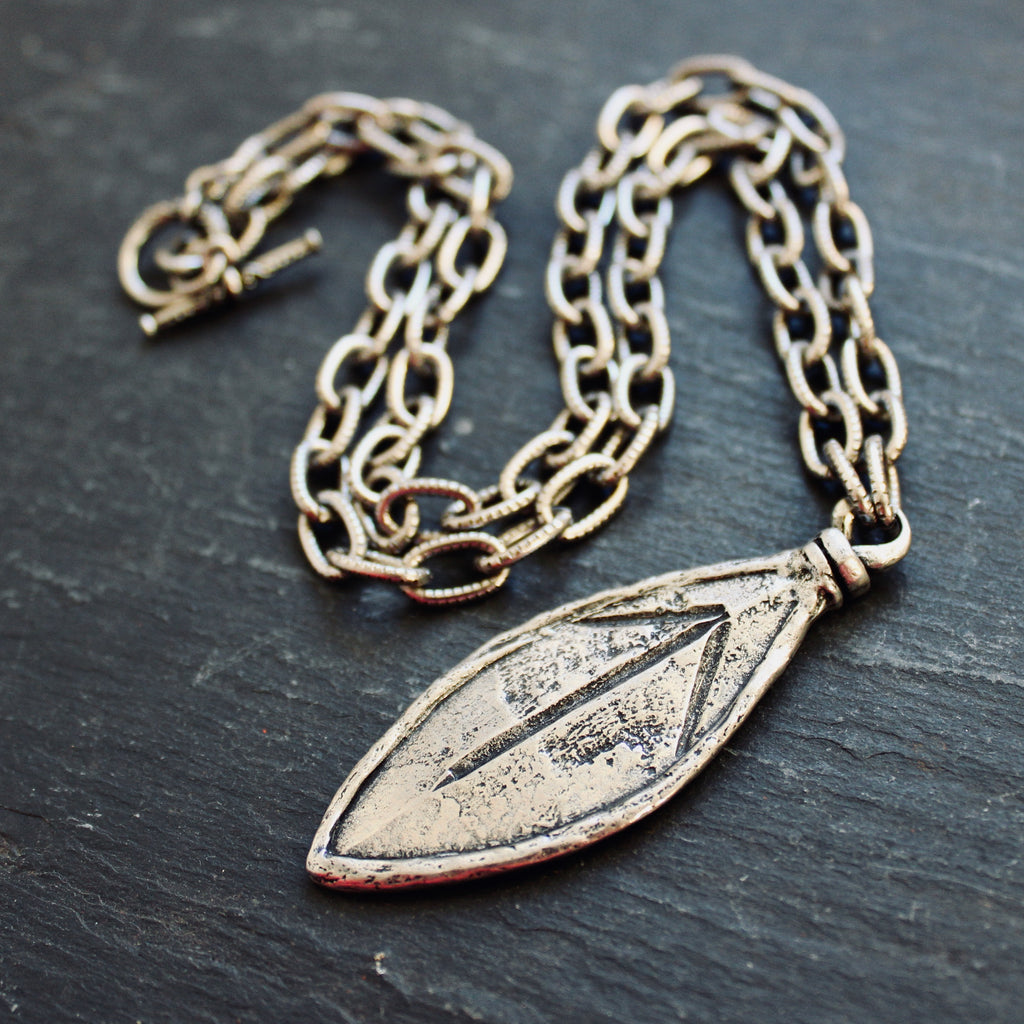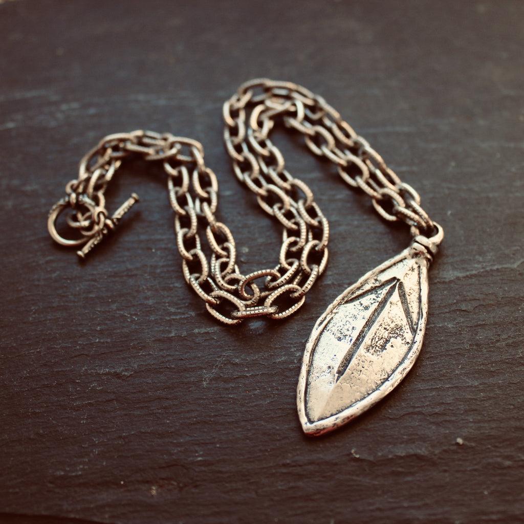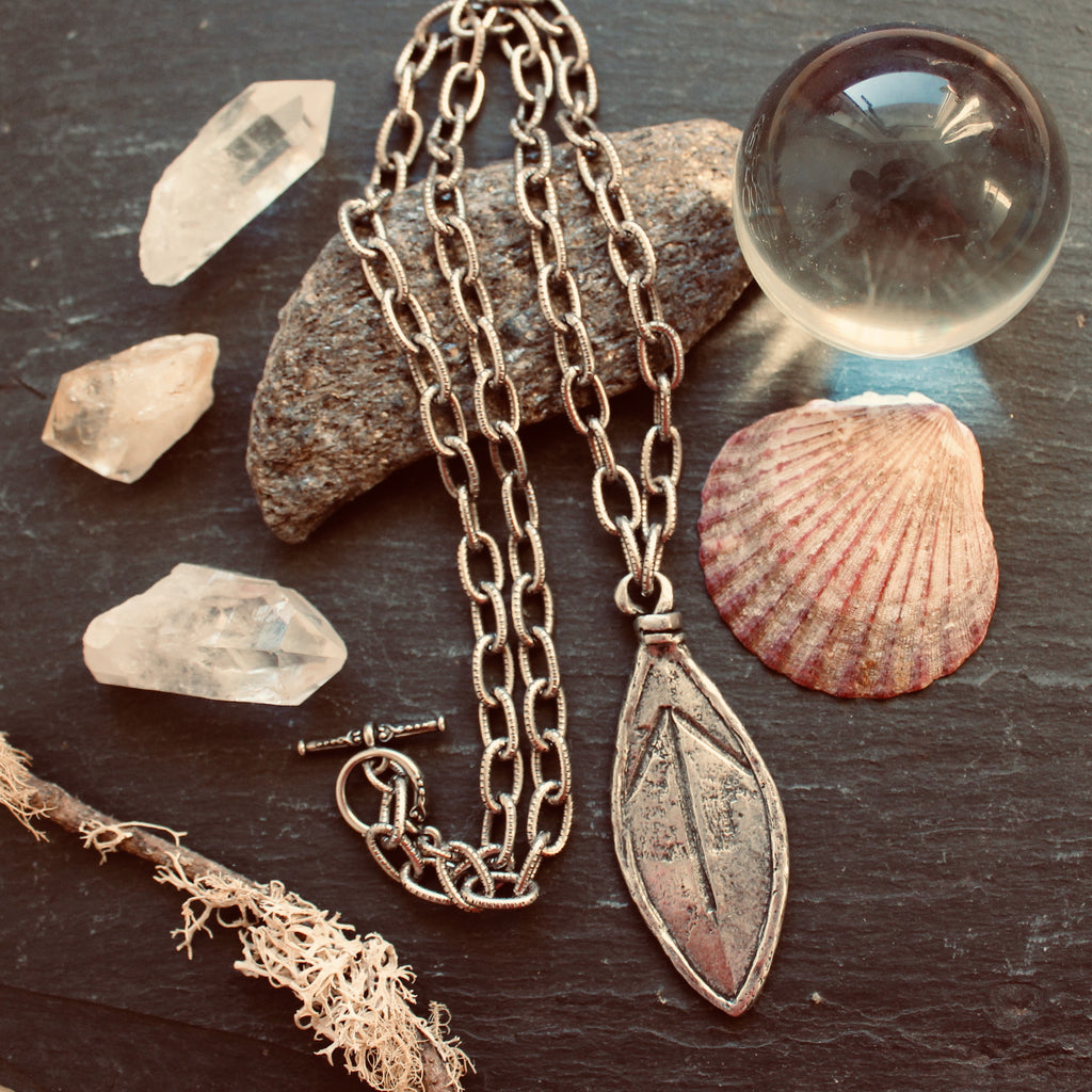 Rustic leaf-shaped talisman features the Tyr rune on a bold statement chain.