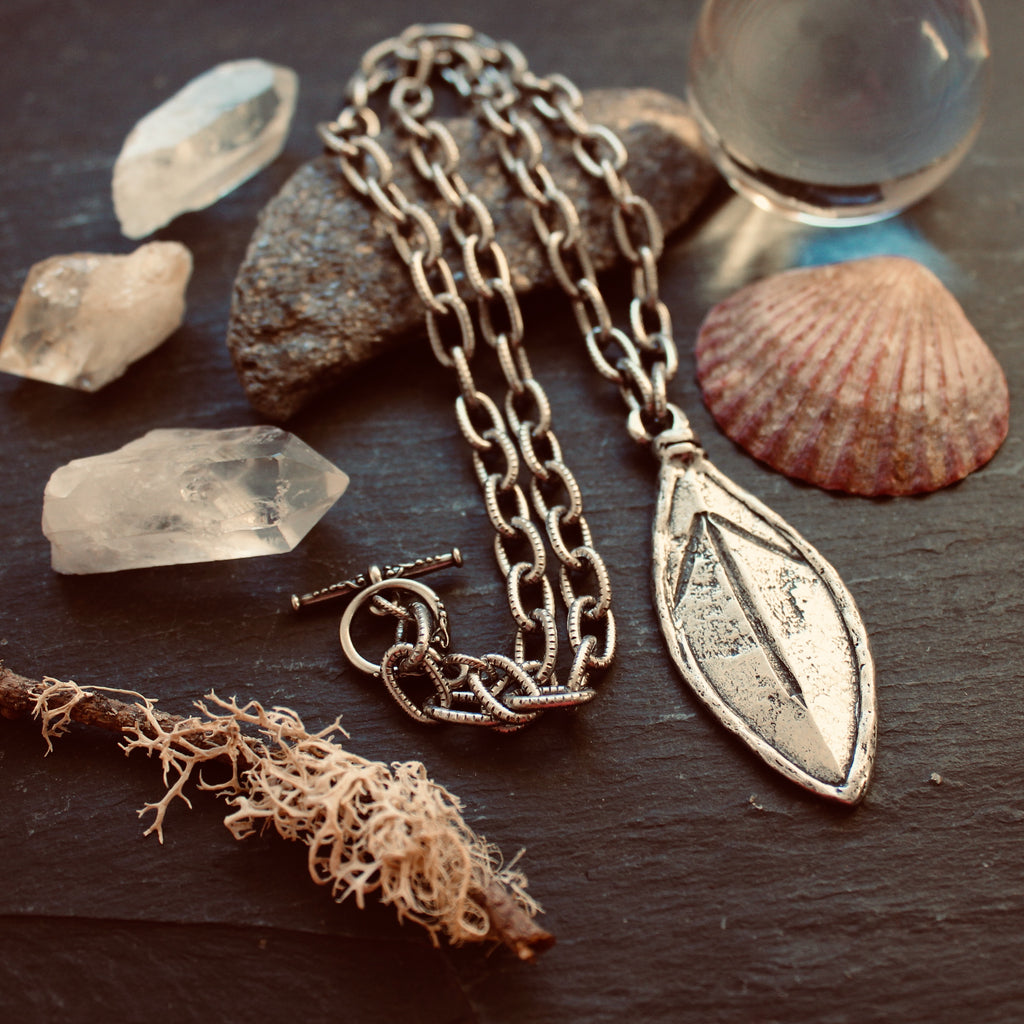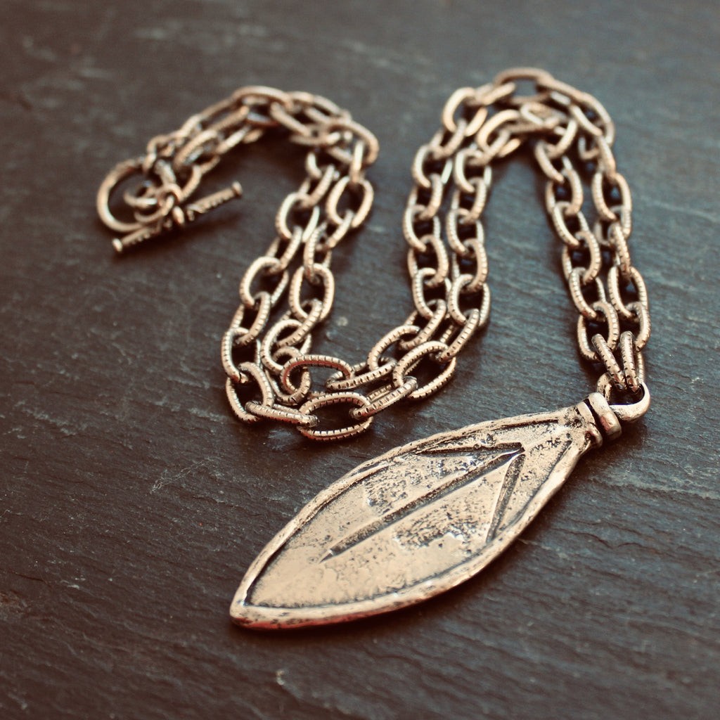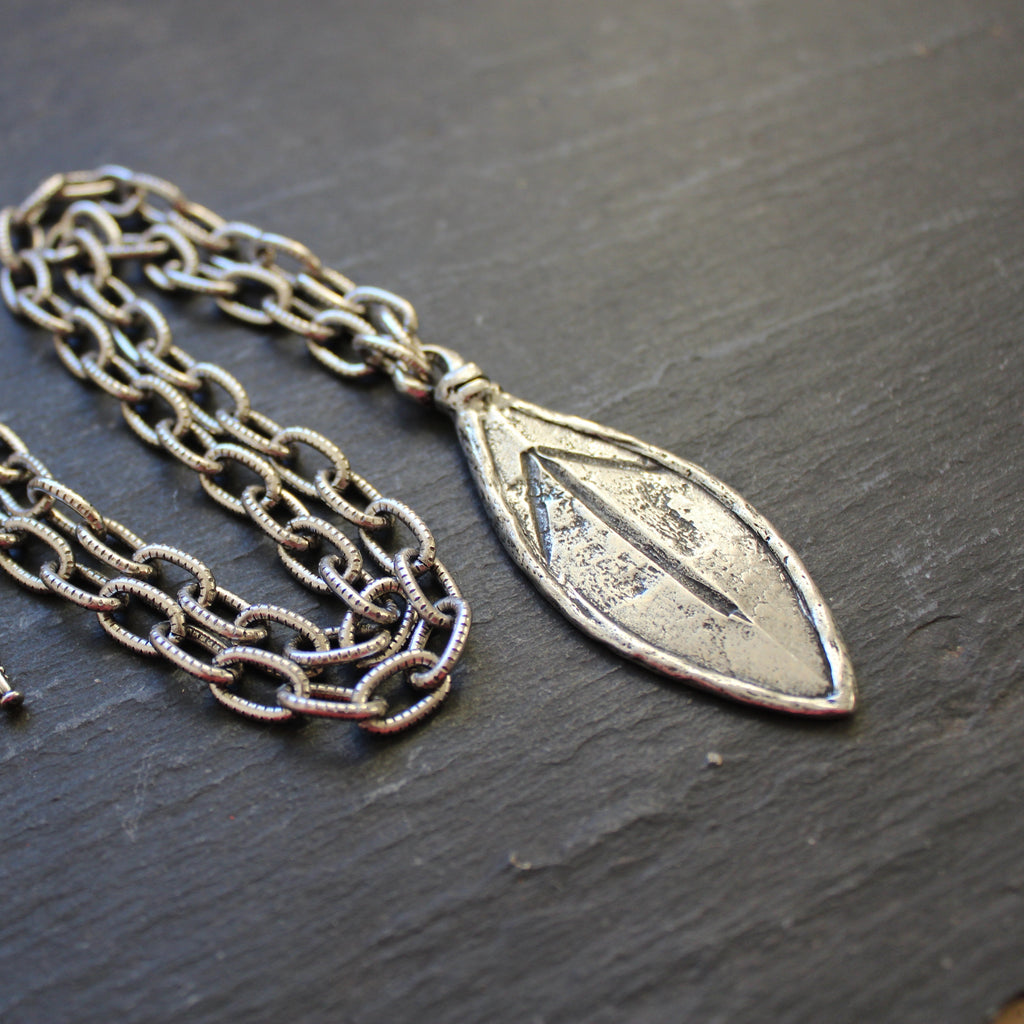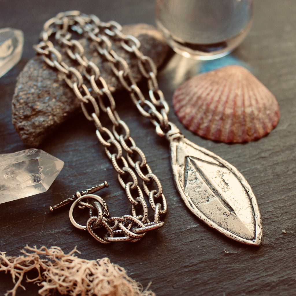 Rustic leaf-shaped talisman features the Tyr rune on a bold statement chain.
