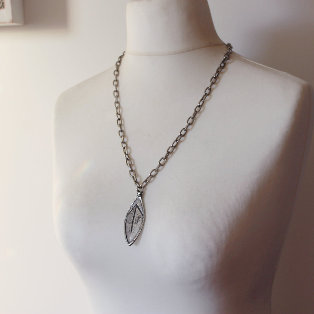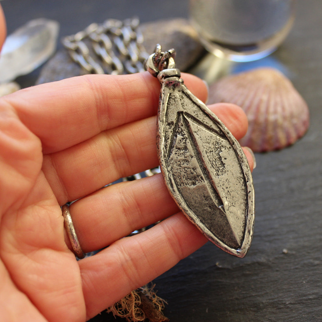 - A rustic, weighty pendant made of silver plated pewter