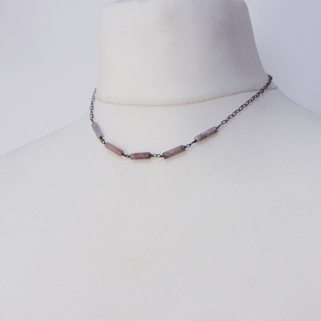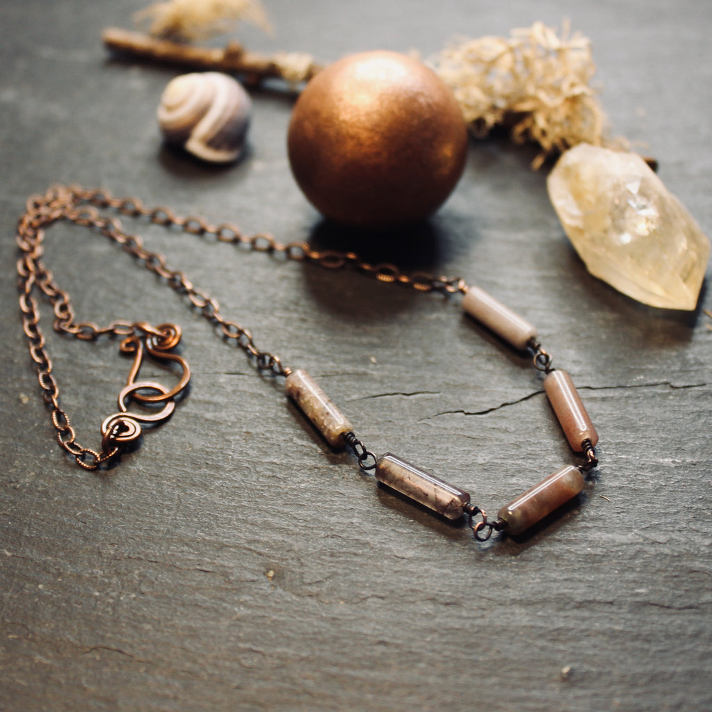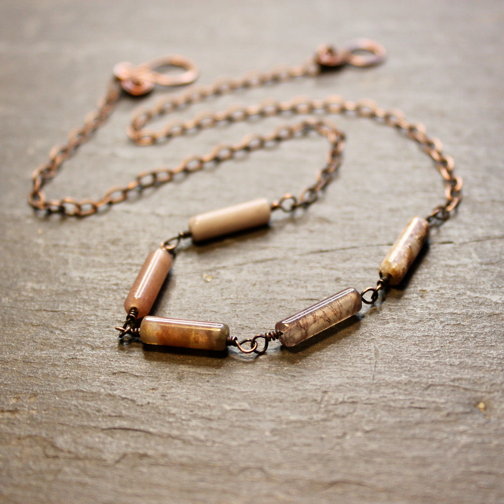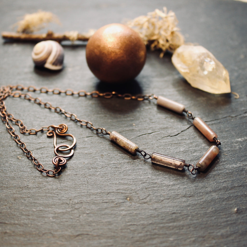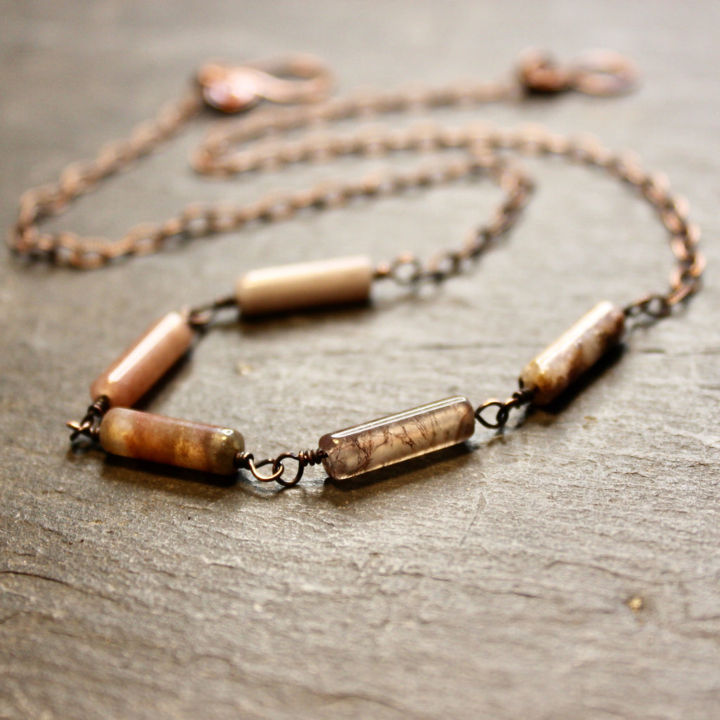 - Wire wrapped stone links hang from a delicate copper plated brass chain