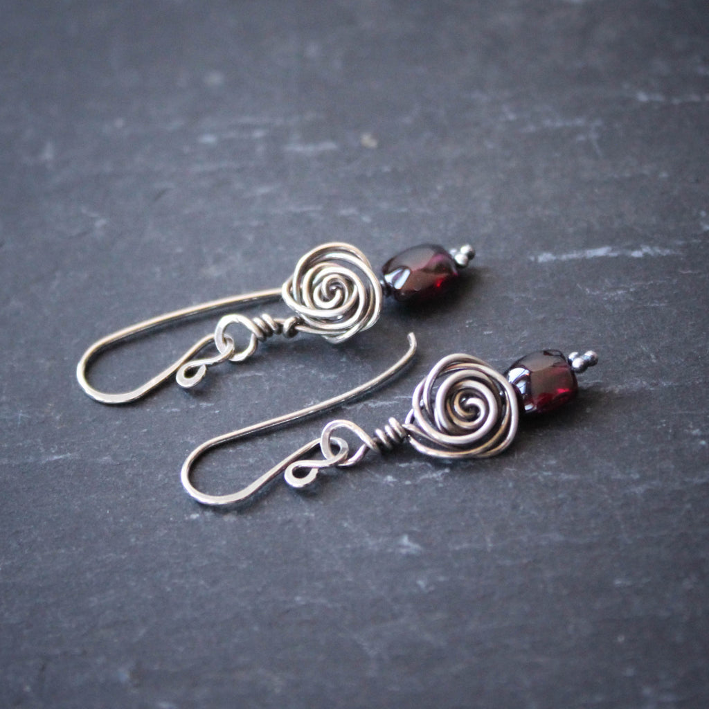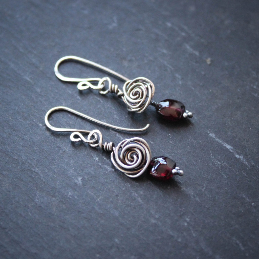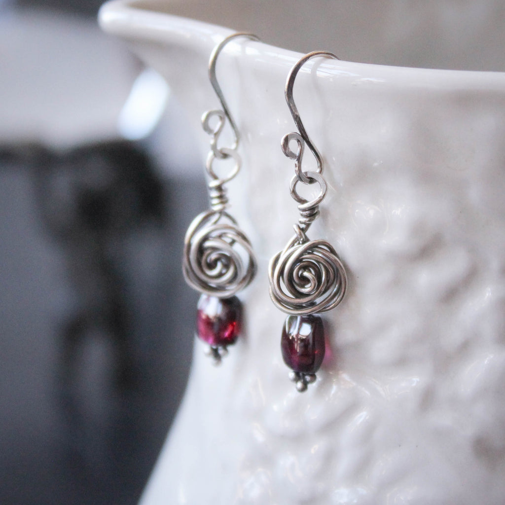 Sterling Silver Glasgow Rose Earrings with Garnets