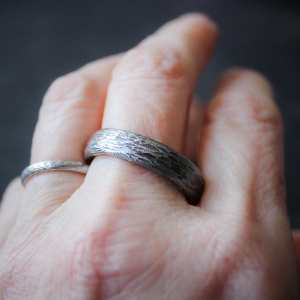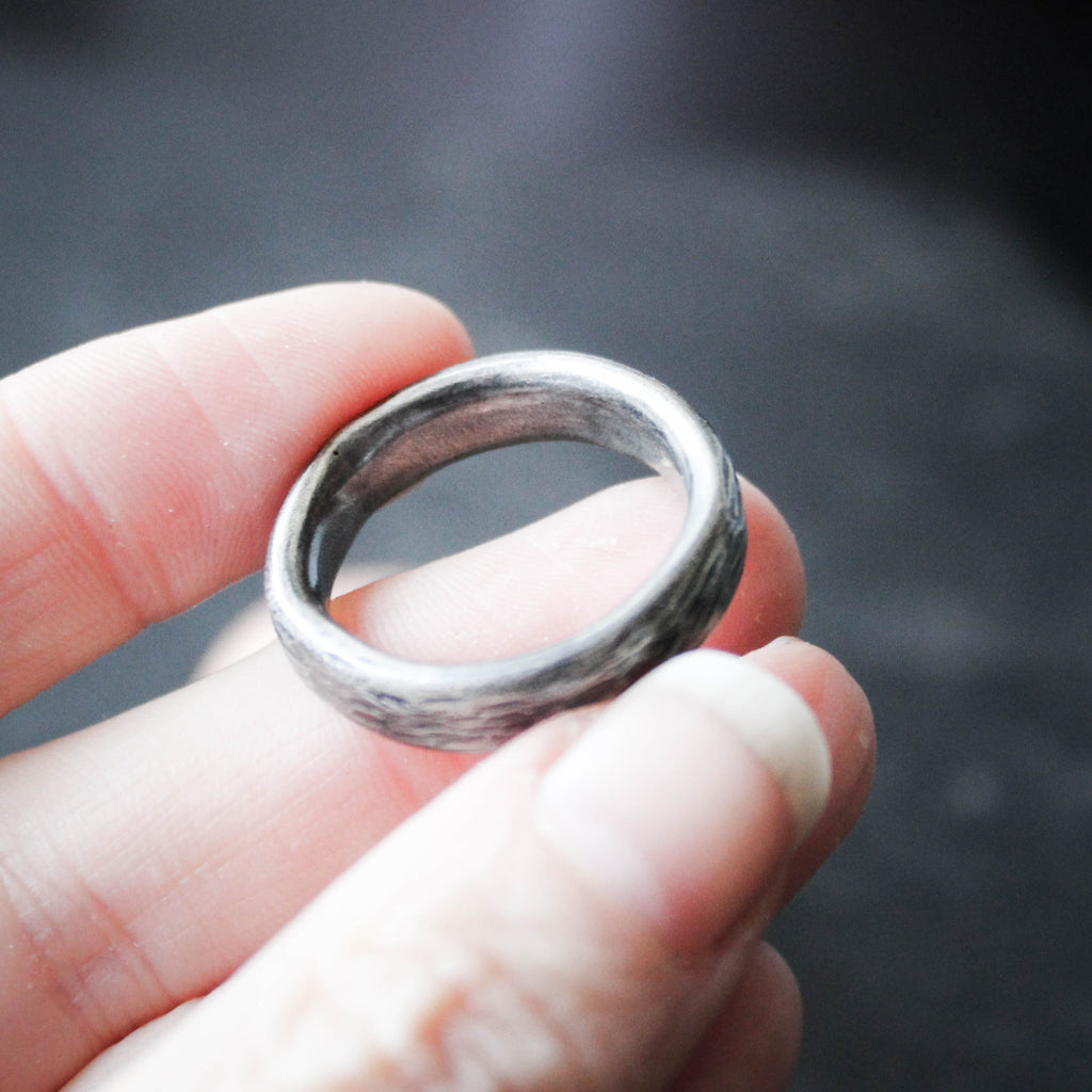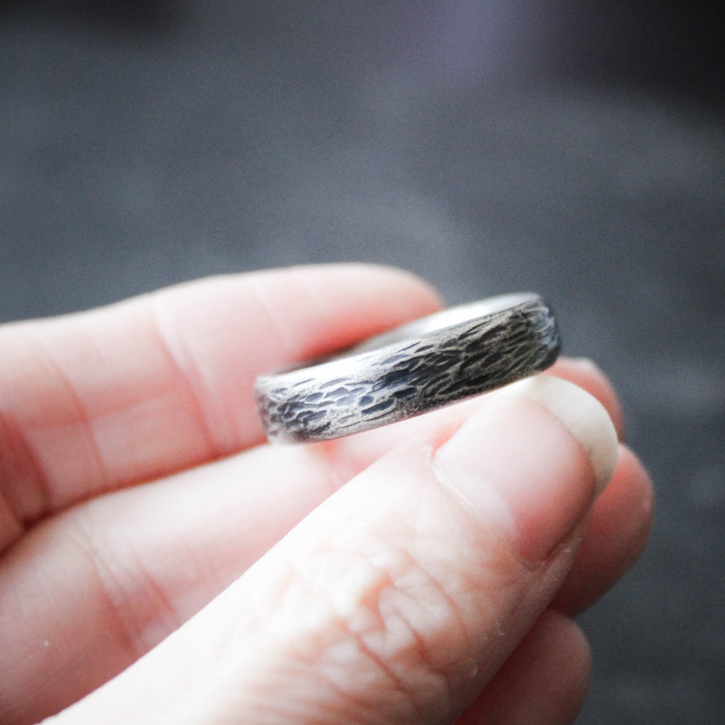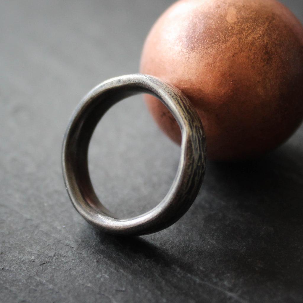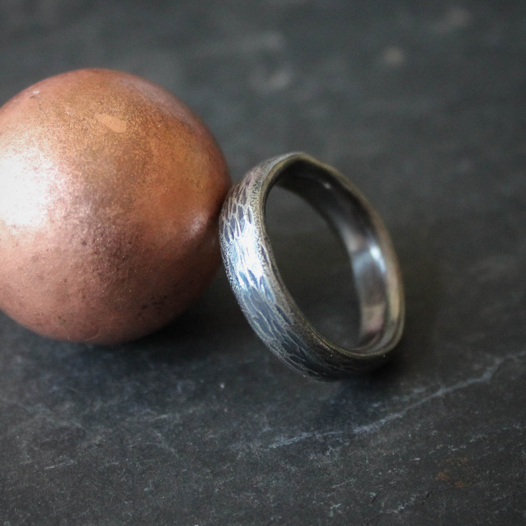A substantial, rustic band hand forged in sterling silver, hammered with a wind motif-- resembling waves blown by a Northerly-- something we see a lot here in the North of Scotland!
