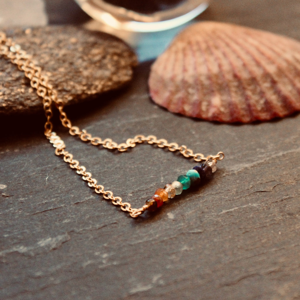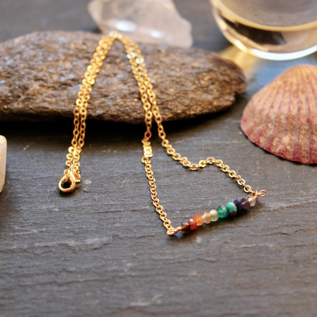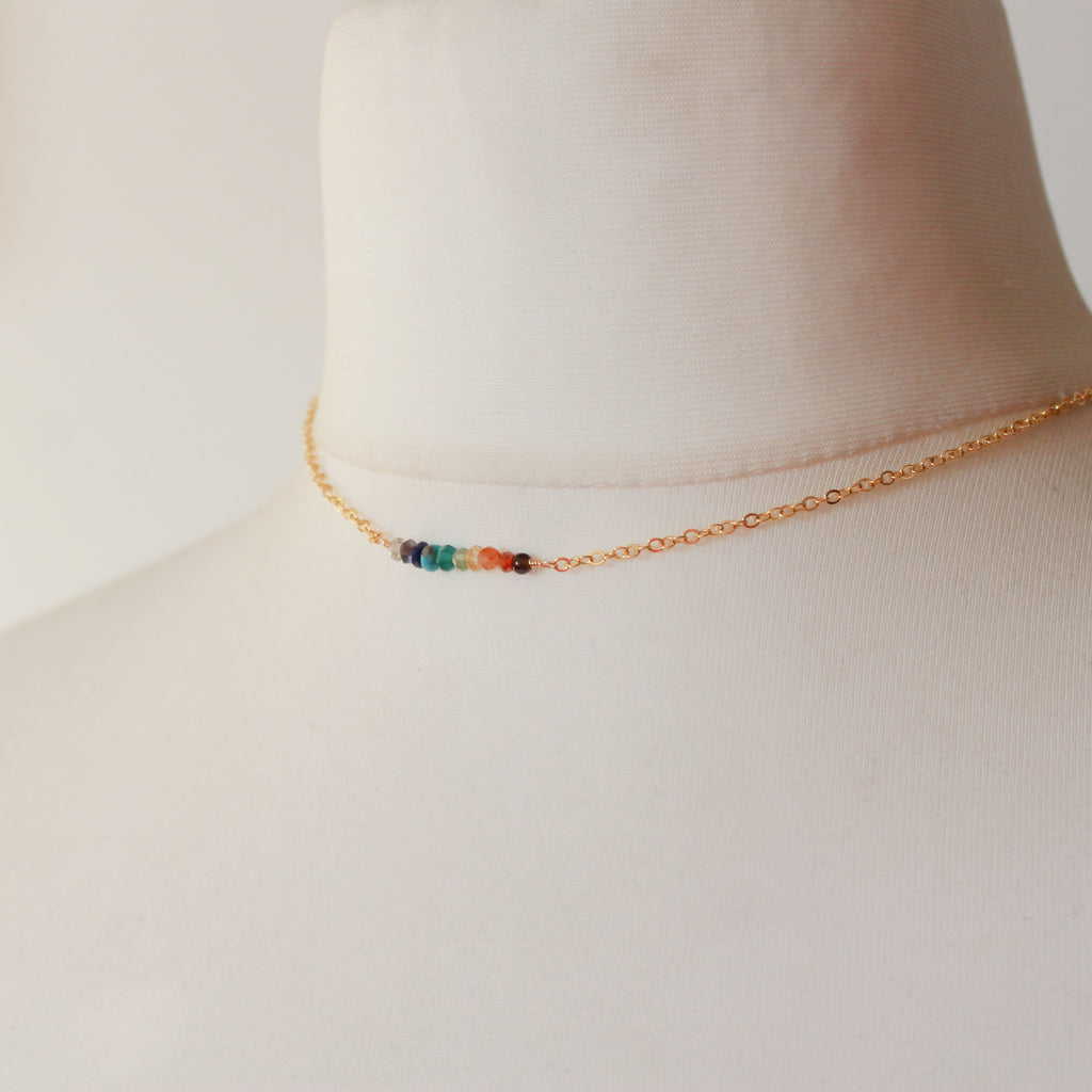 - Tiny collection of rainbow stones hangs from a 15" or 38.5cm gold plated chain