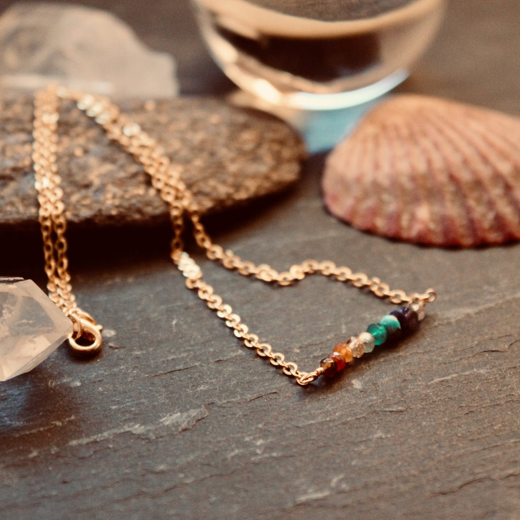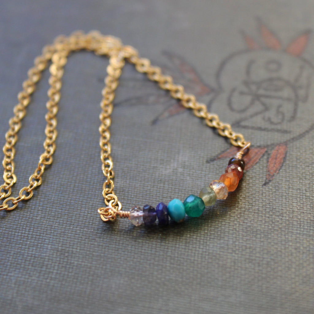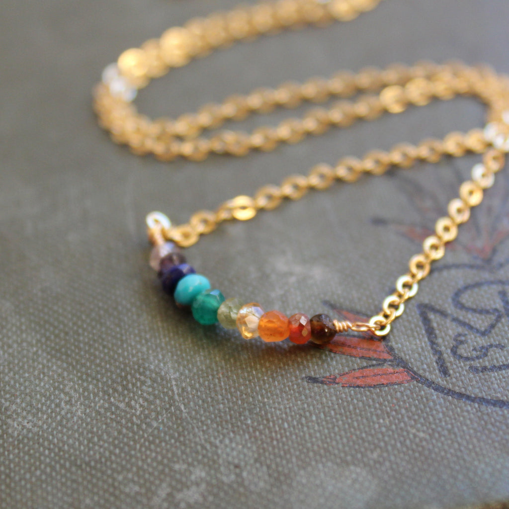 - Tiny collection of rainbow stones hangs from a 15" or 38.5cm gold plated chain