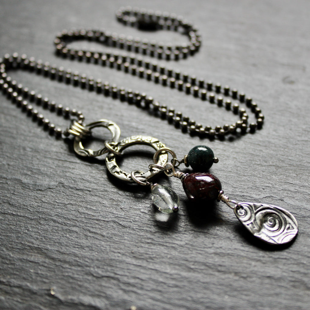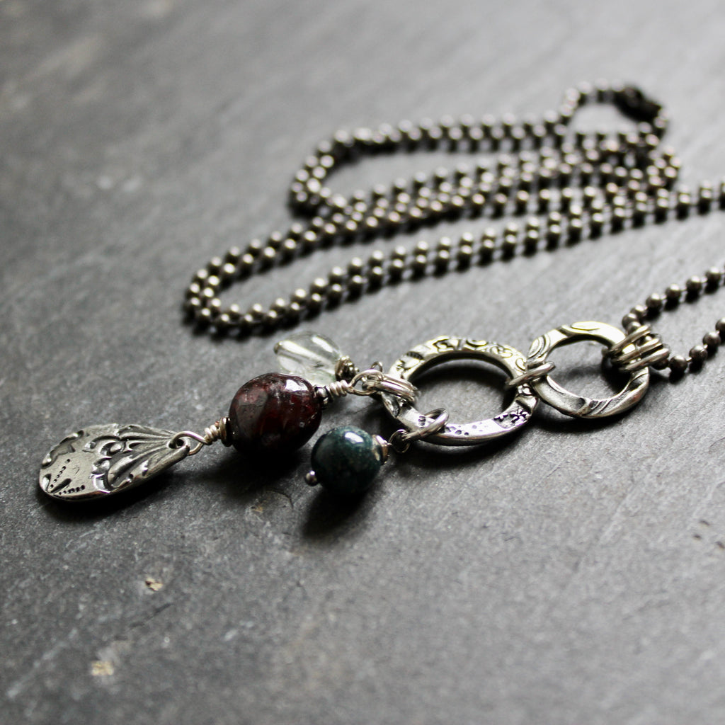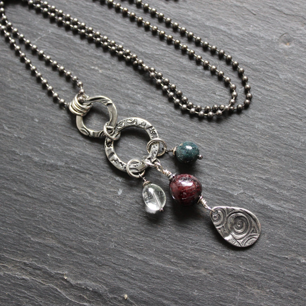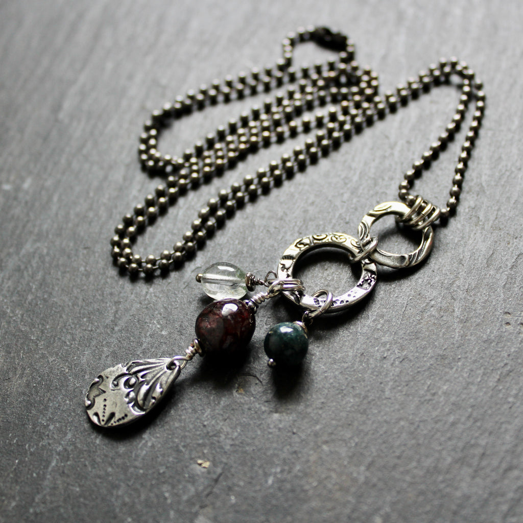 • Pendant is a collection of stamped pewter, quartz crystal with garnet and green agate nuggets