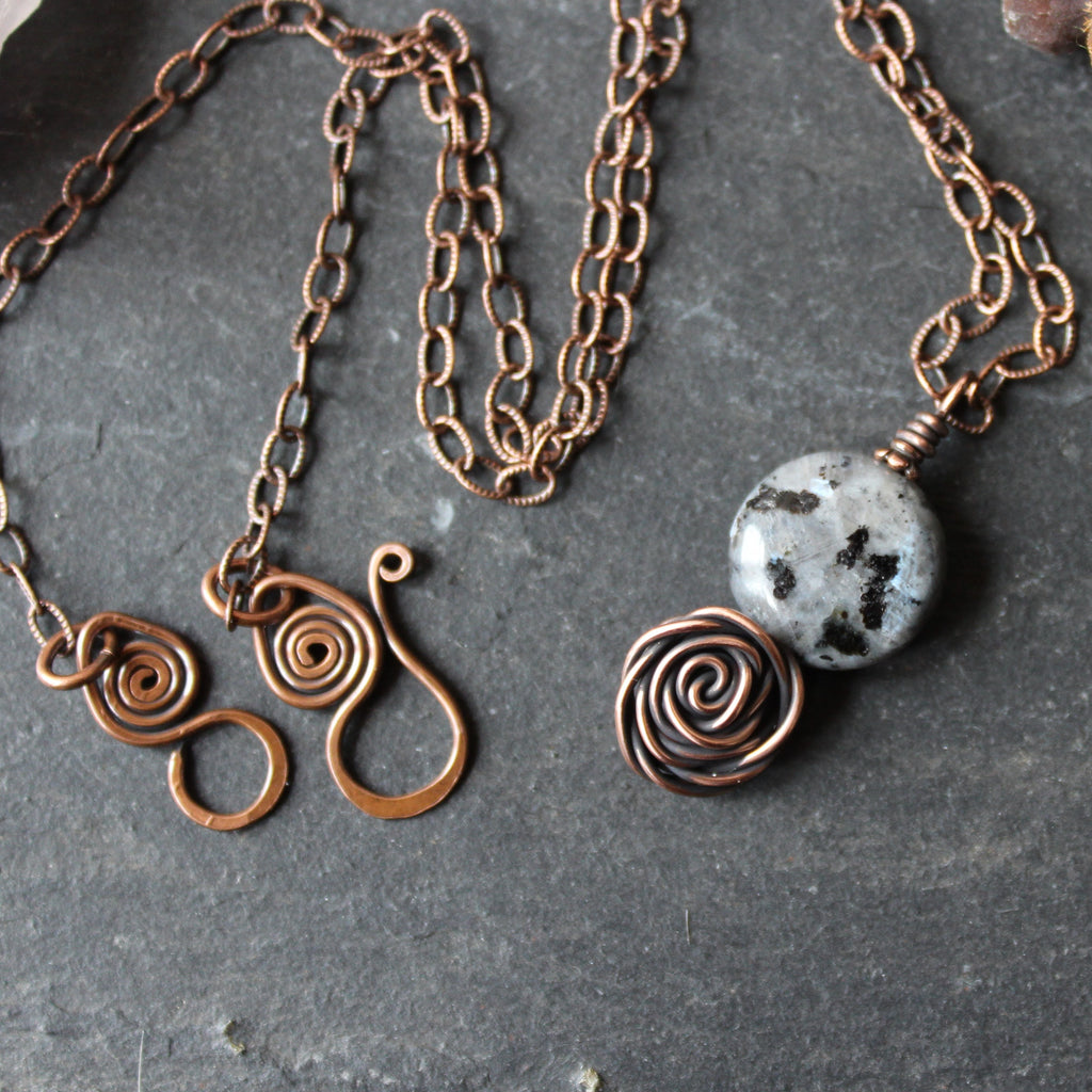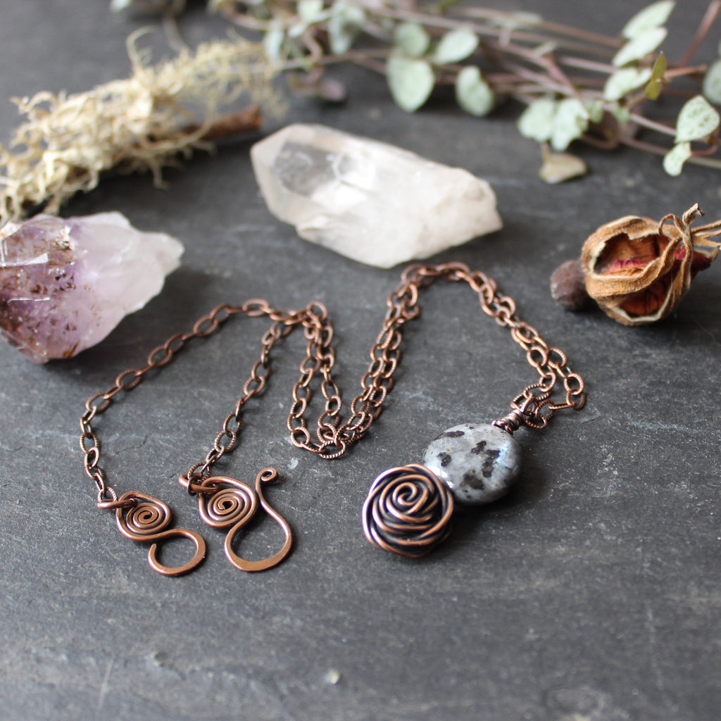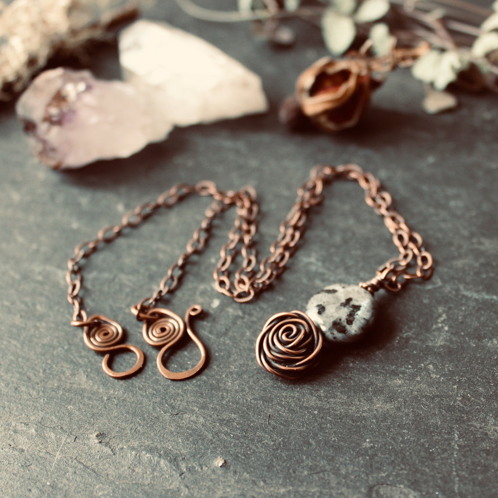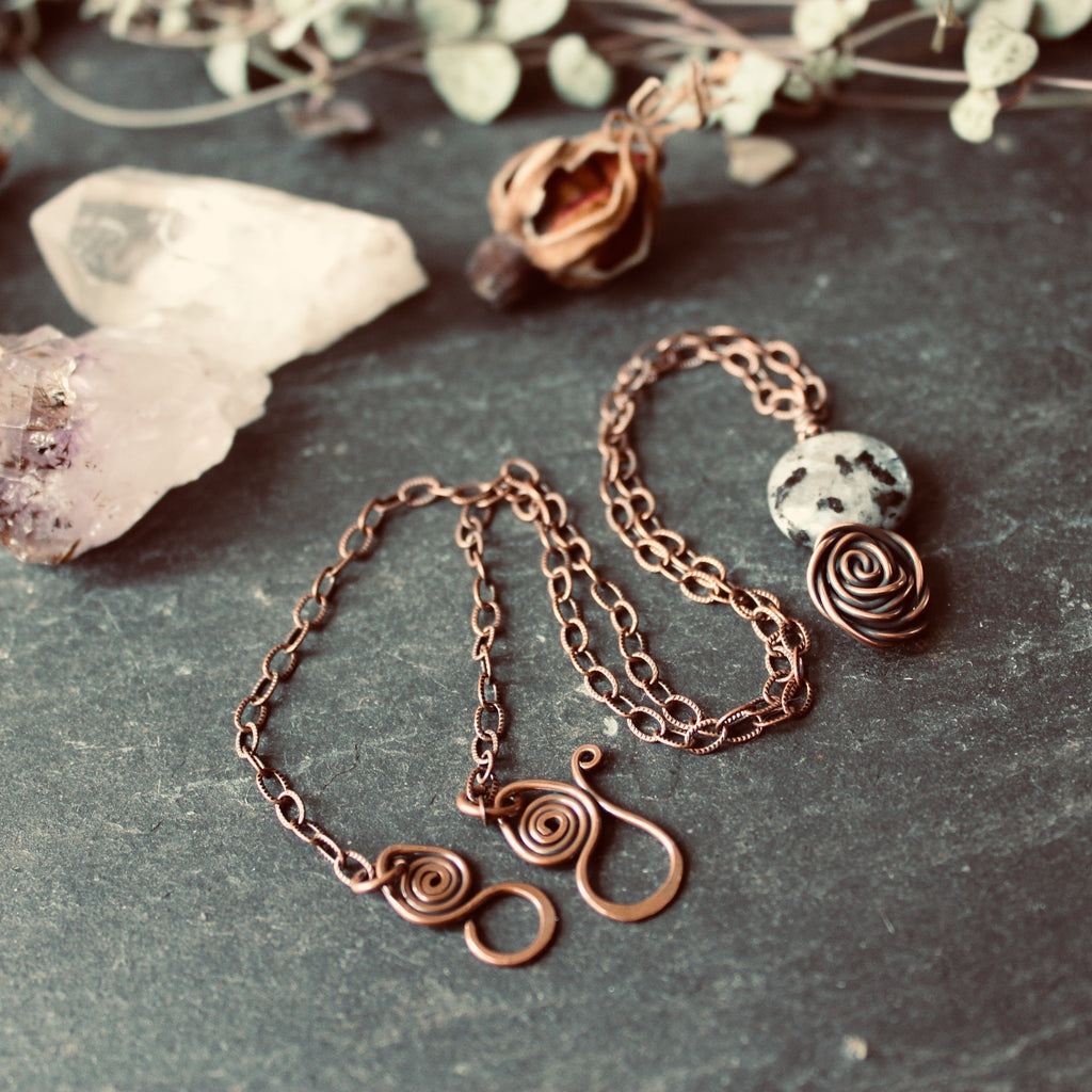 Glasgow Rose Cantrip Pendant Necklace with Larvikite Moon in Copper